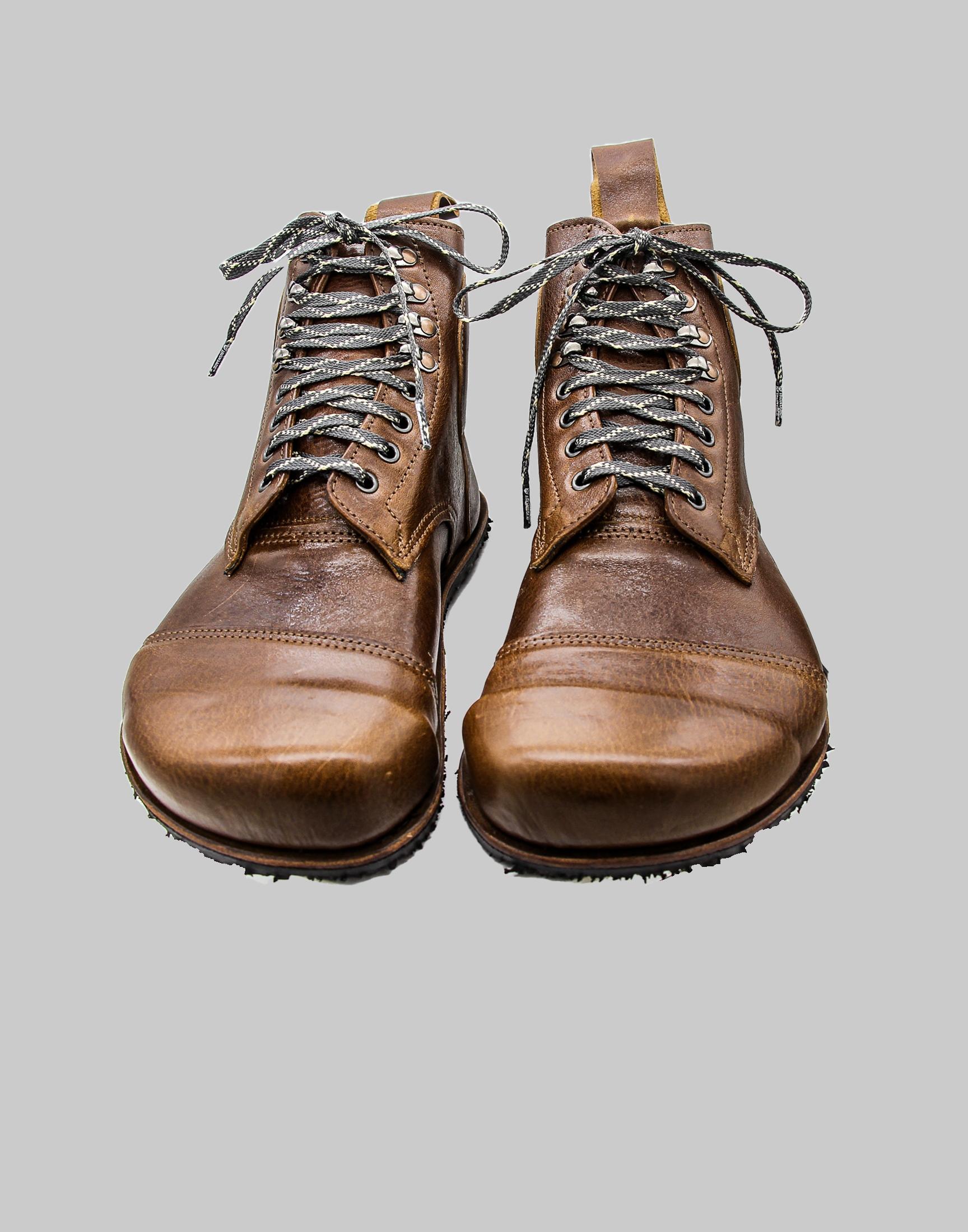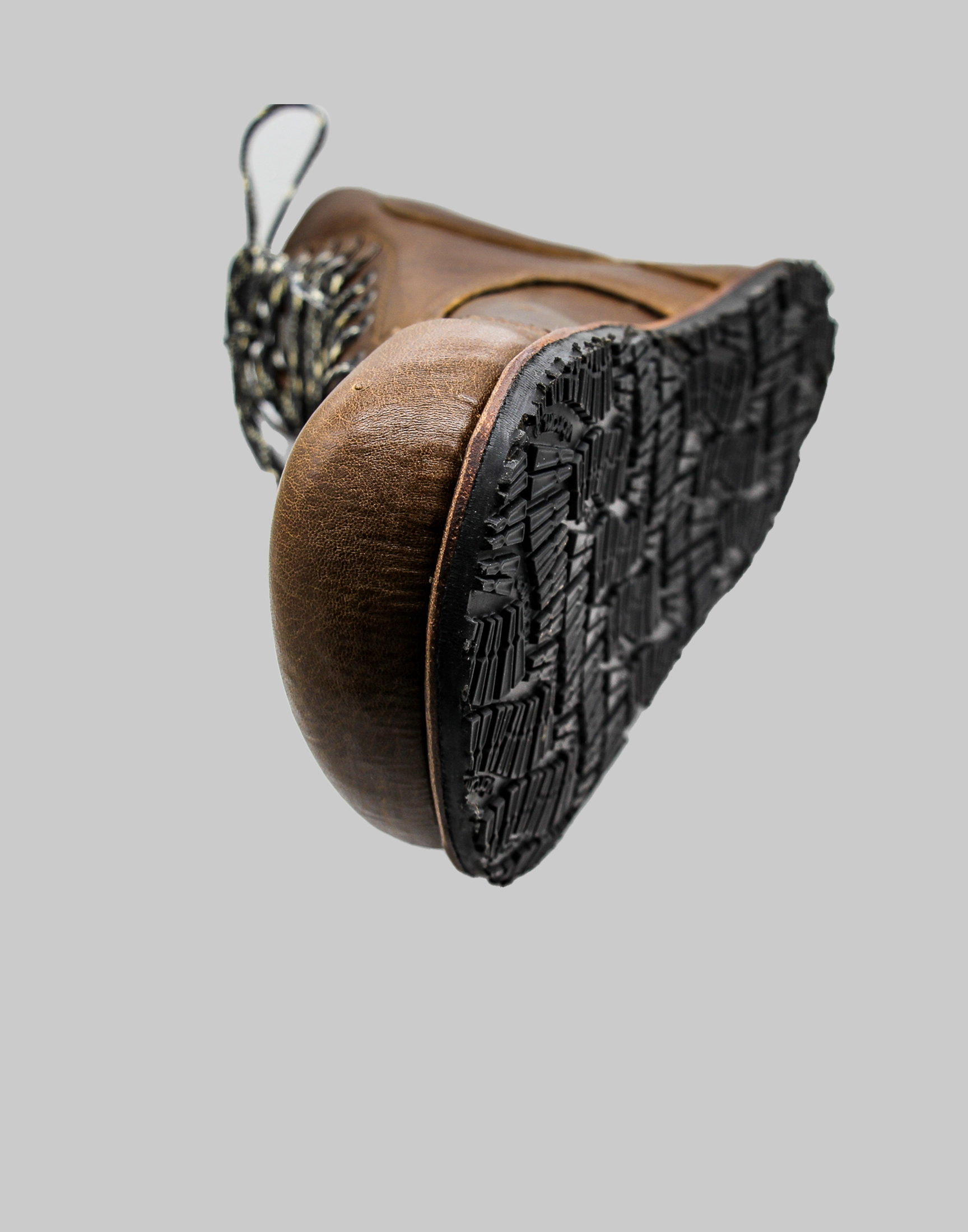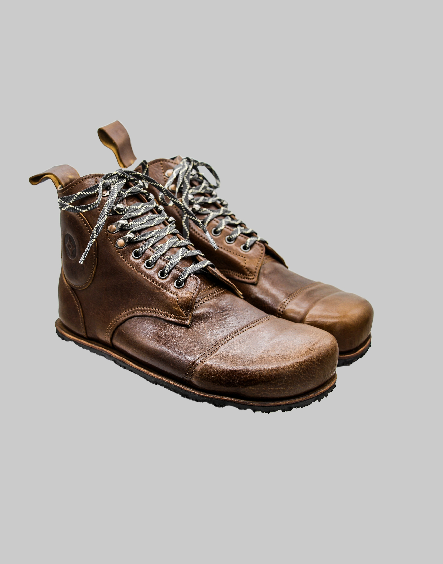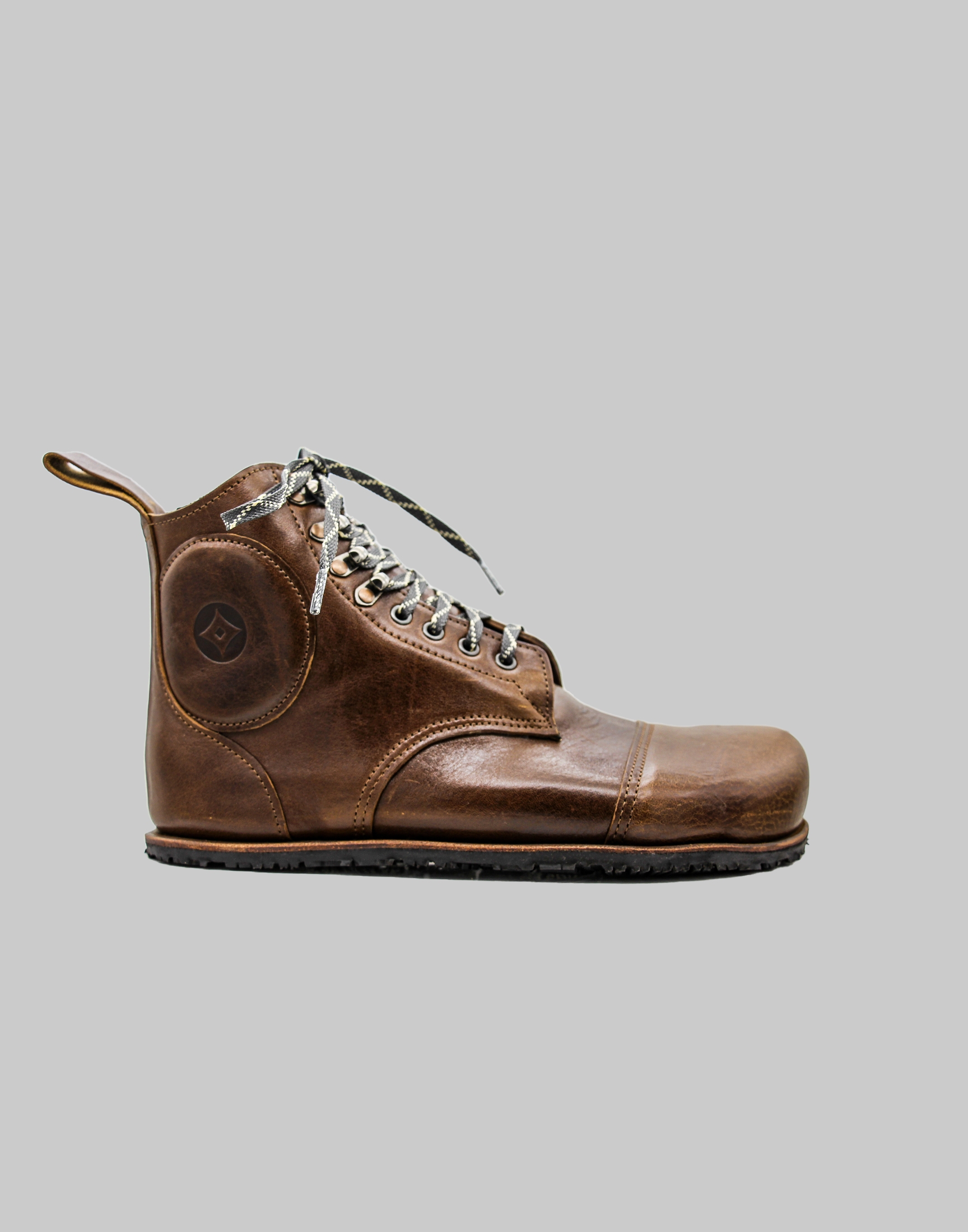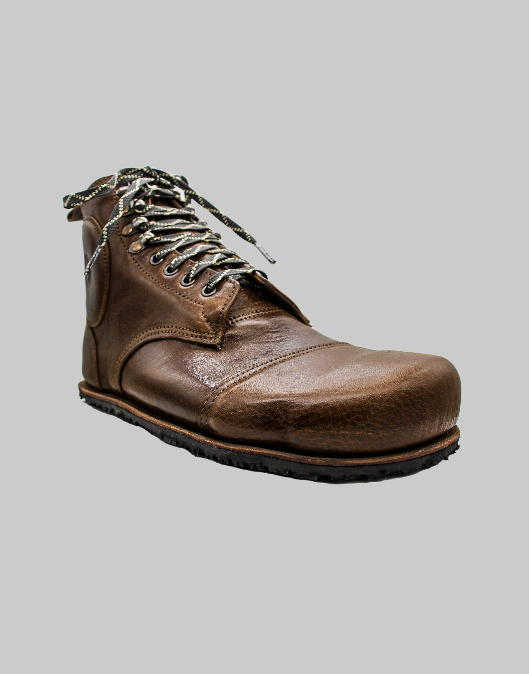 The bespoke pattern was created remotely using a 3D made-to-measure scan. Key features: veg tan leather, waterproof lining, cut resistant laces, padding for ankle and metatarsal, additional anti-shock padding for the heel and ankle, a 3D printed, impact resistant, carbon fibre toe cap made up of layers of epoxy. In addition, the boots have removable prosthetic thermal plastic ankle and heel protection for use when riding. The boots comply with all barefoot features; being flexibility, maximum width and toe splay and zero drop flat soles. Crafted to maximum specifications with customer.
