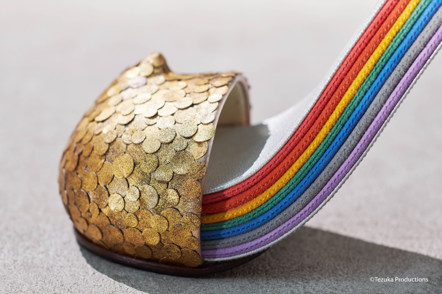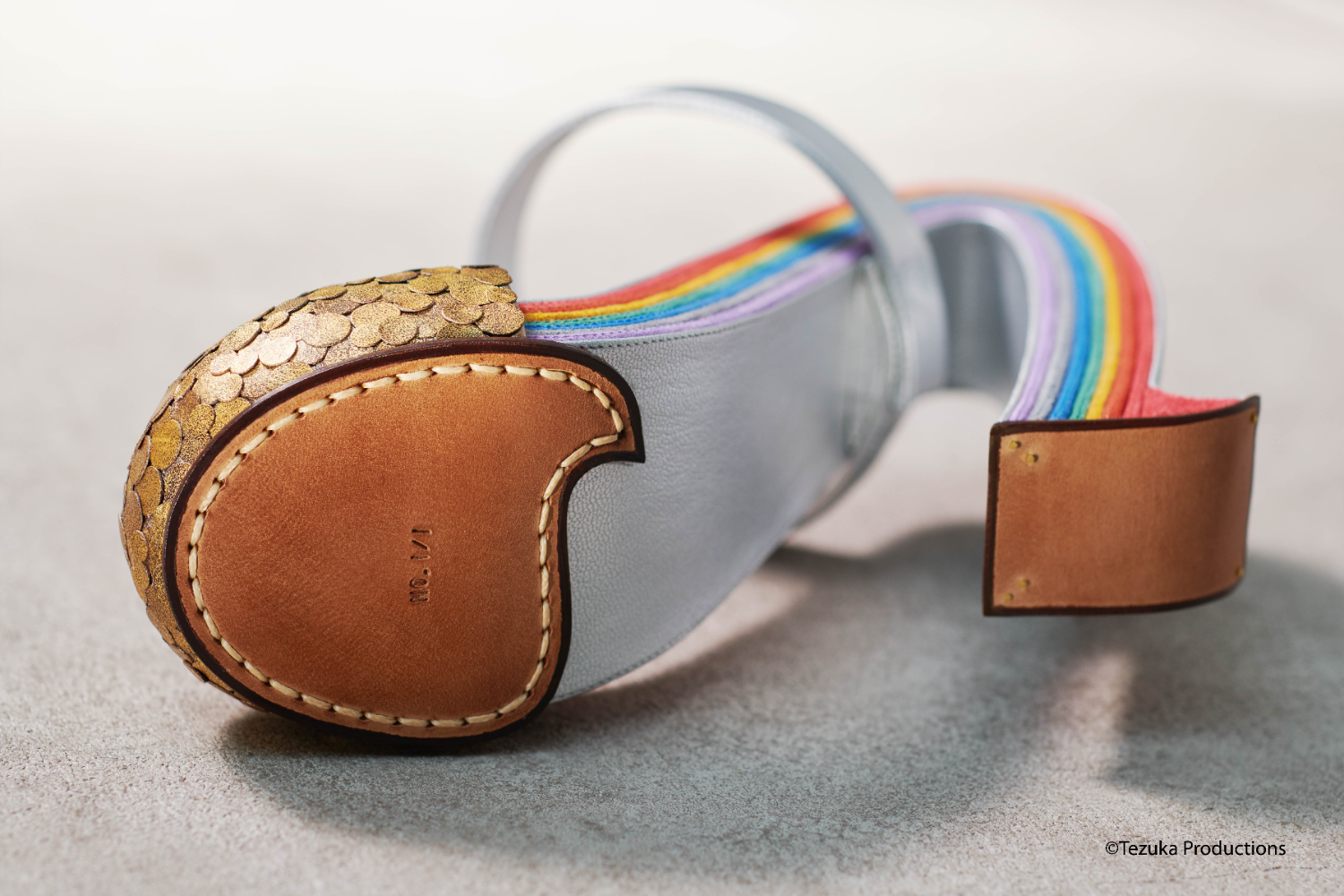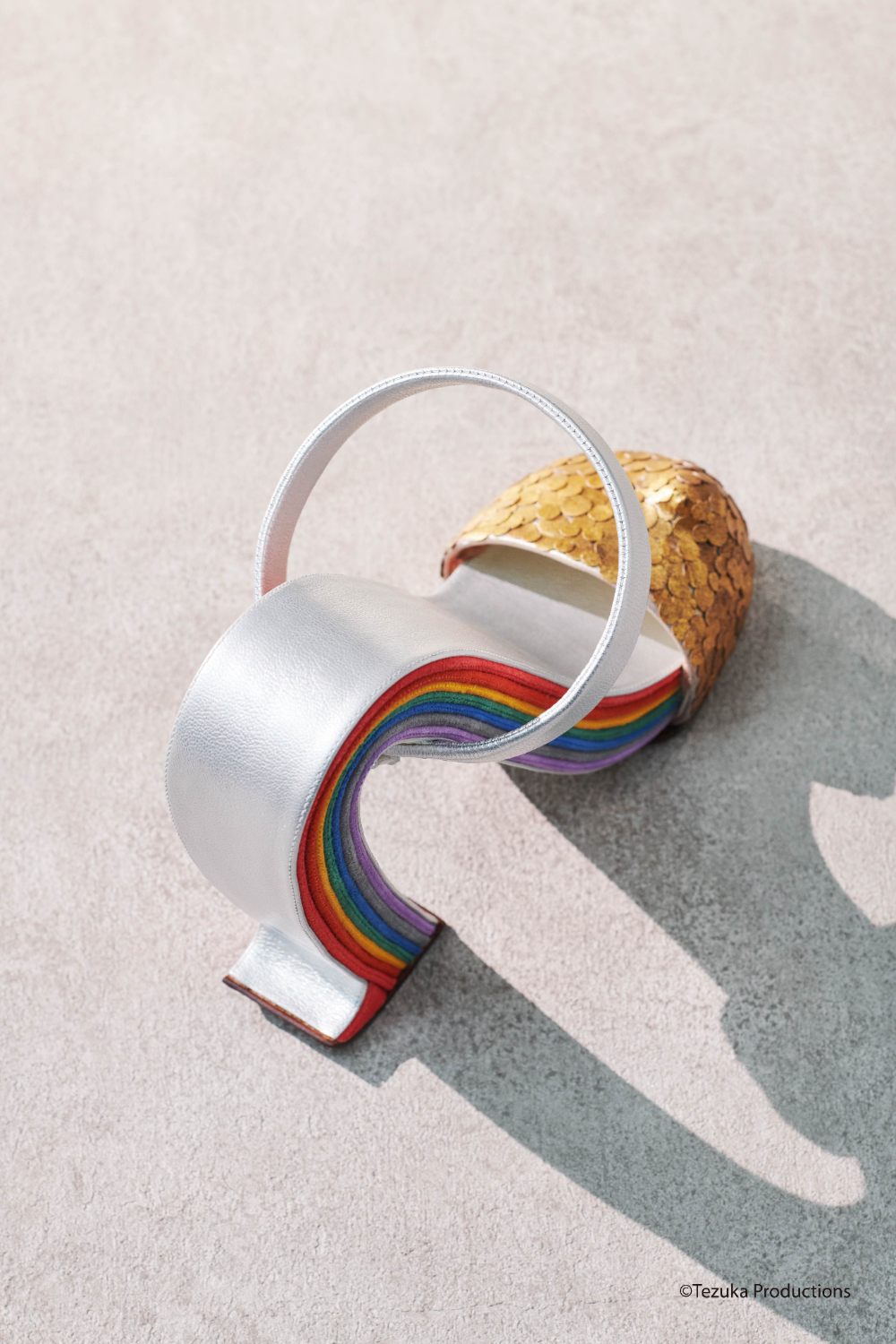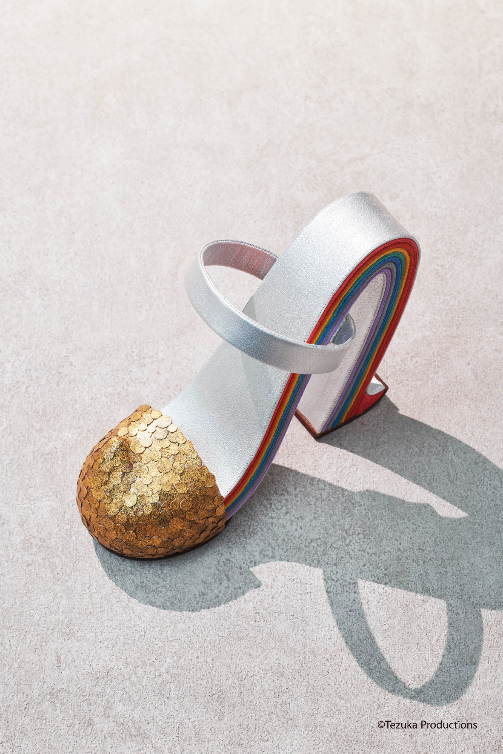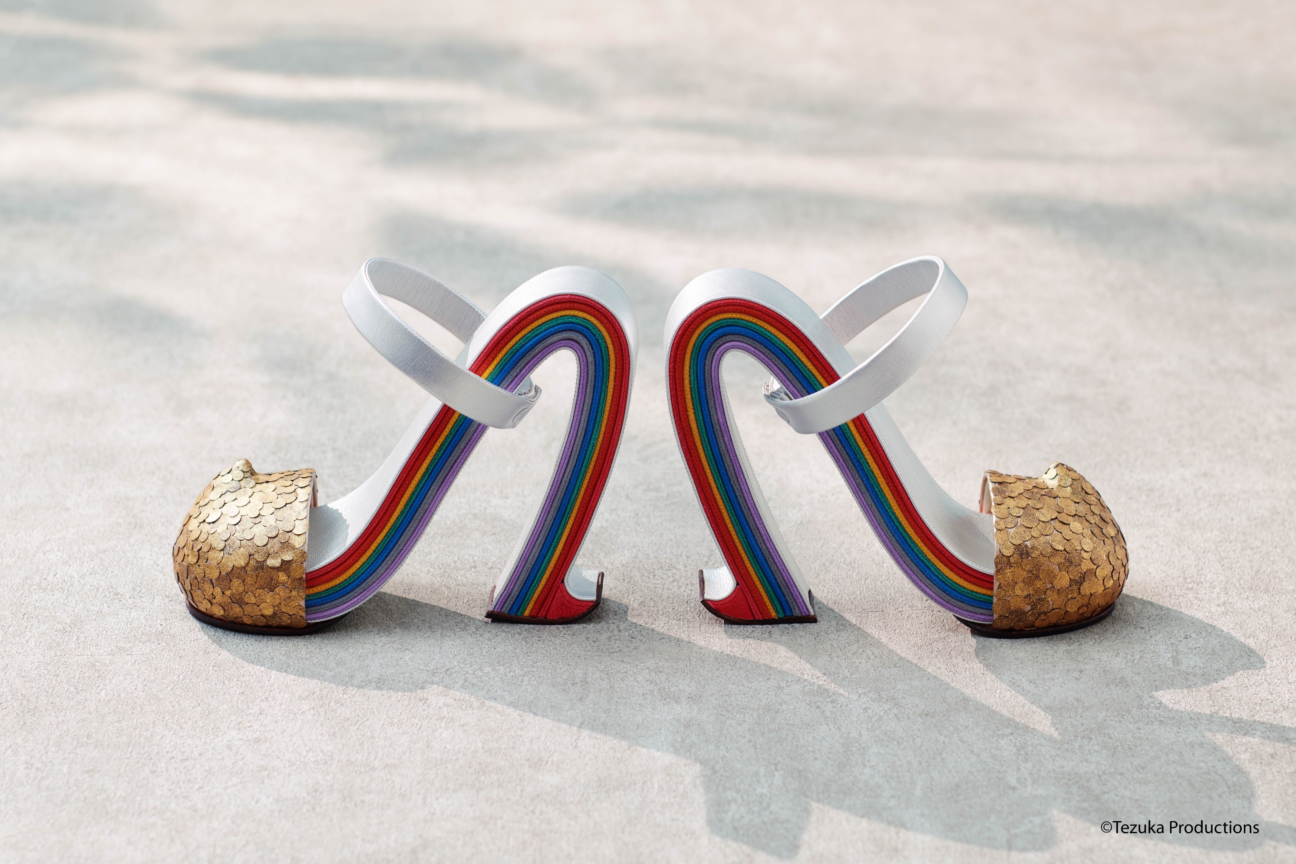 Misawa, who has been emotionally influenced by the Russia-Ukraine War, began the design after being inspired by an episode about a War in Astro Boy. Through the innovate form of the “A-Heel,” representing the A in Astro Boy, Misawa introduces a fresh contour. Furthermore, the rainbow color is also a reference to S. Ferragamo’s Rainbow Sandal. The rainbow is a symbol of piece. Misawa describes the shape of the Astro Heel as a bridge and hopes these shoes will become a bridge to peace...
