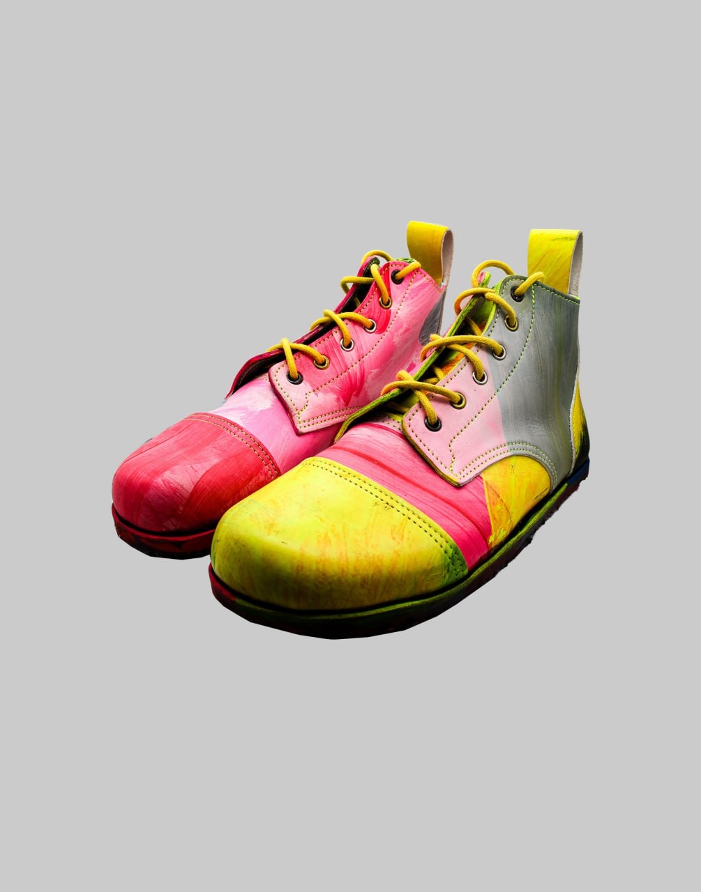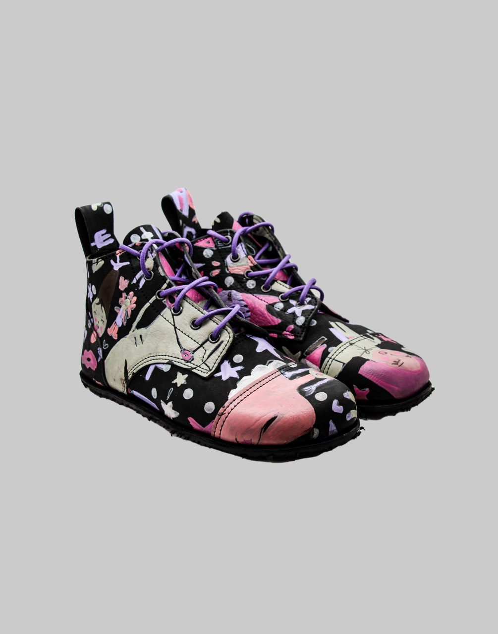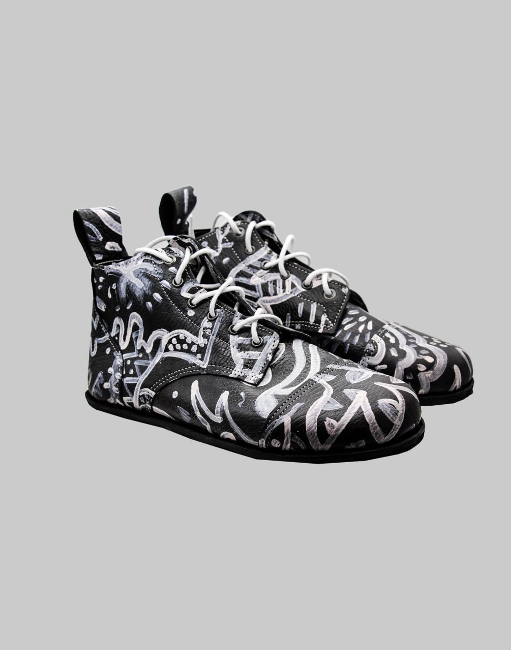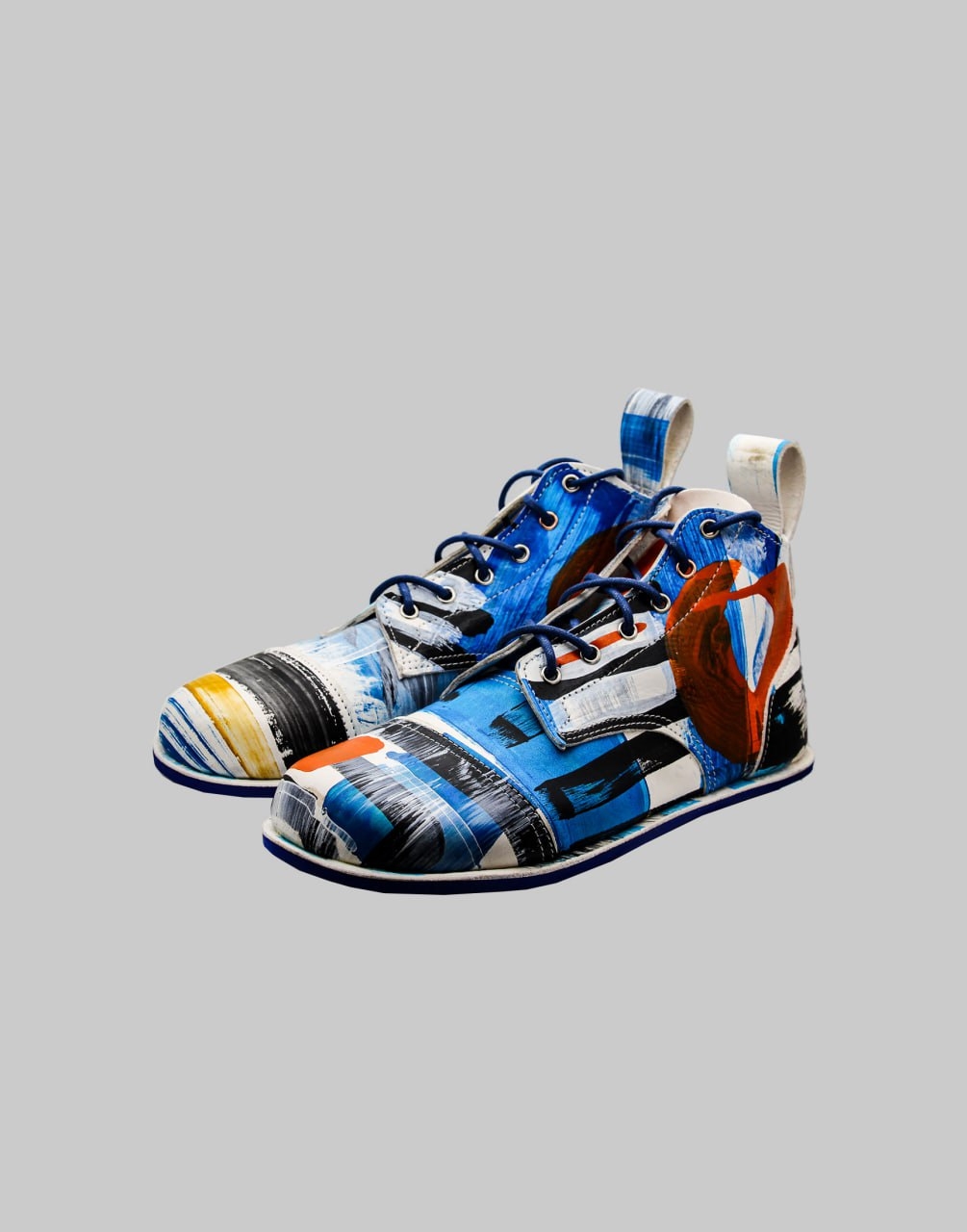 An artistic collaboration between Gaucho Ninja manufacturer of healthy, luxury Barefoot shoes and five artists. The artists painted directly onto leather hide with special paint and Lisandro created a unique one-off pair of Barefoot shoes from each artwork. Each pair of shoes an exquisite work of art created from a work of art. Lisandro crafted the shoes and each component to capture the essence of the artist and their work. Combining art, fashion and style the shoes were exhibited in an art gallery in Hay on Wye, UK. Each pair a chance to own a pair of barefoot shoes and a work of art in one.