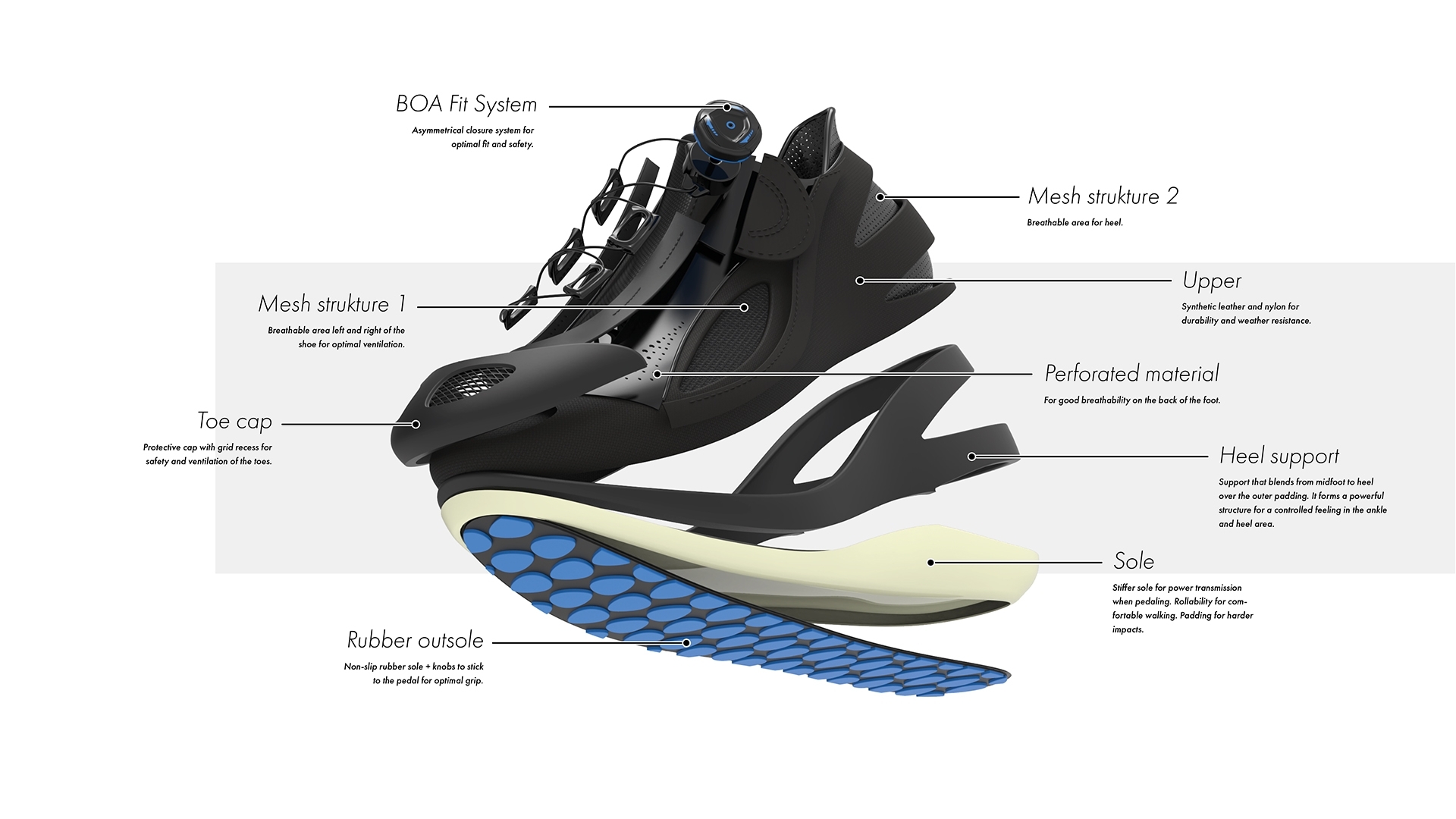 An allround cycling shoe for everyday use and uncomfortably hot days. This cycling shoe has great performance in mountain biking, free riding and fast riding. The sole is sufficiently stiff to provide improved power transmission while pedaling, but soft enough to be ideal for BMX and freeriding where one wants to feel the pedals under one‘s feet. With its stylish design, the shoe can be worn in daily life as a casual walking shoe.