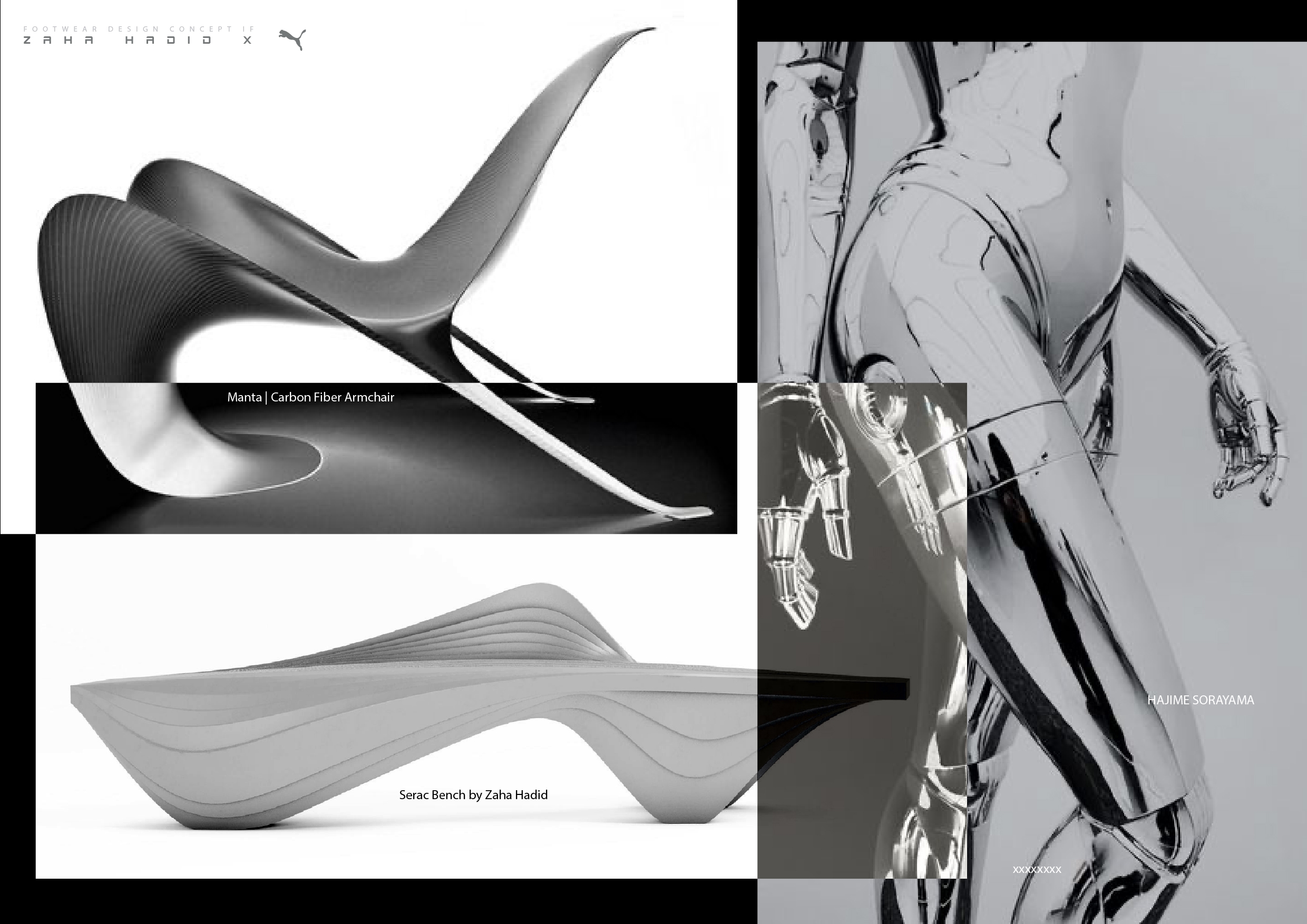 The Puma and Zaha Hadid collaboration (Conecpt) combines architectural innovation and sports performance. This partnership blends form and function, using cutting-edge technology and materials to create a footwear concept that symbolizes the future of shoe design.