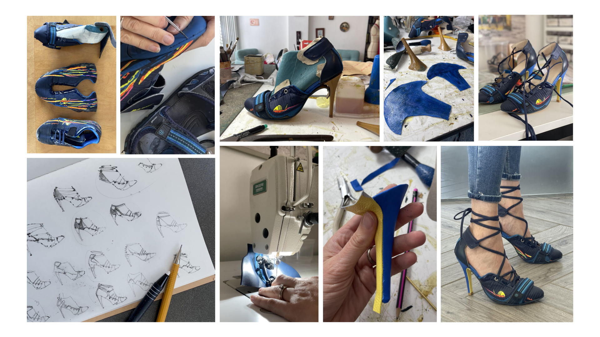 These vibrant pumps are an exercise in repurposing kids shoes. Children outgrow their footwear crazy fast. But unlike clothes, shoes are rarely passed down. Seeing these colorful, but discarded items pile up in my own home, activated me to collect and transform these, still appealing items. Slowing down the life cycle of our wardrobe. This footwear is created from (size 32) sport shoes and sandals. After disassembly, the pattern pieces are restored, altered and reconfigured to become a unique piece. Turning it into a colorful reminder of a much loved object. This is the first pair in a series.