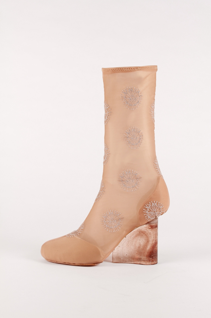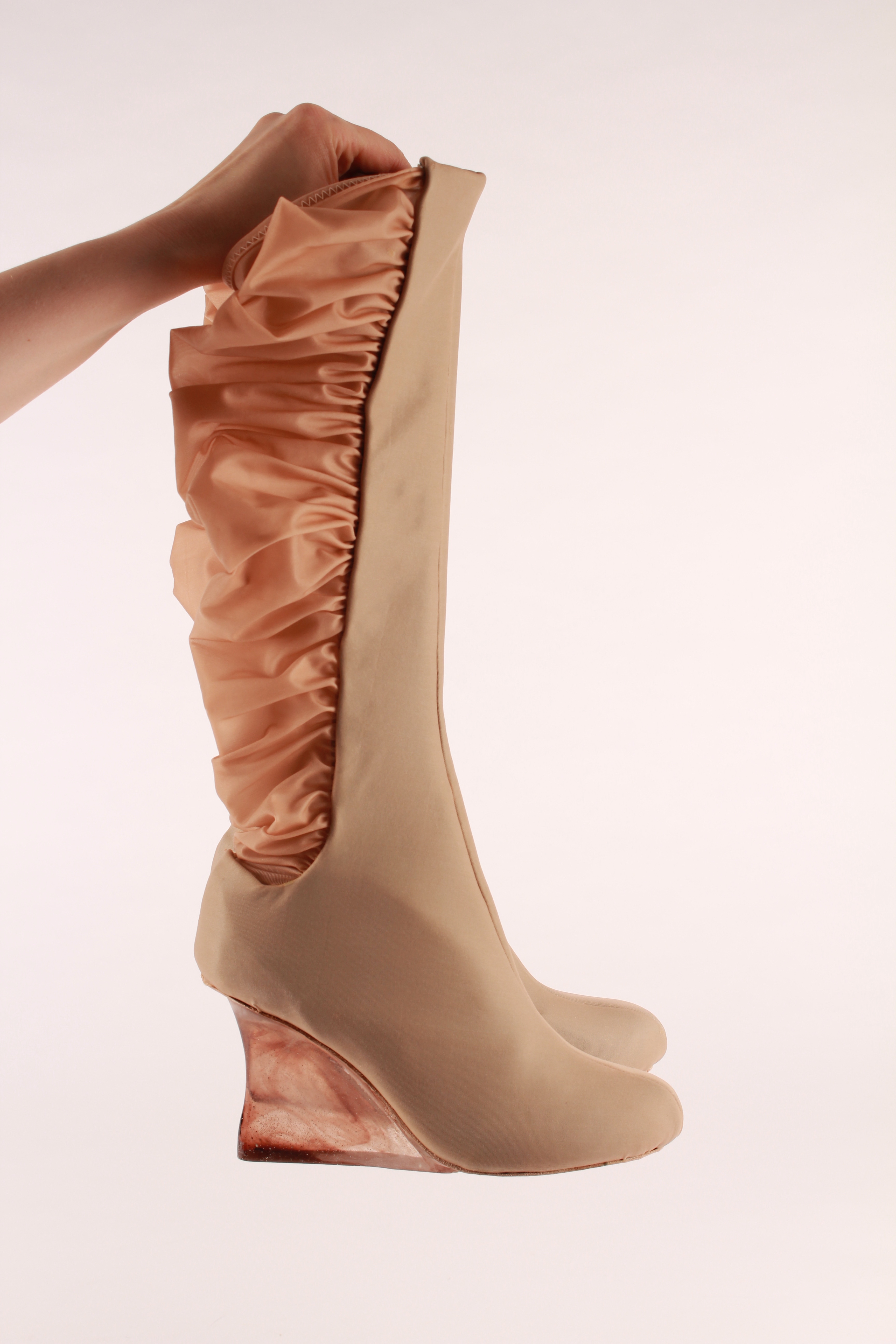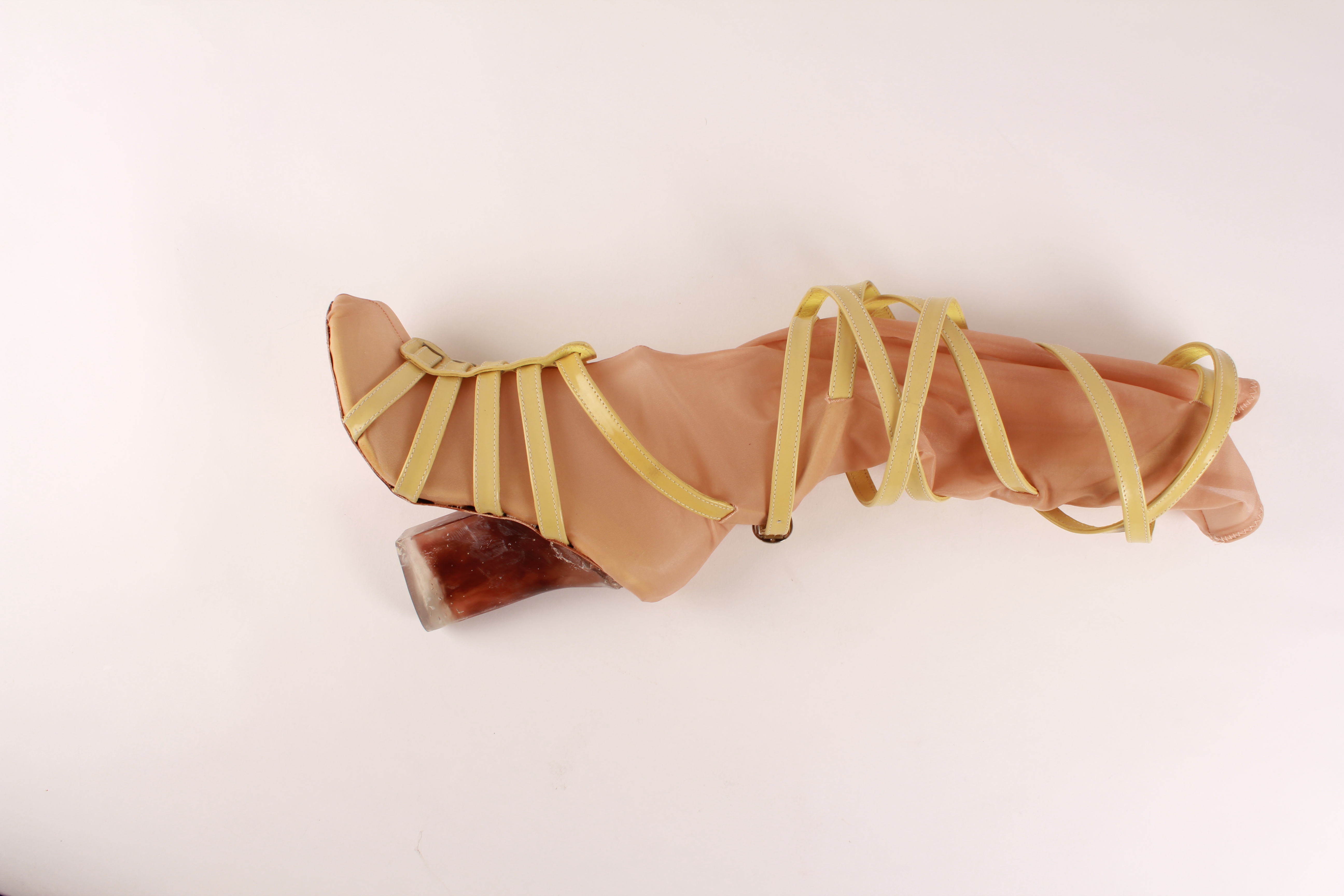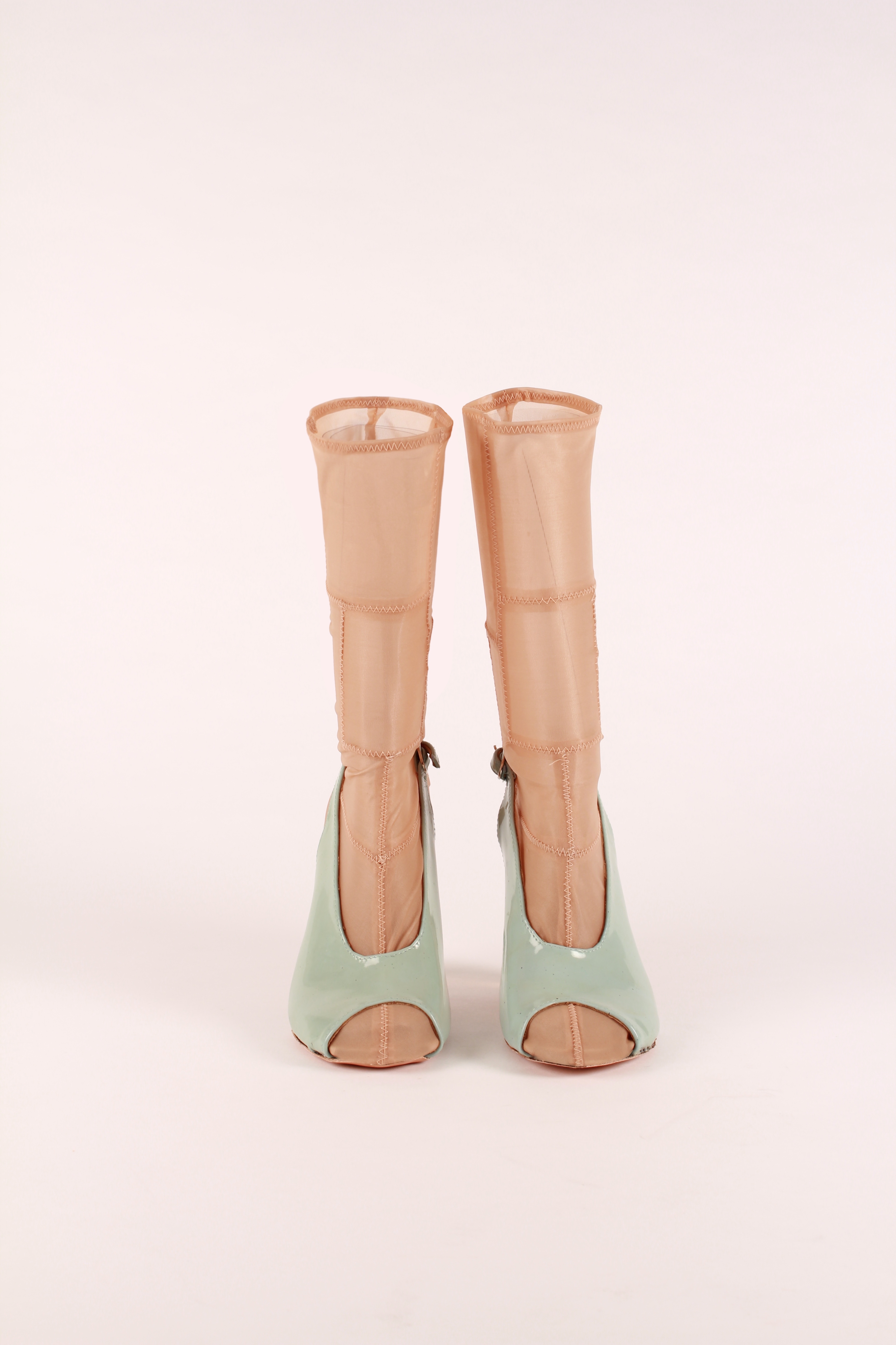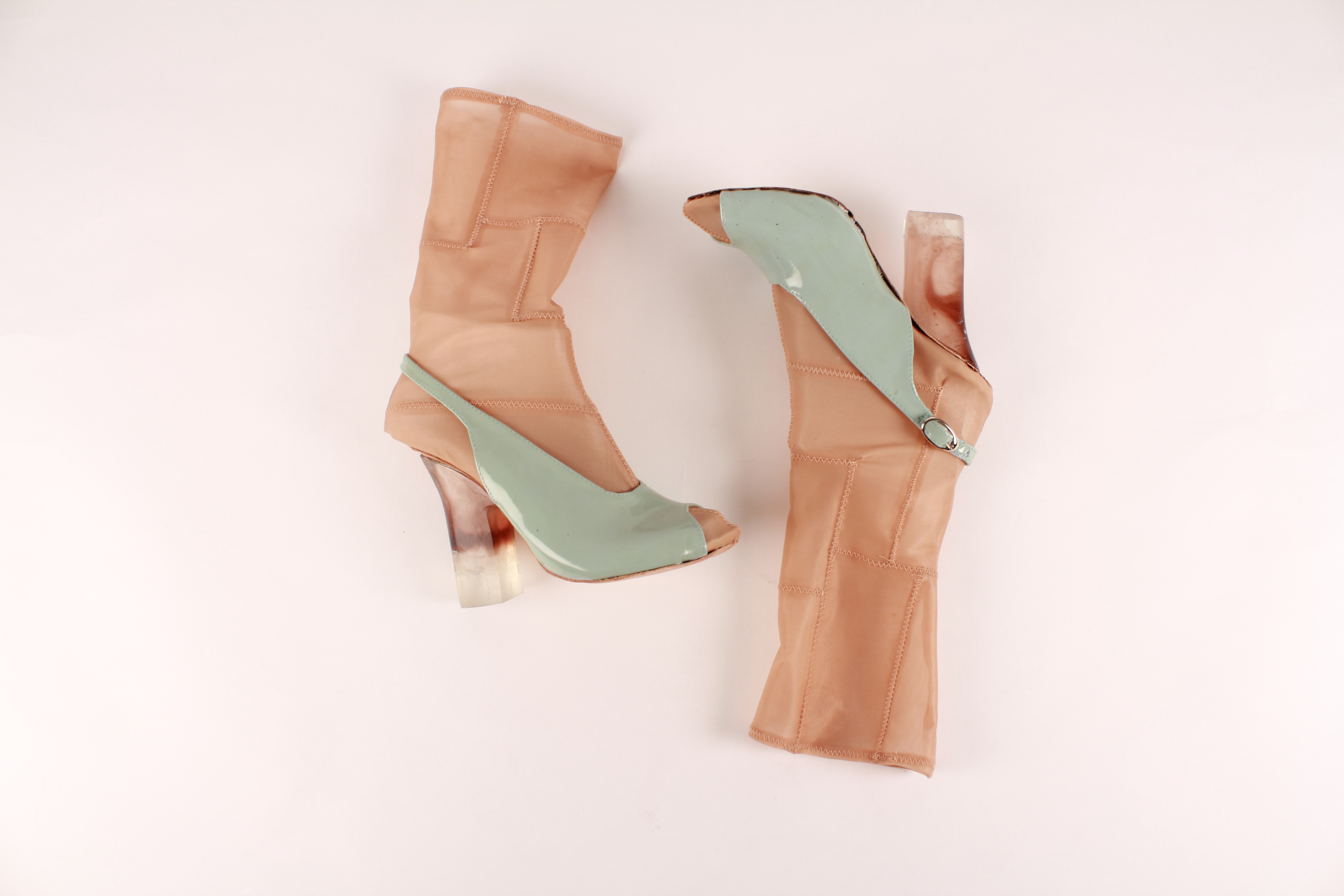 Materials: Nylon jersey, vegetable tanned leather and discolored patent leather, epoxy heels