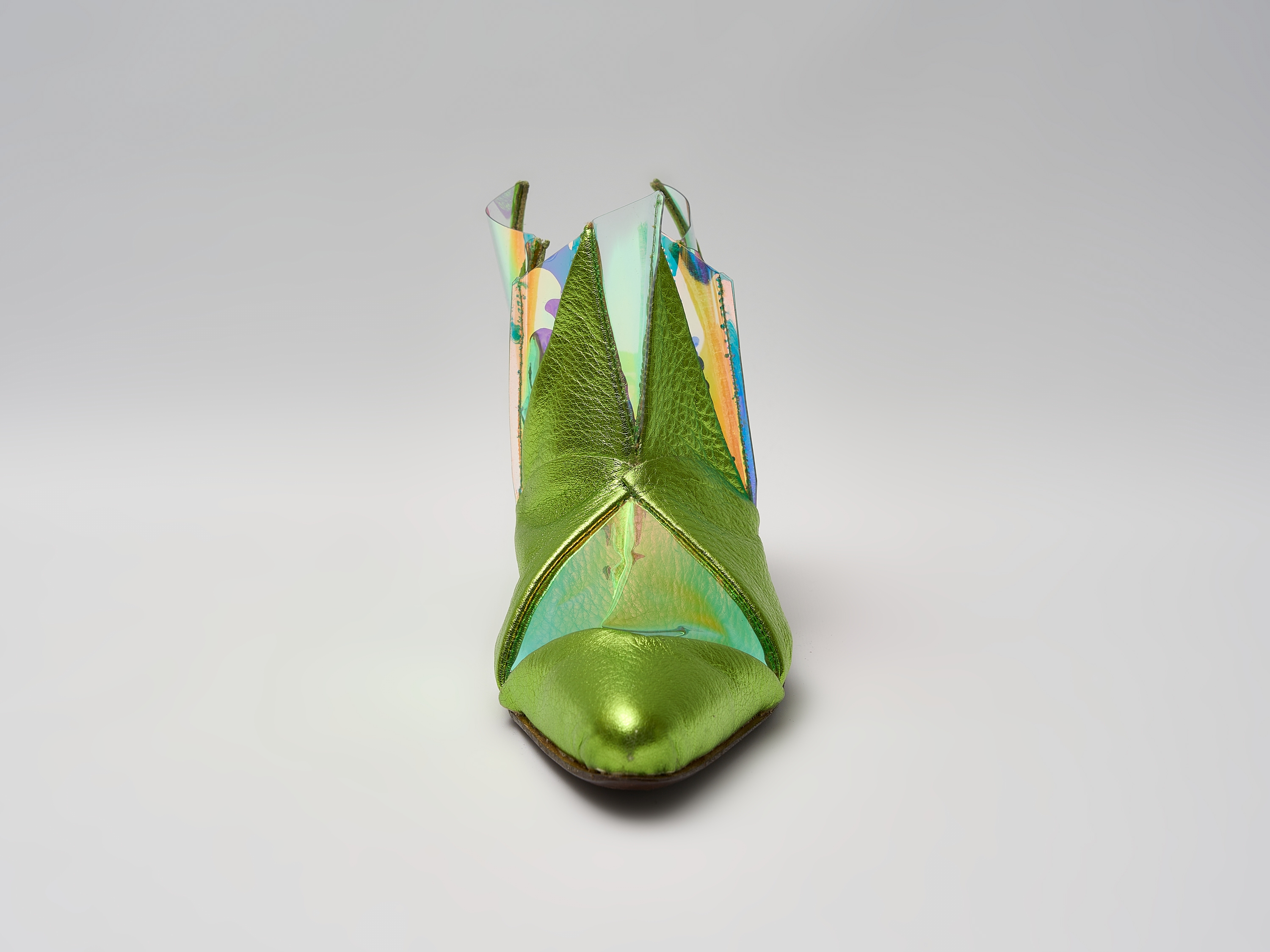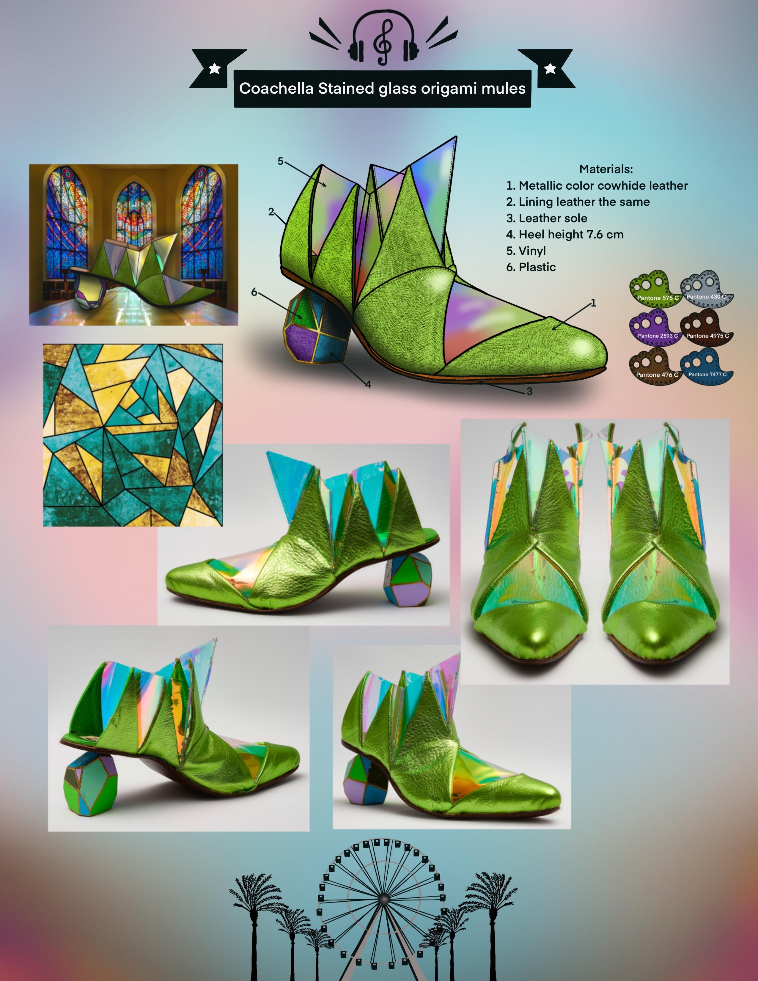 Being a fan of the Renaissance, I decided to create shoes that would be reminiscent of my favorite period in the history of art. I chose the origami technique and decided to associate the design with the art of stained glass, which received a new breath in the Renaissance due to changes in glass manufacturing technologies for stained glass. This creates the best impression that this shoe design belongs to the Renaissance, but already in a modern reading.