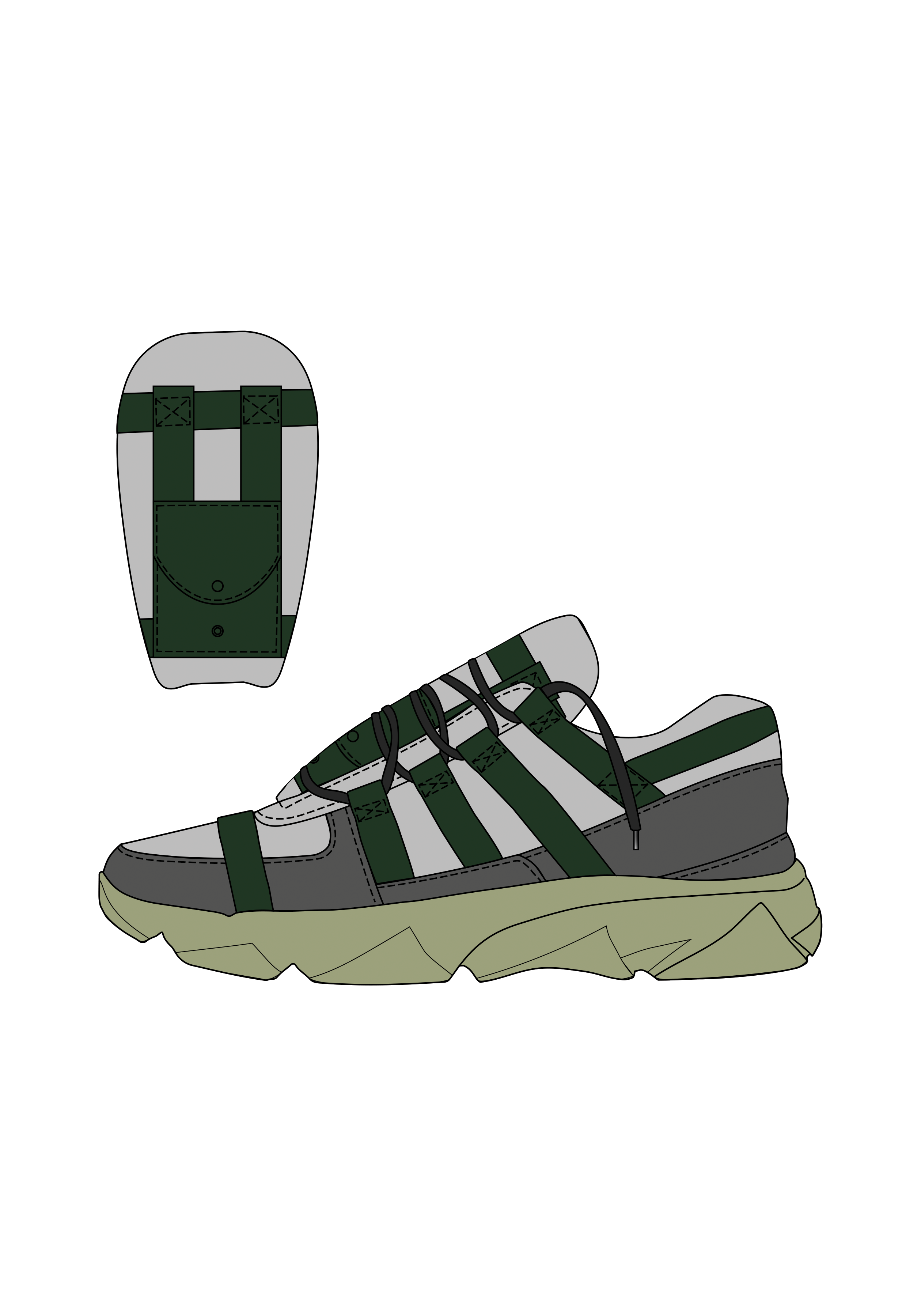 Inspired by the stories of the Garden of Eden and the military 'Gillie Suit,' my journey culminated in the creation of my very first manufactured shoe. This sneaker served as my canvas for navigating the intricate intersection of commercial appeal and an emotionally resonant design connection, all while striving for a harmonious balance across the multifaceted landscapes of design. Throughout this process, I embraced various stages, from design and fabric selection to refinement and finishing touches. Utilizing Gravity Sketch and following a meticulous tech-pack.