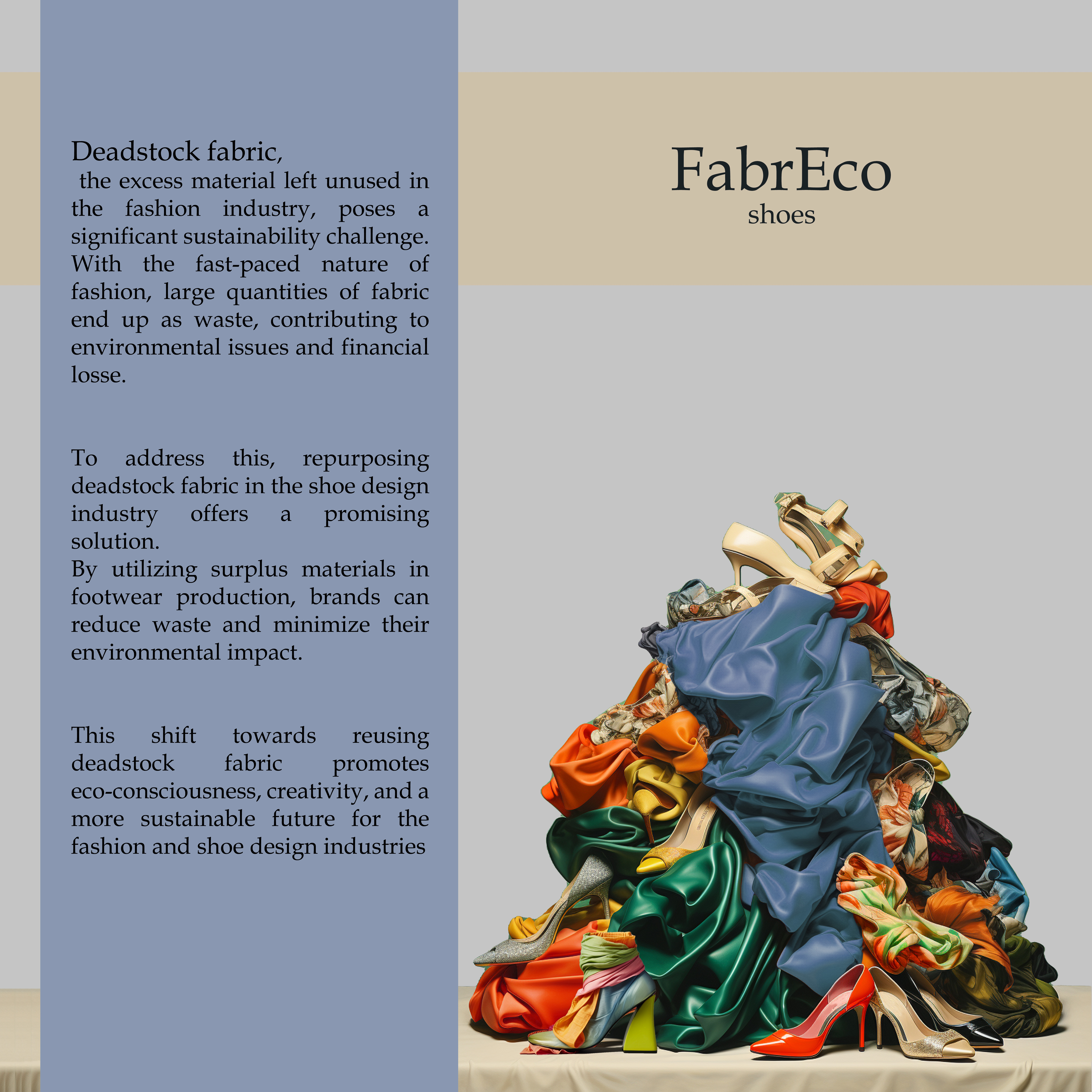 Introducing "FabrEco" - a sustainable high heel that epitomizes elegance. Crafted from deadstock fabric, it embraces eco-consciousness with style. Versatile and chic, it effortlessly complements any outfit, making it a must-have in every fashionista's wardrobe. Step into a world of sustainable luxury with "FabrEco" where fashion meets conscience.