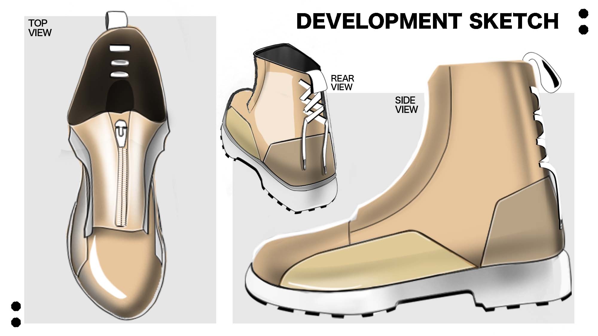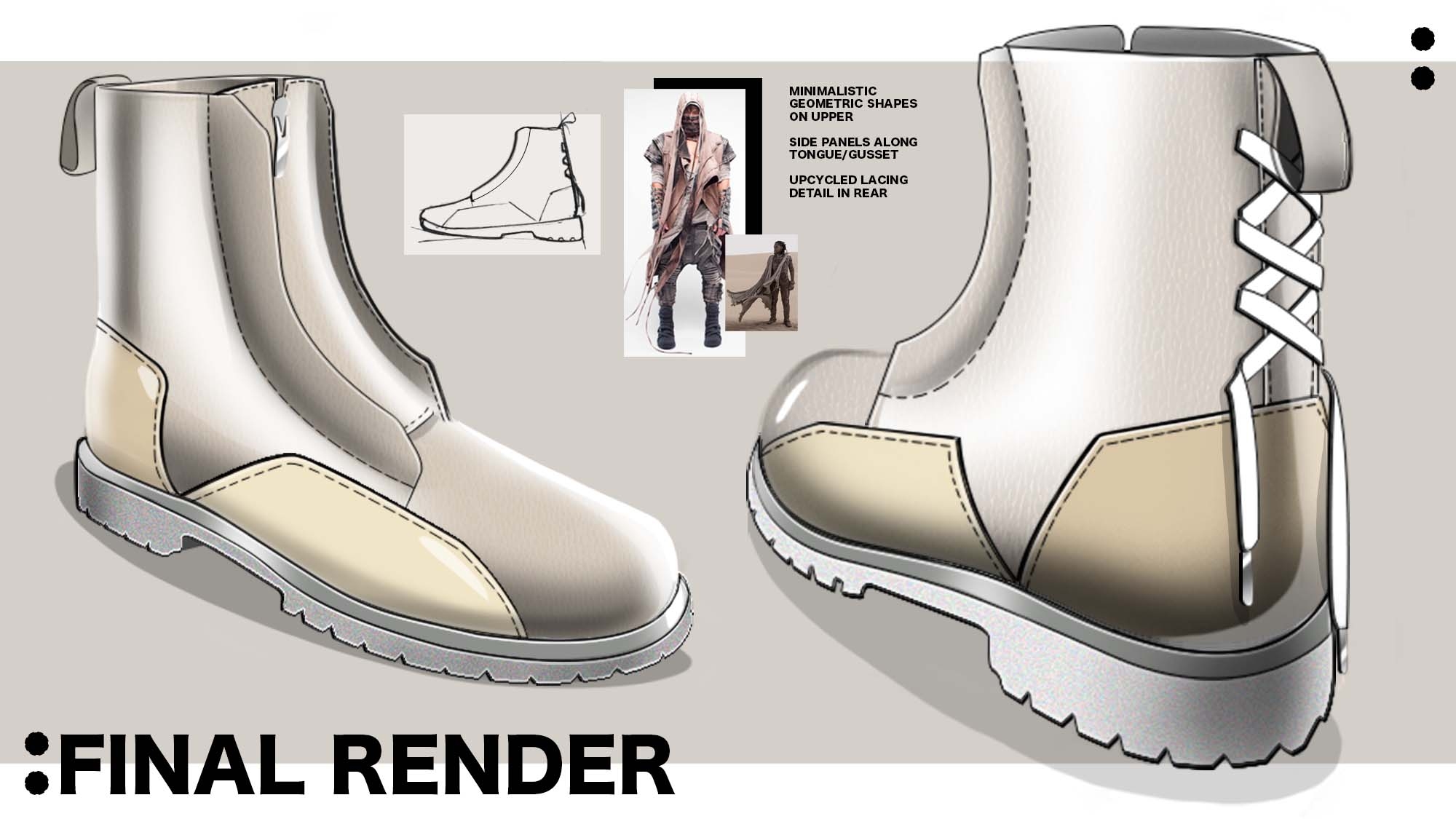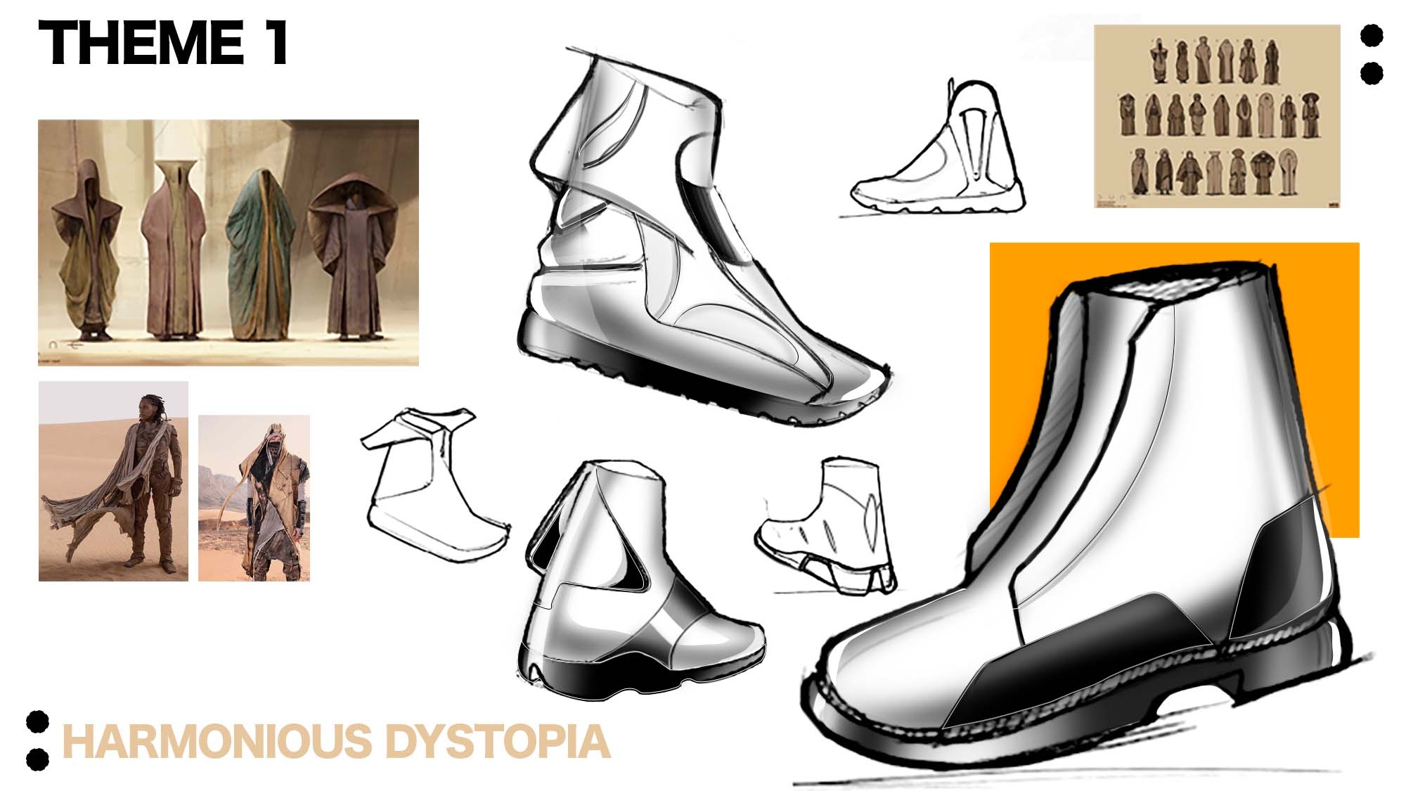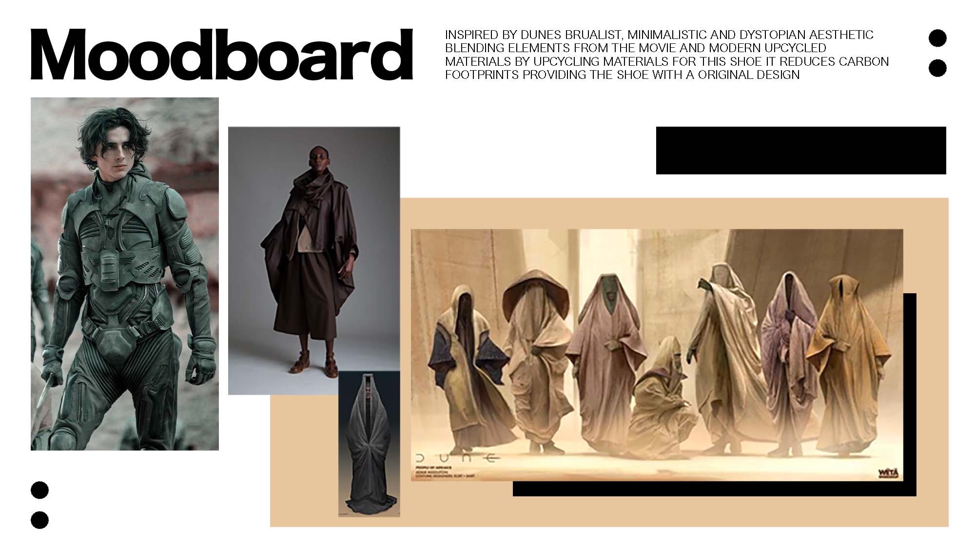 INSPIRED BY DUNES BRUTALIST, MINIMALISTIC AND DYSTOPIAN AESTHETIC BLENDING ELEMENTS FROM THE MOVIE AND MODERN UPCYCLED MATERIALS BY UPCYCLING MATERIALS FOR THIS SHOE IT REDUCES CARBON FOOTPRINTS PROVIDING THE SHOE WITH A ORIGINAL DESIGN