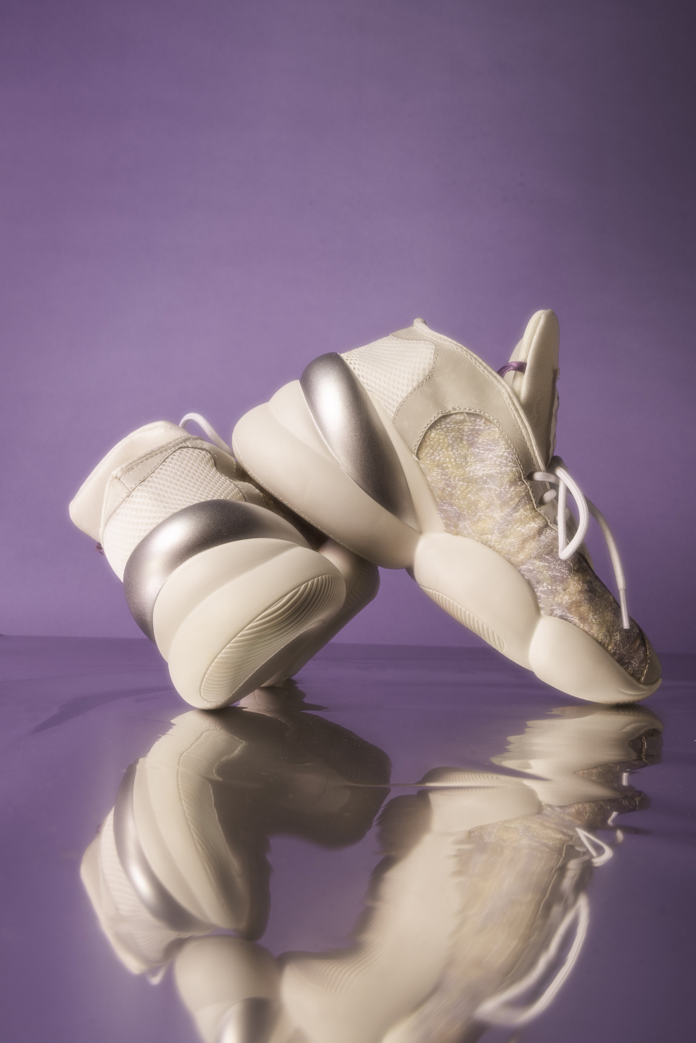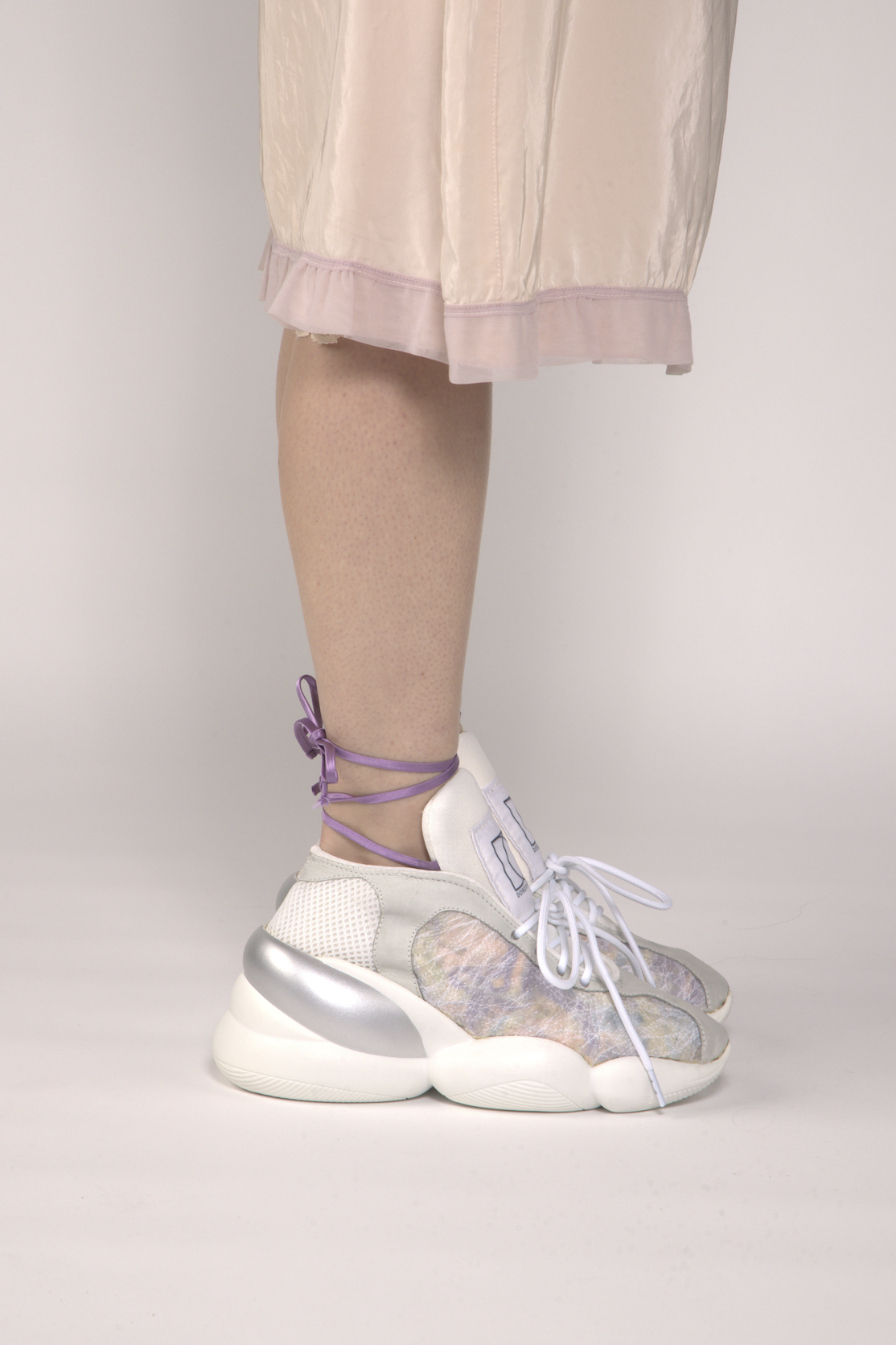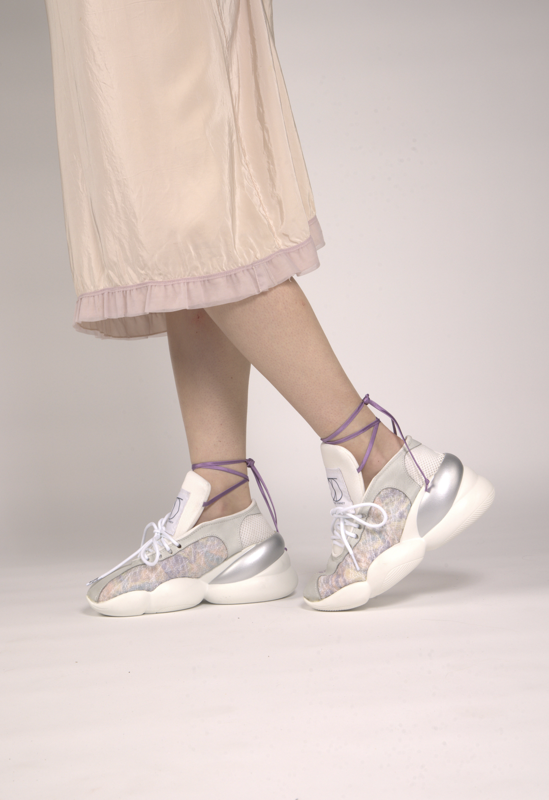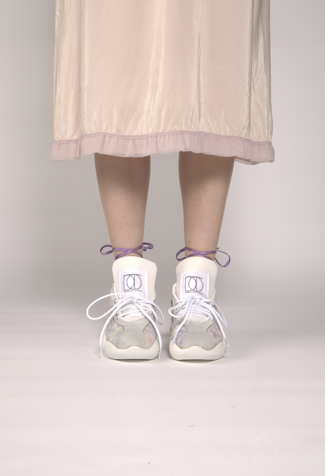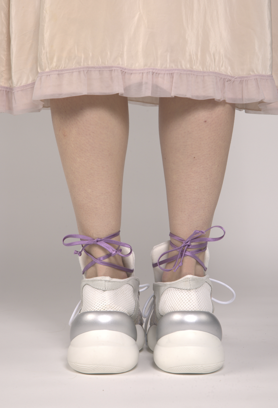 The title of this collection "Daydream" alludes to the color and form inspiration of a sweet dream while also establishing that the sustainable materials used are hopefully a glimpse into tomorrow. For this collection, I aim to combine the color palette and the forms inspired by sweet dreams while creating an emphasis on sustainability. This sneaker, Bonnie, is full of excitement and wonder. Her juxtaposition of textures along with unique design features, such as the wrap-around ankle strap, make this sneaker the perfect companion for adventure.