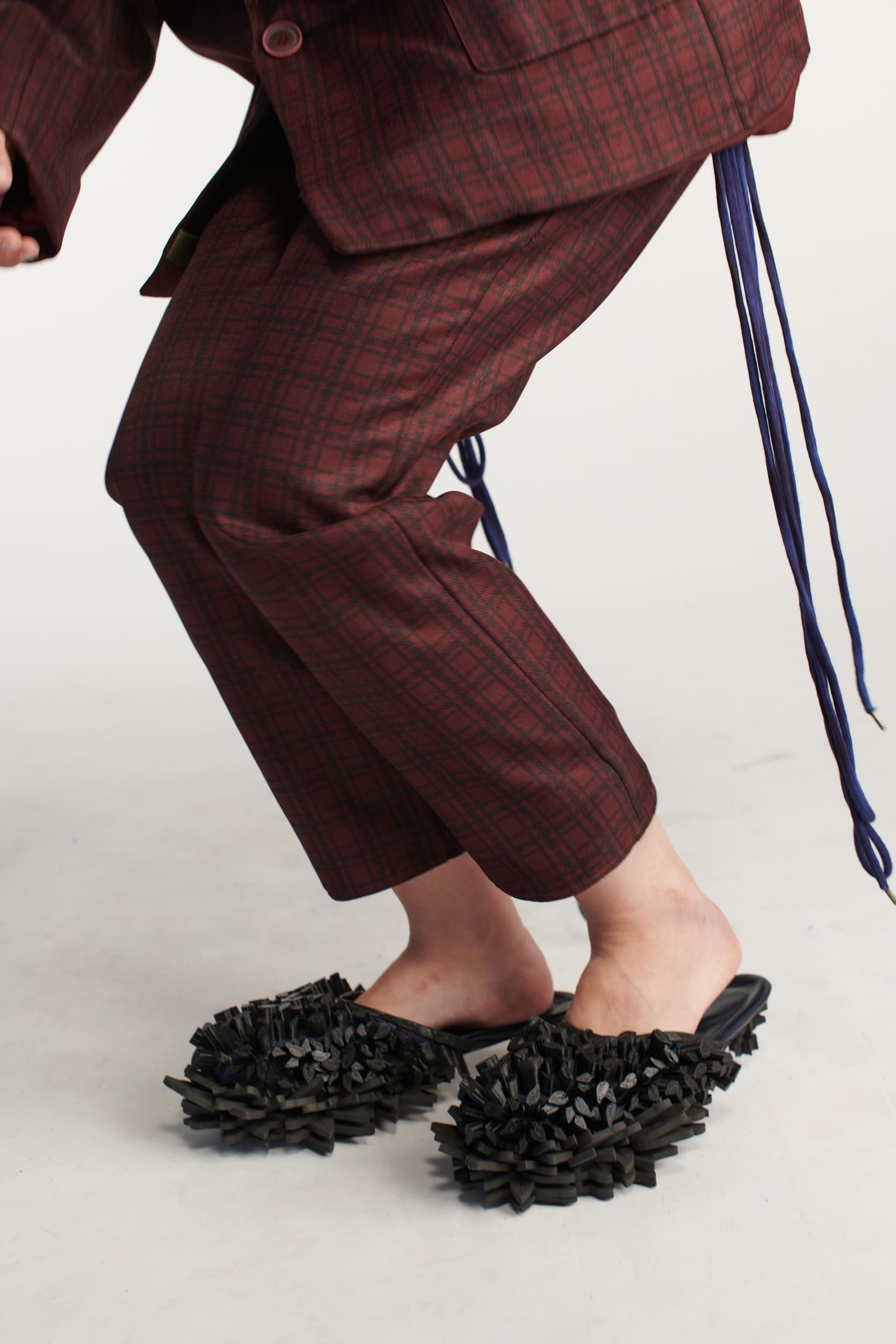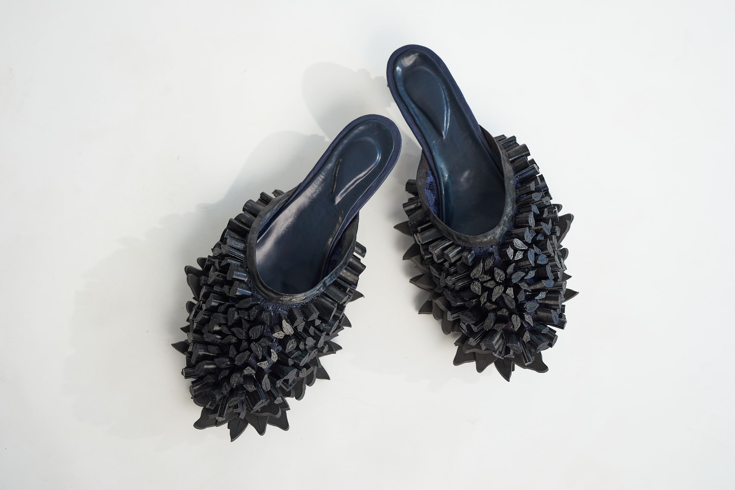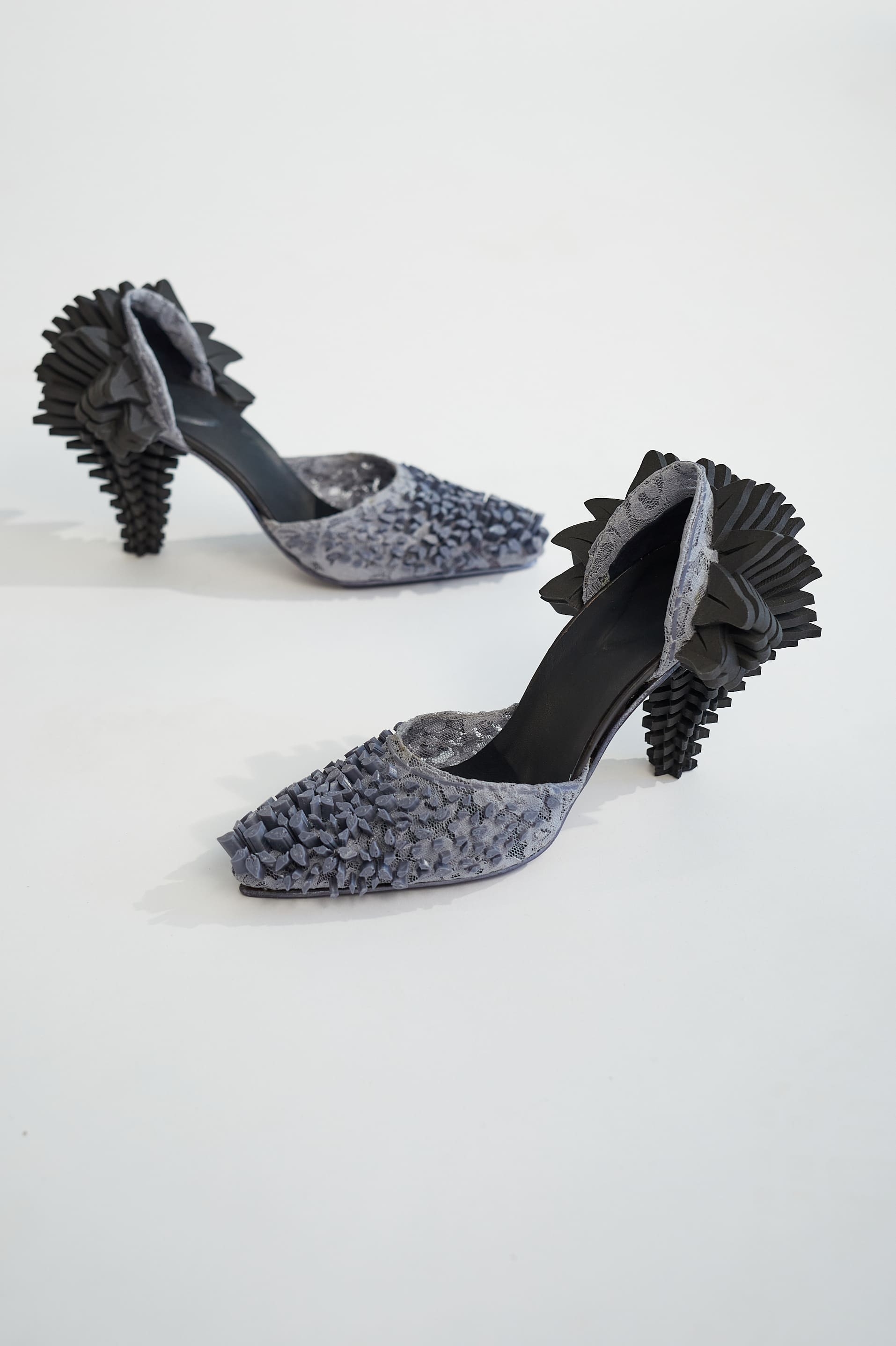 the softness in the shapes of the flower and the lace. the stiffness expressed in different shapes of the heels and the choice of materials.