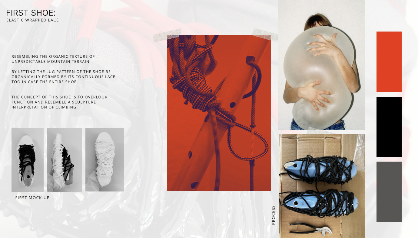 The concept of this shoe is to overlook function and resemble a sculpture interpretation of climbing.