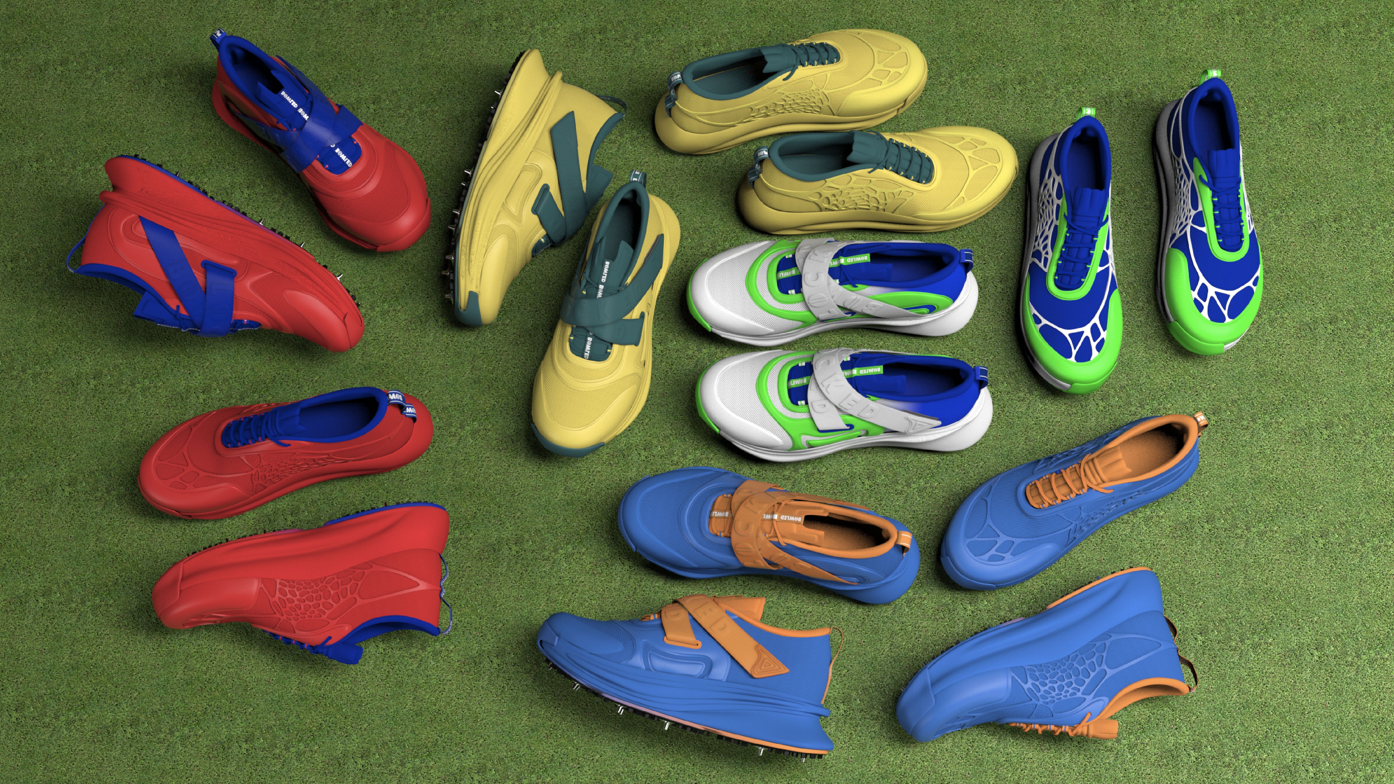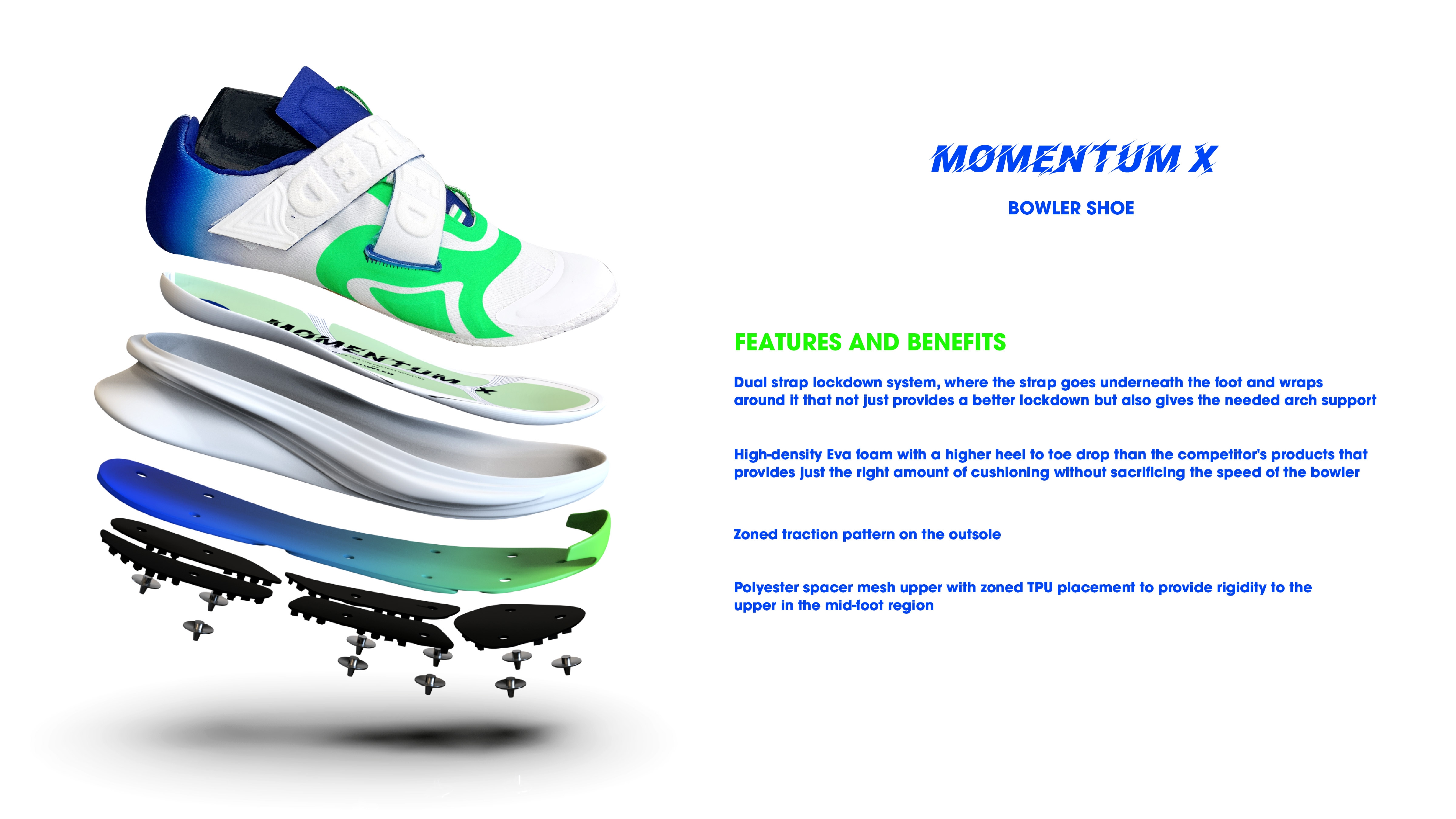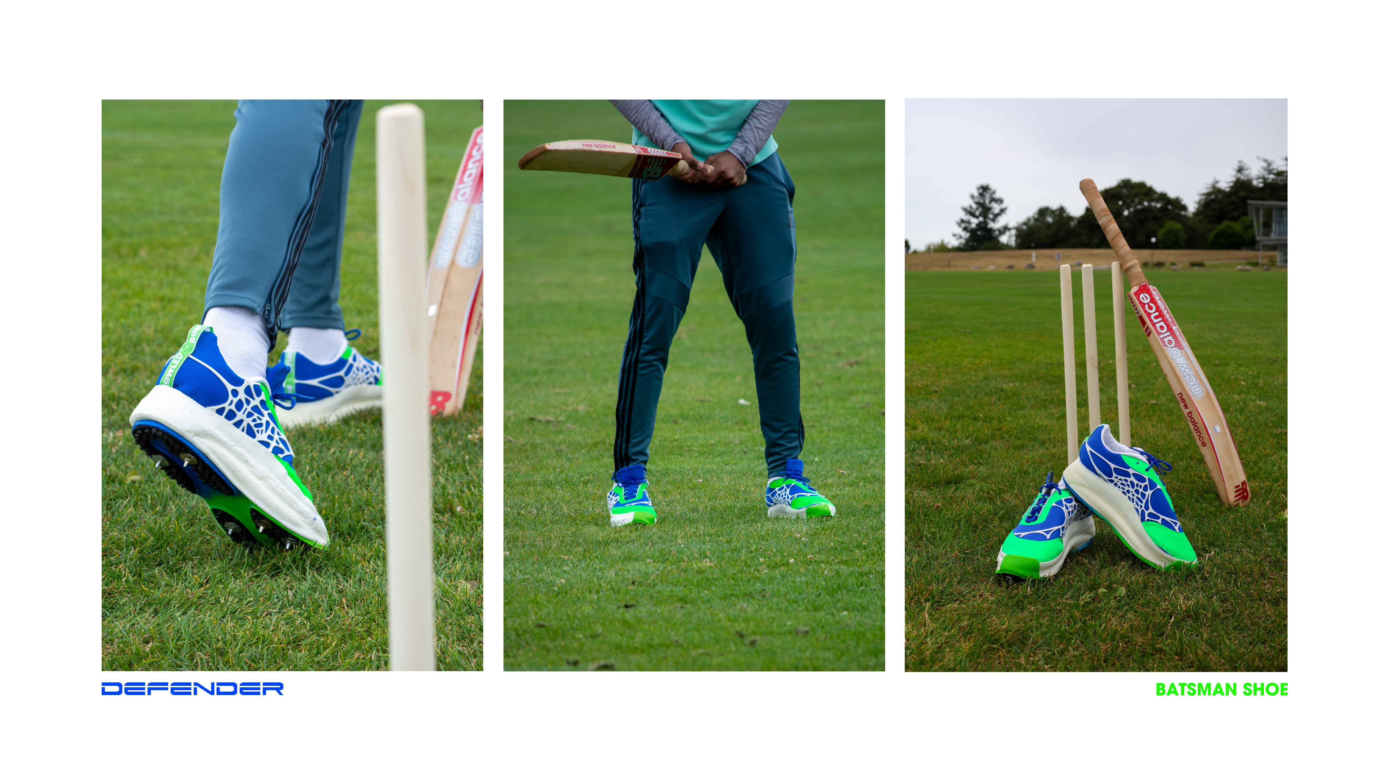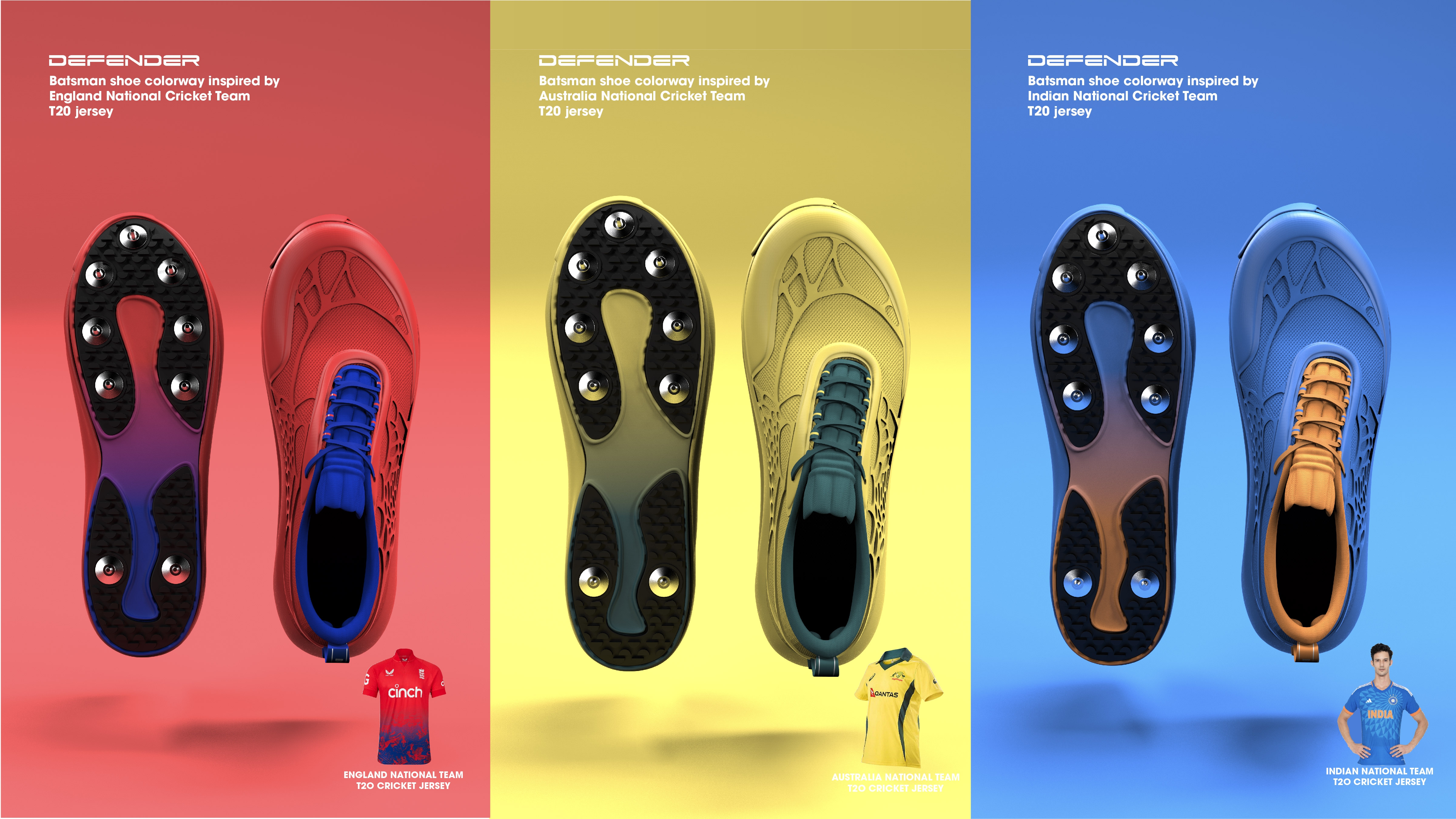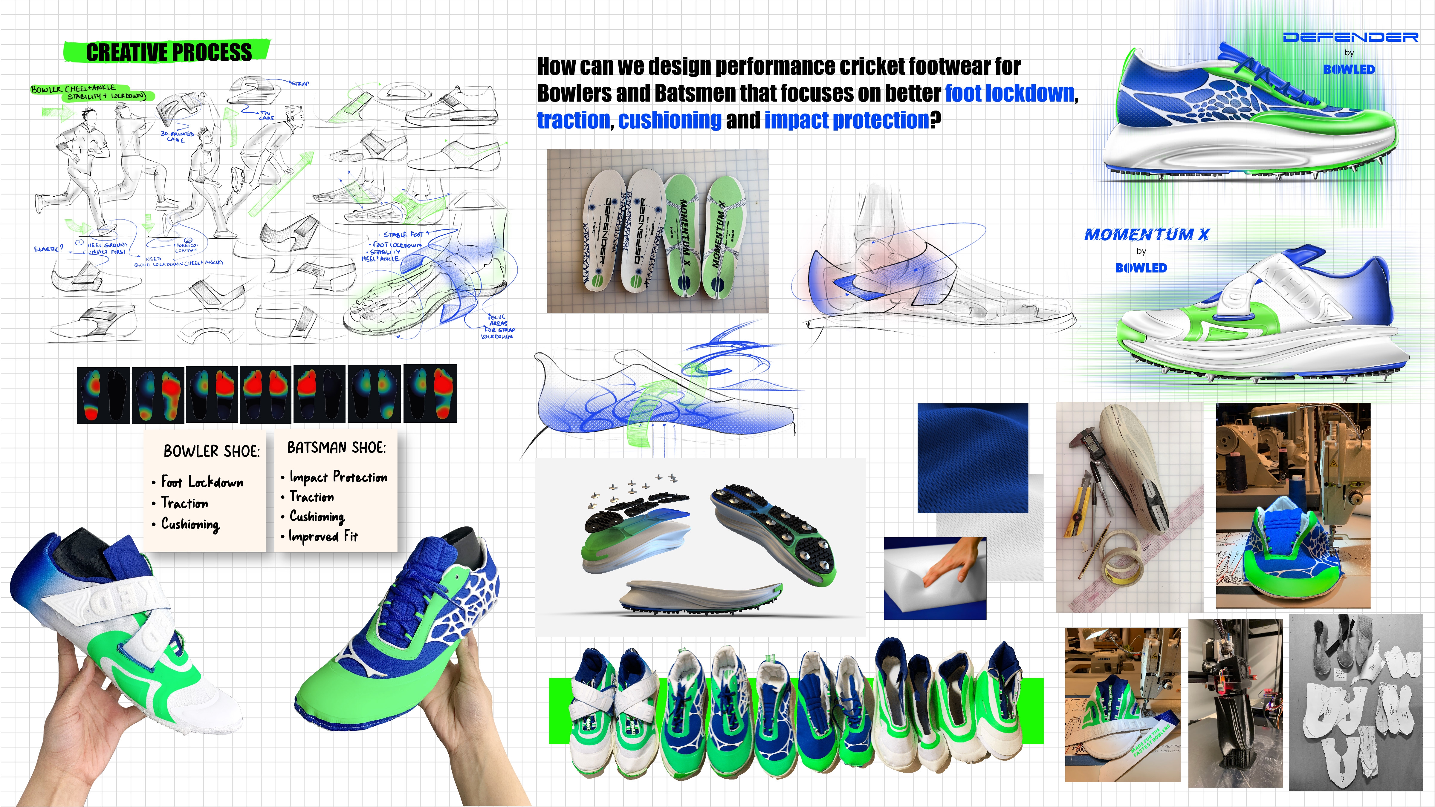 "BOWLED" is a collection of position-specific performance footwear for cricket players. Taking inspiration from the specific actions of the Batsman and the Bowler, these shoes address a modern and technical spin on footwear for this widely loved international sport. The Bowler shoe features a dual strap lockdown system that provides arch support to the bowlers and improves foot lockdown during fast-paced deliveries. The Batsman shoe features a 3D-printed TPU structure to provide additional support on the midfoot region and asymmetric lacing system for improved fit and reduced midfoot pressure.