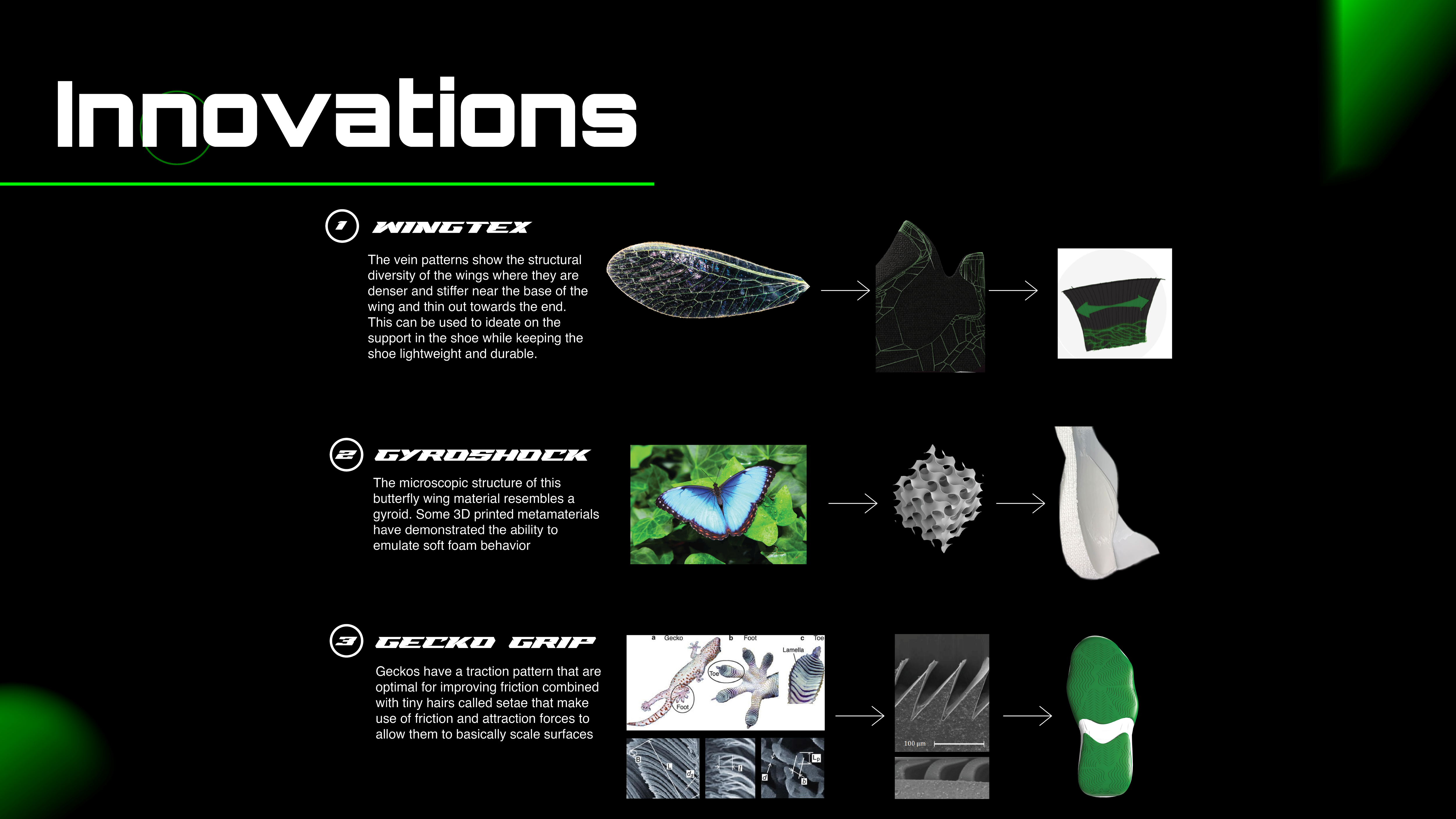 Being inspired by nature and biomimicry I aimed to create new and innovative improvements in the sector of basketball shoes. With technologies inspired by dragonflies, butterflies, and geckos, Flyte makes use of modern technology combined with natural systems to achieve breakthroughs in footwear