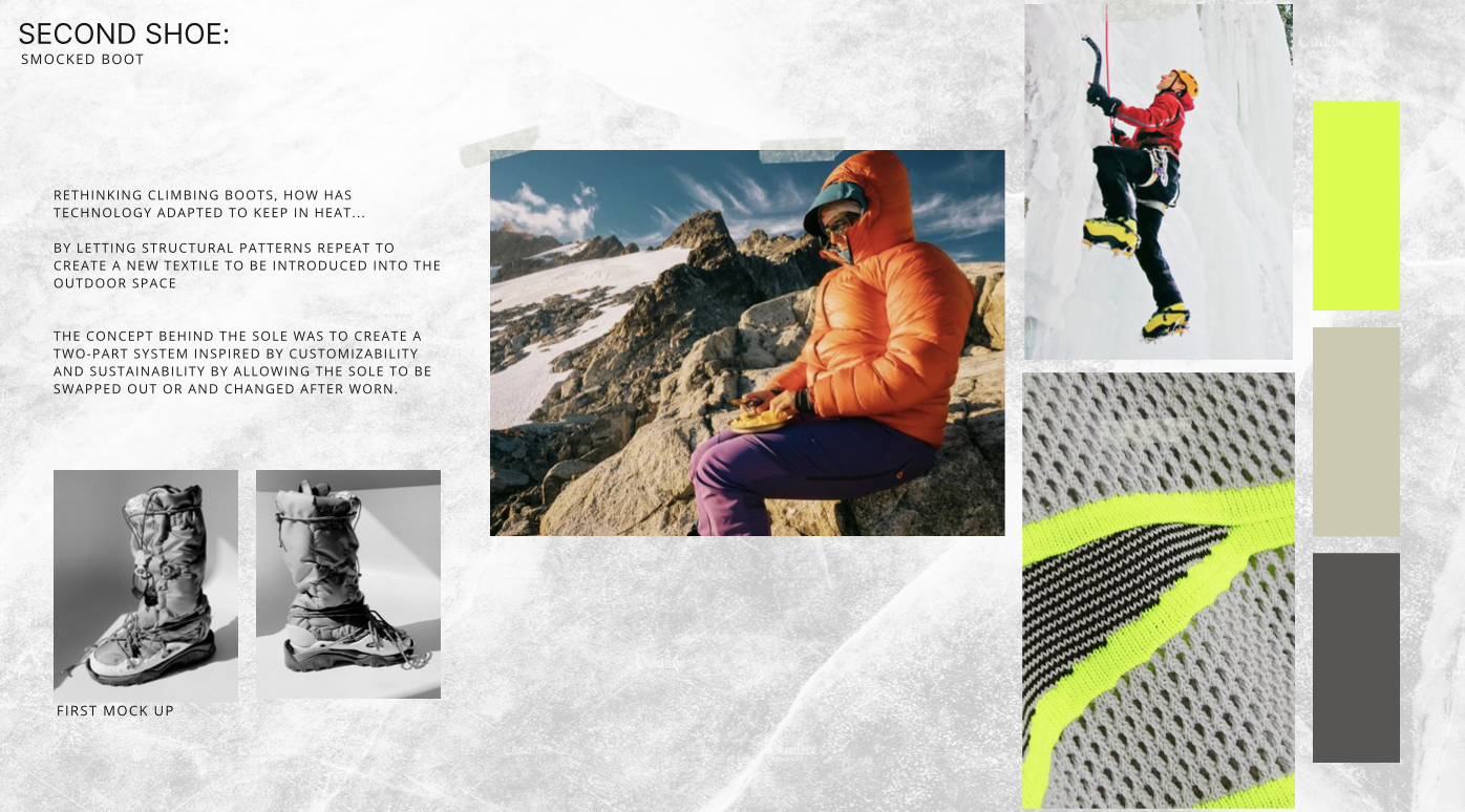 The concept behind the sole was to create a two-part system inspired by customizability and sustainability by allowing the sole to be swapped out or and changed after worn.
