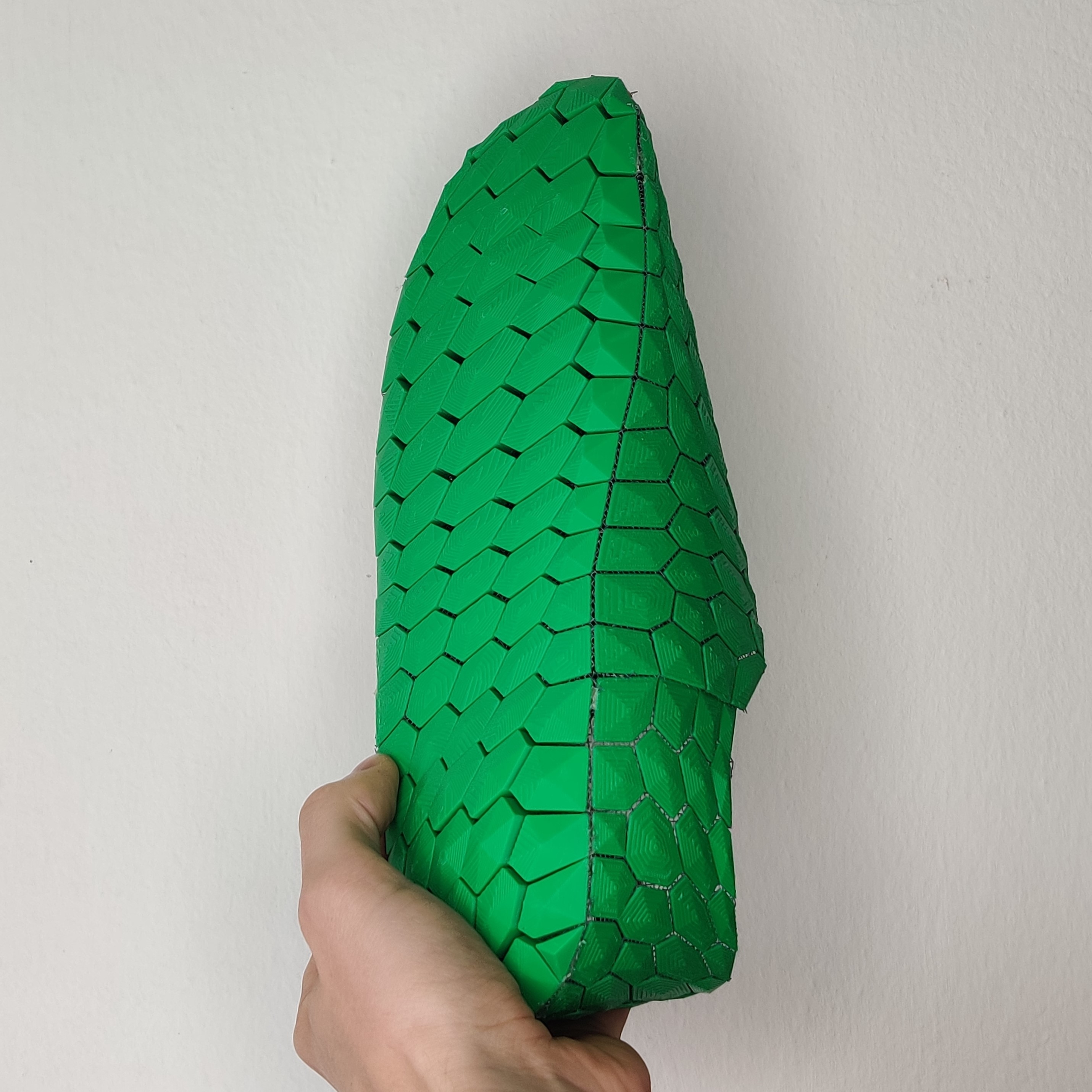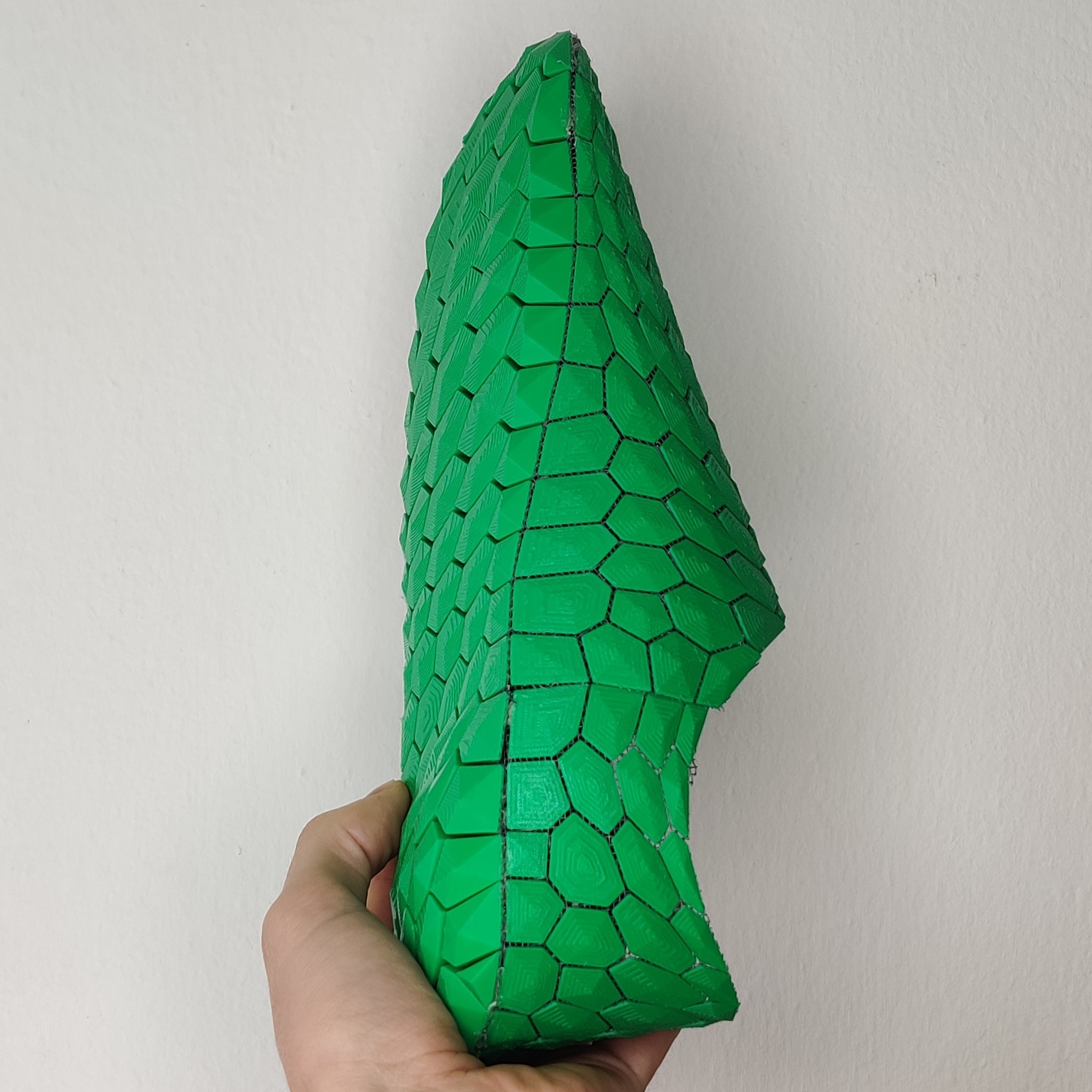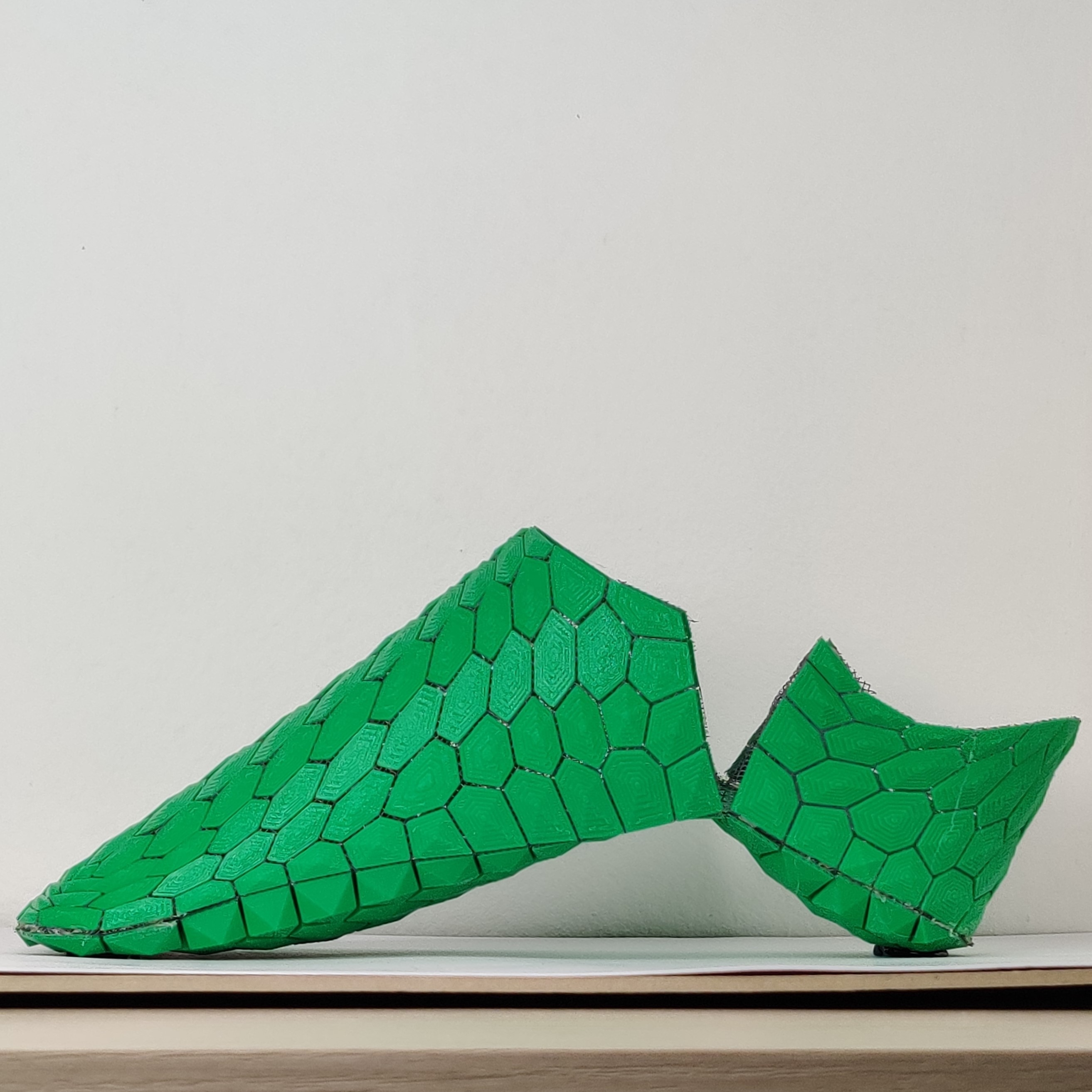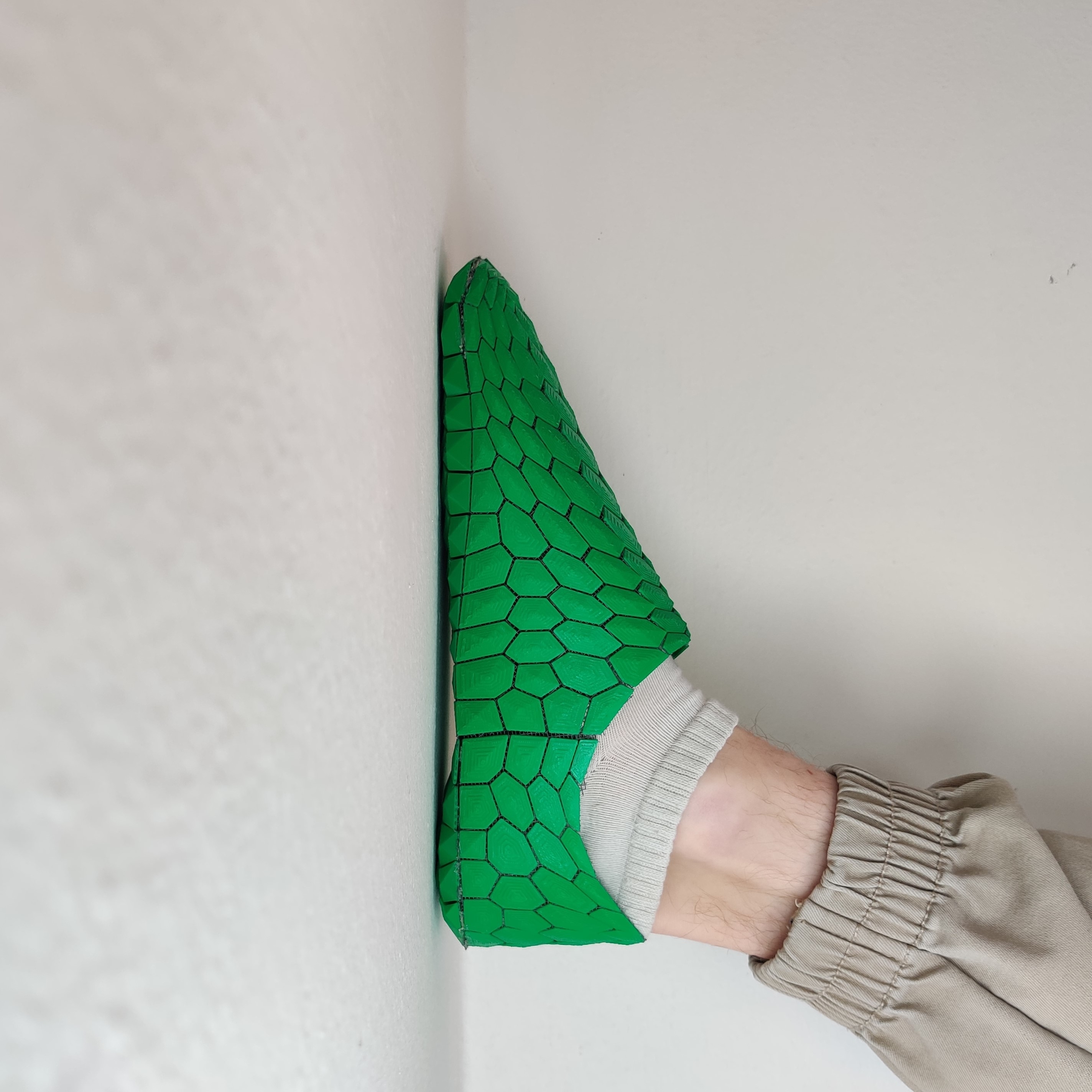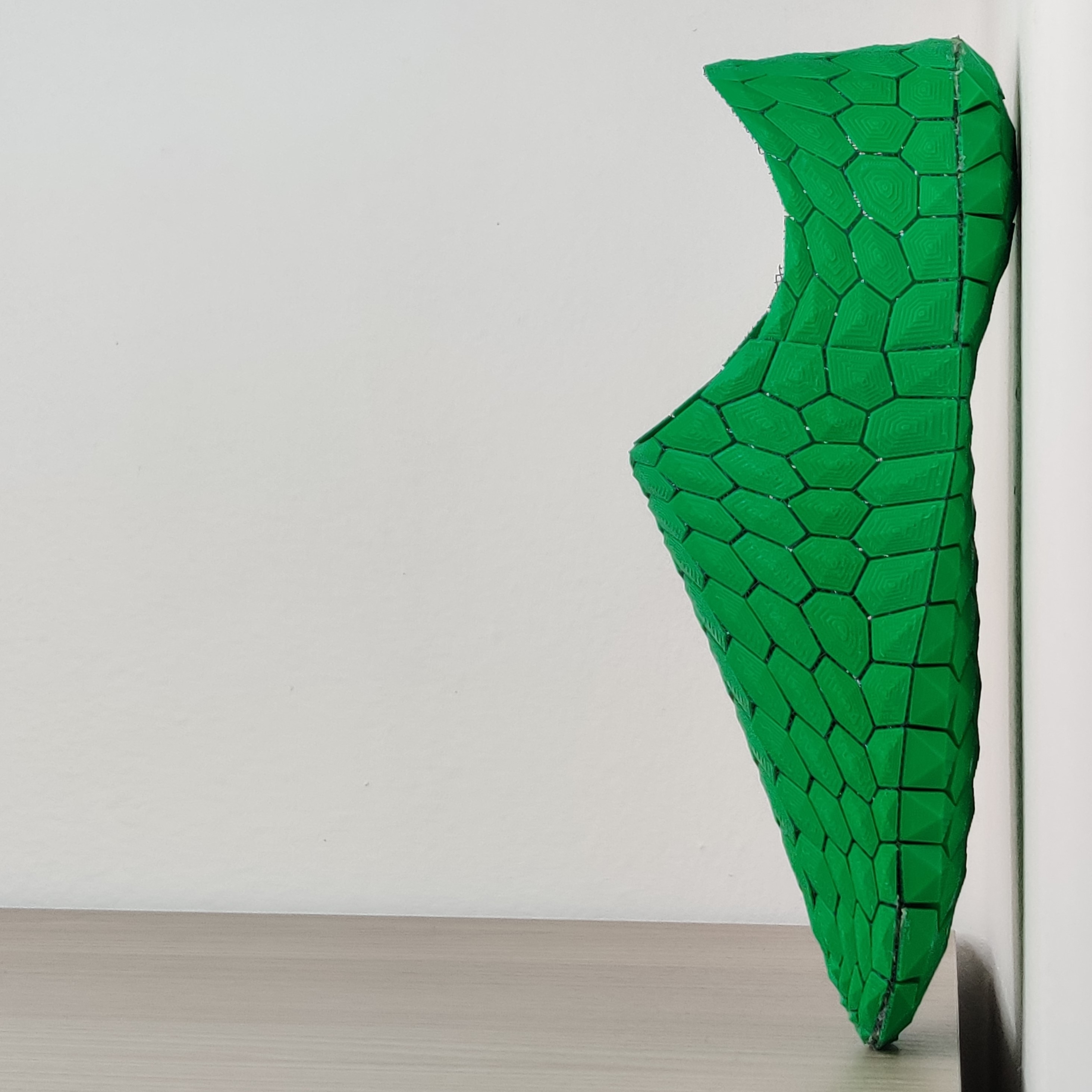Our competition entry champions a sustainable approach to home clothing production. Using Econyl, a material derived from recycled ocean plastics, we craft mono-material shoes with an ideal fit, thanks to 3D scanning. Our design masterfully combines flexibility and support through mesh adjustments. What's innovative is our 3D-to-2D design, enabling complete flat 3D printing, minimizing waste, and setting the stage for a future where fashion is created on demand, reducing storage needs, and promoting eco-friendly practices.