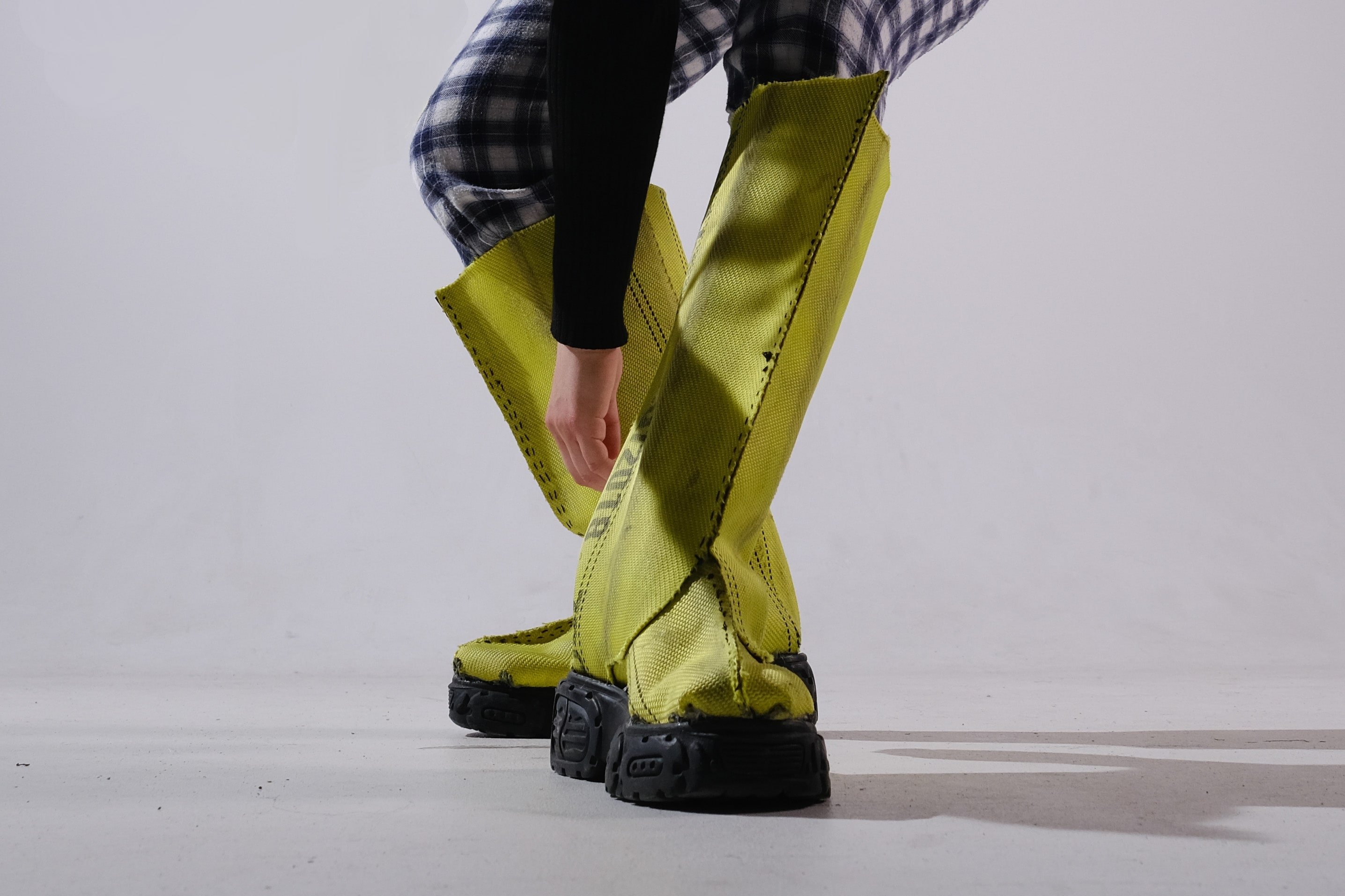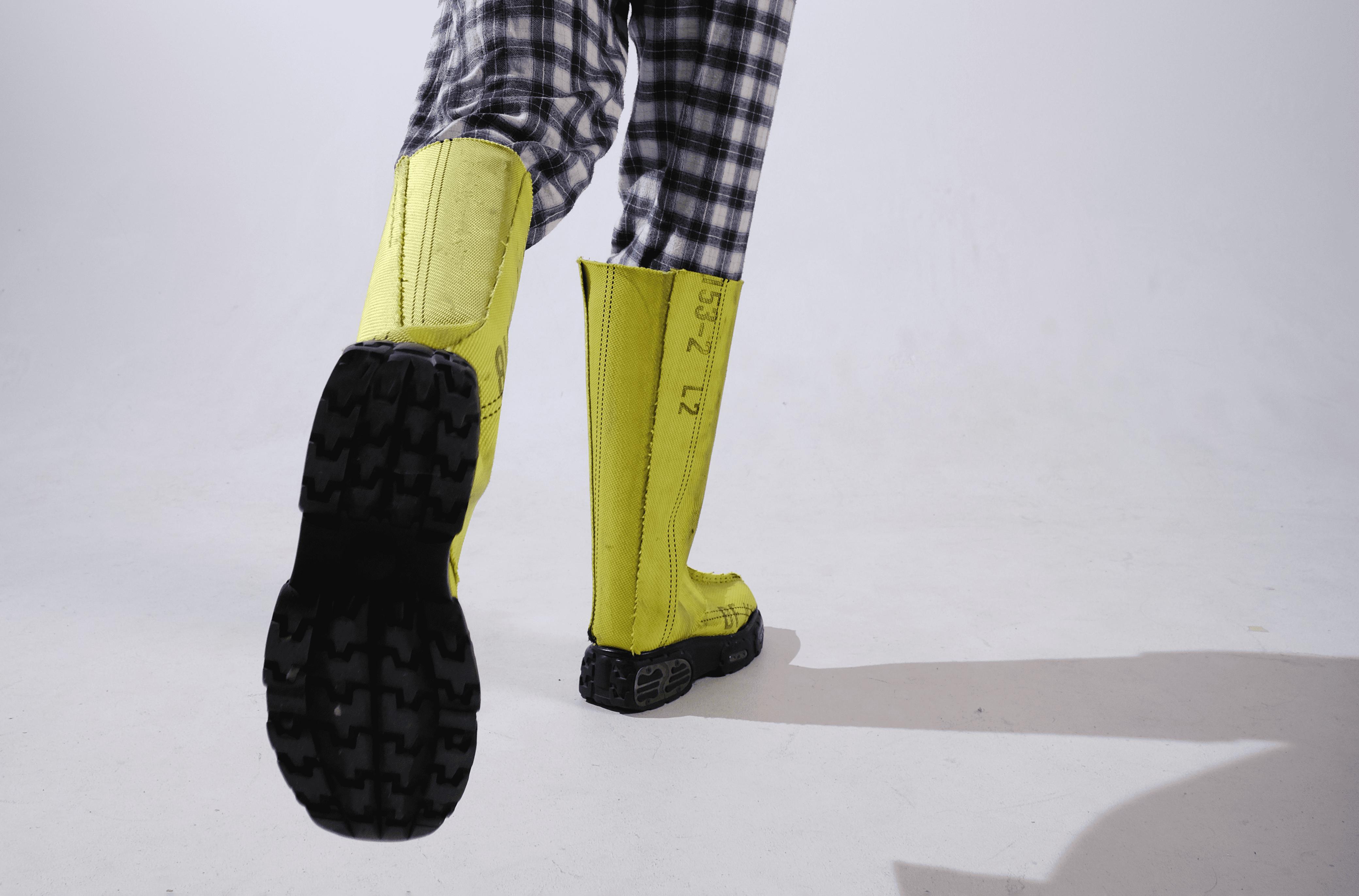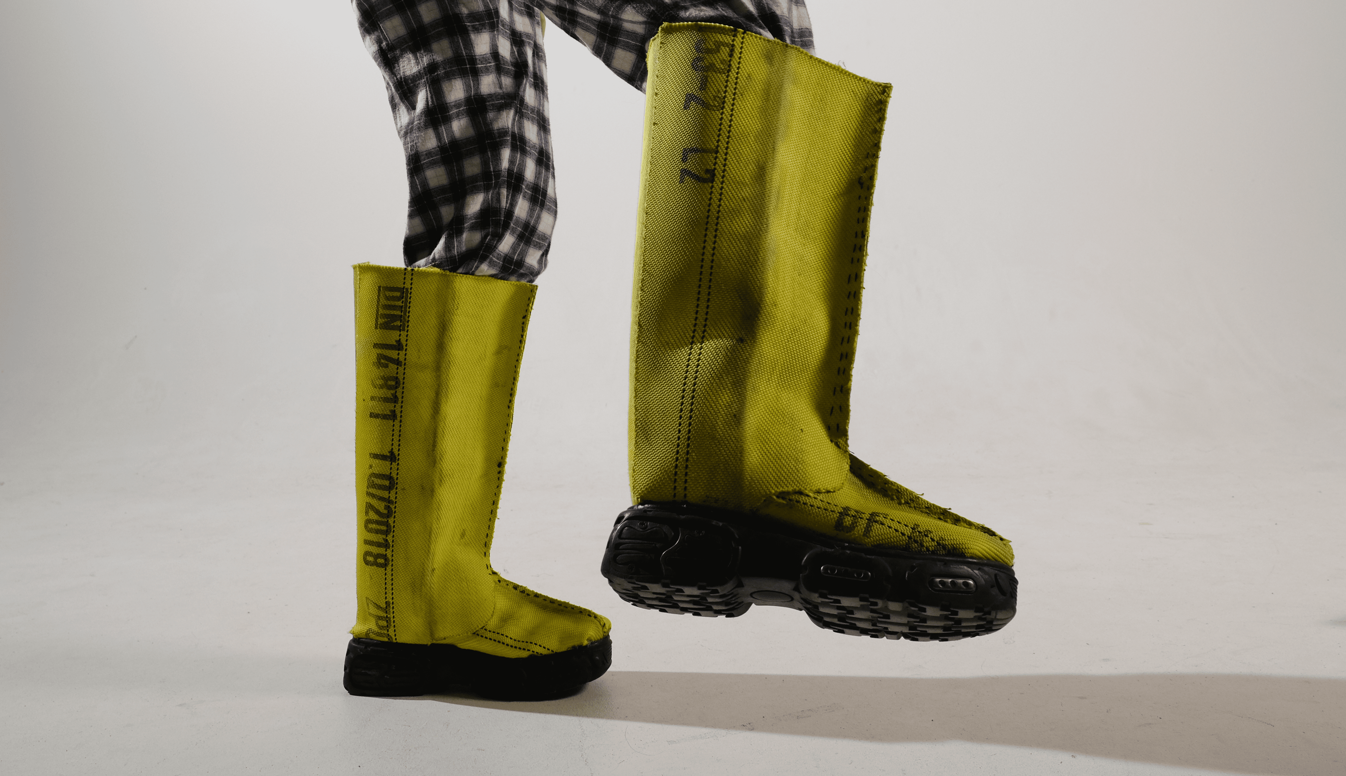 THE ALARM RUBBER BOOT IS MADE BY RECYCLING THE HIGHLY TECHNICAL YET WASTED MATERIAL OF BROKEN FIRE HOESES. IT IS DESIGNED TO OFFER PROTECTION DURING FLOODS, A FUTURE SCENARIO THAT IS BECOMING MORE CURRENT DUE TO CLIMATE CHANGE.