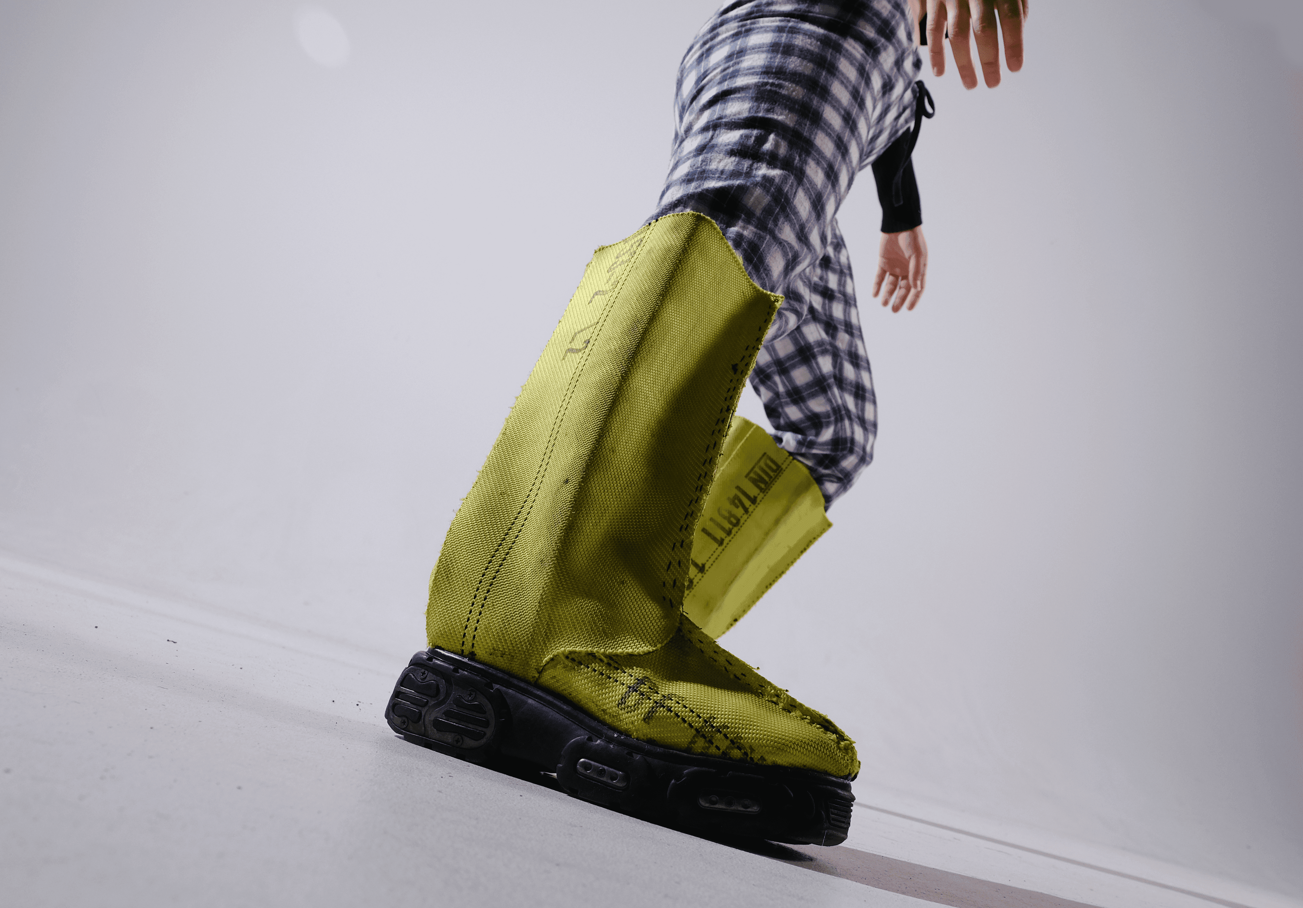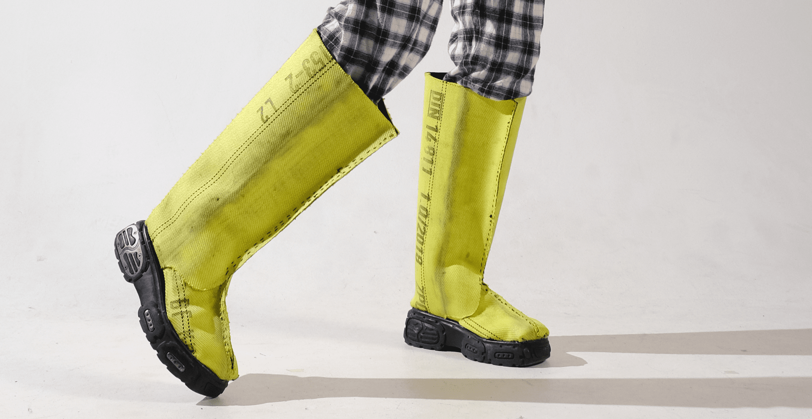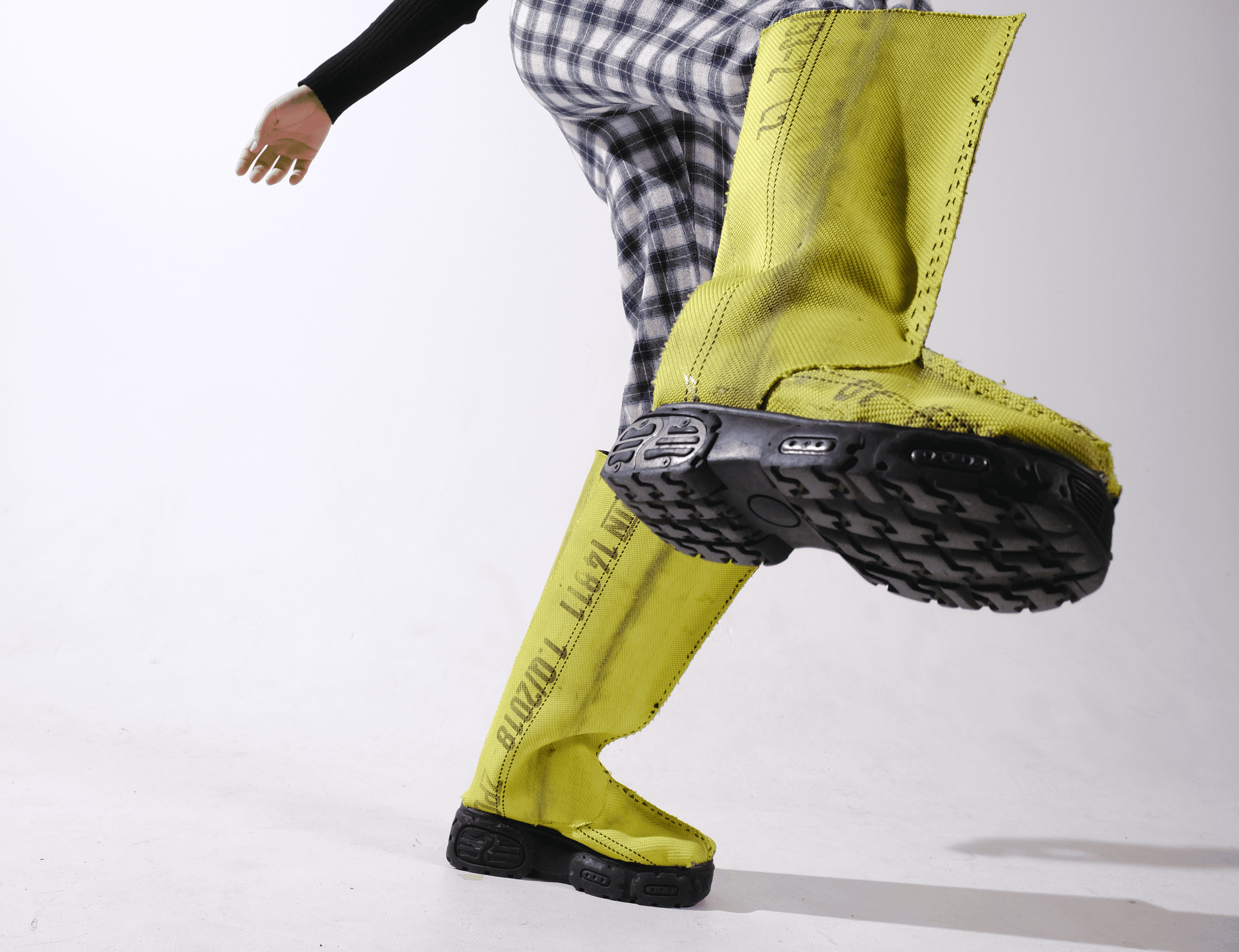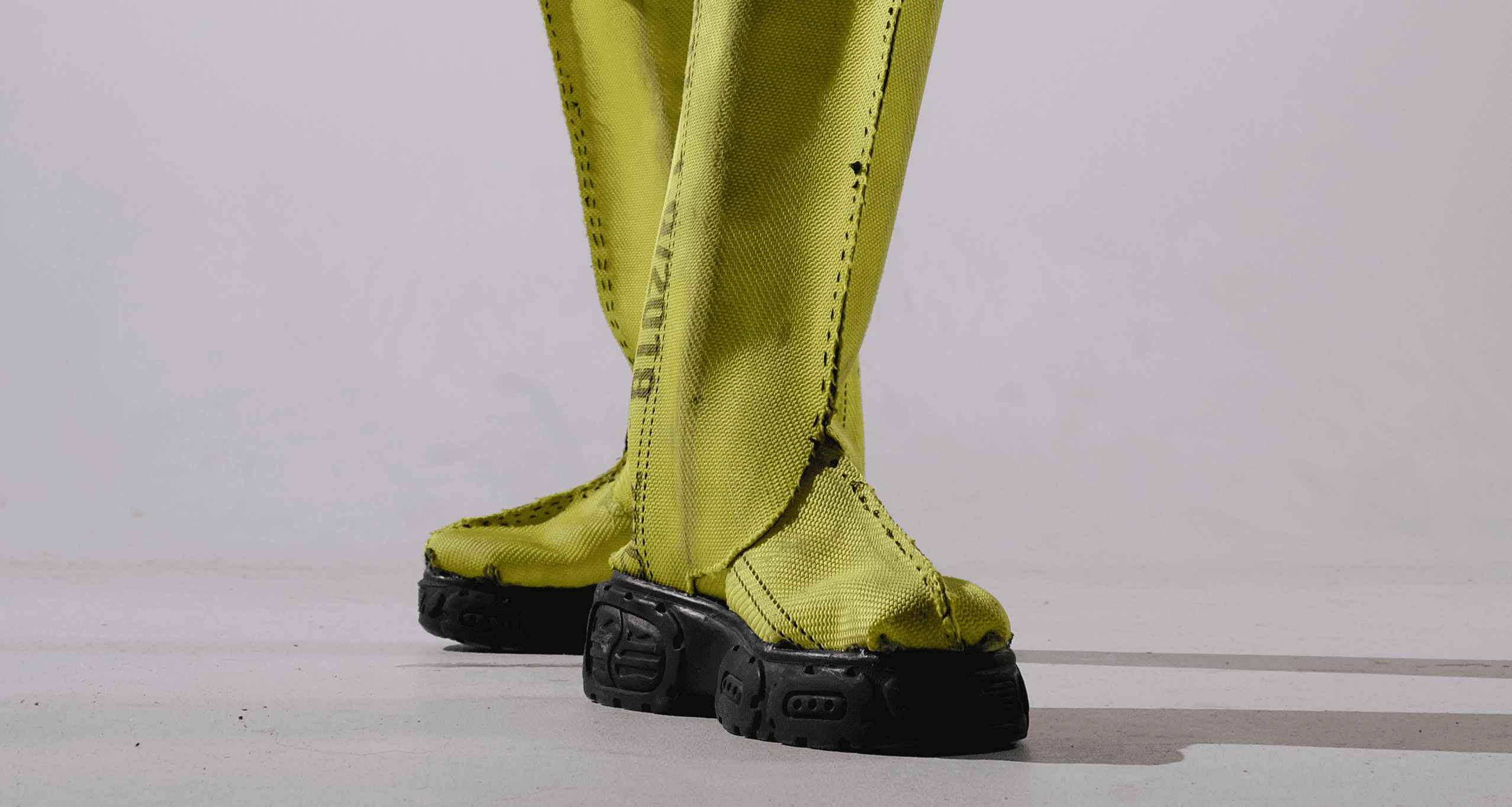 THE ALARM RUBBER BOOT IS MADE BY RECYCLING THE HIGHLY TECHNICAL YET WASTED MATERIAL OF BROKEN FIRE HOESES. IT IS DESIGNED TO OFFER PROTECTION DURING FLOODS, A FUTURE SCENARIO THAT IS BECOMING MORE CURRENT DUE TO CLIMATE CHANGE.