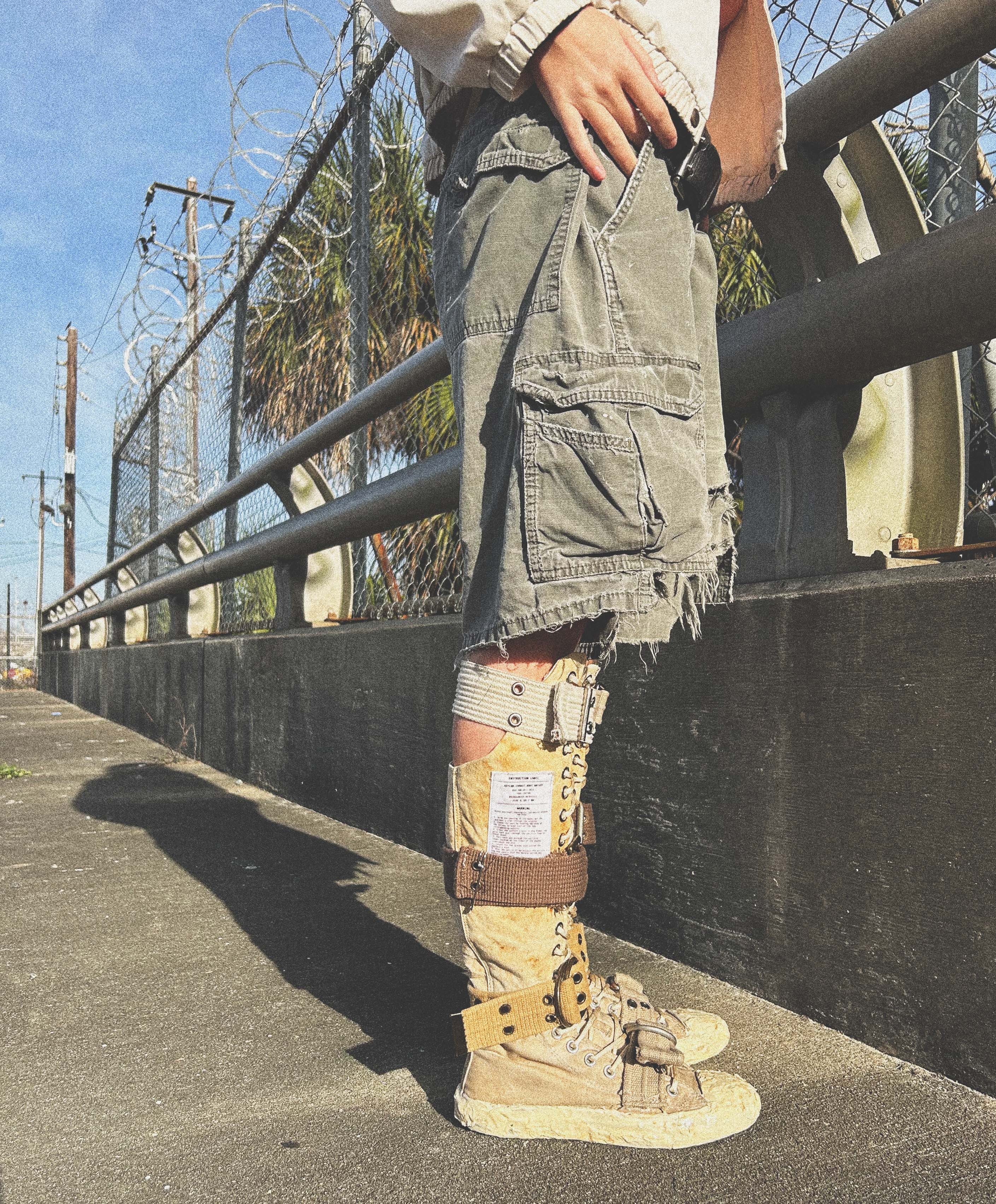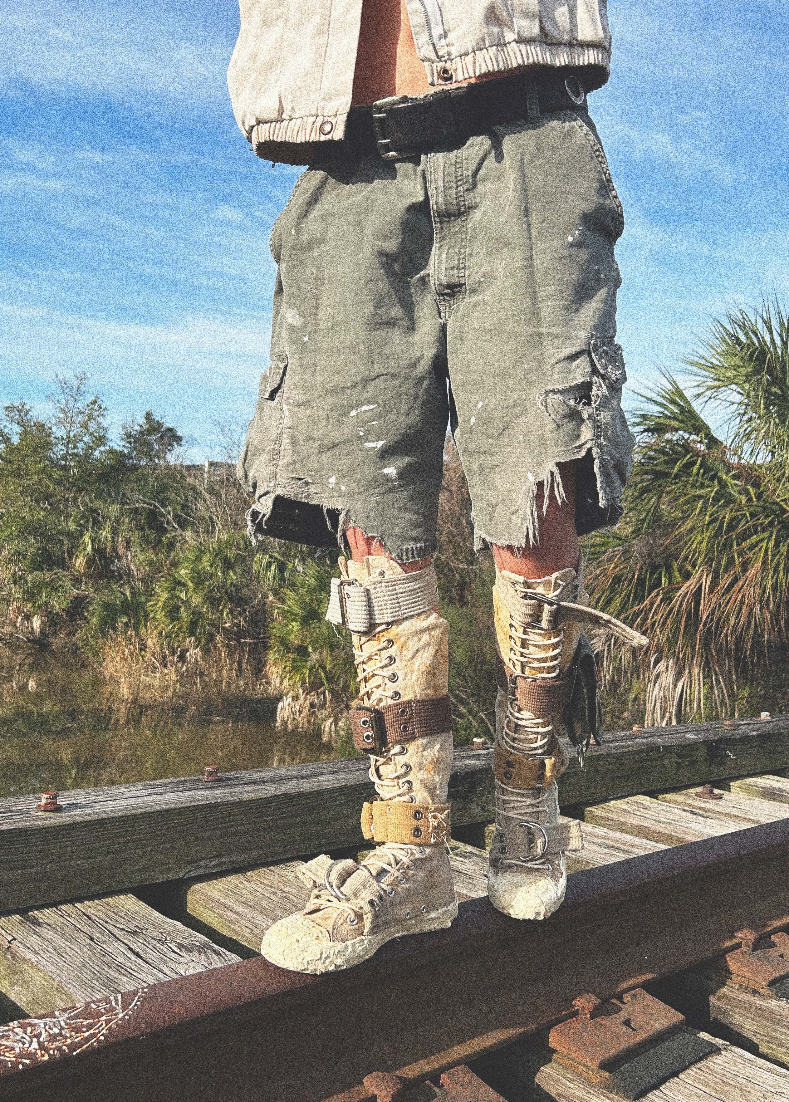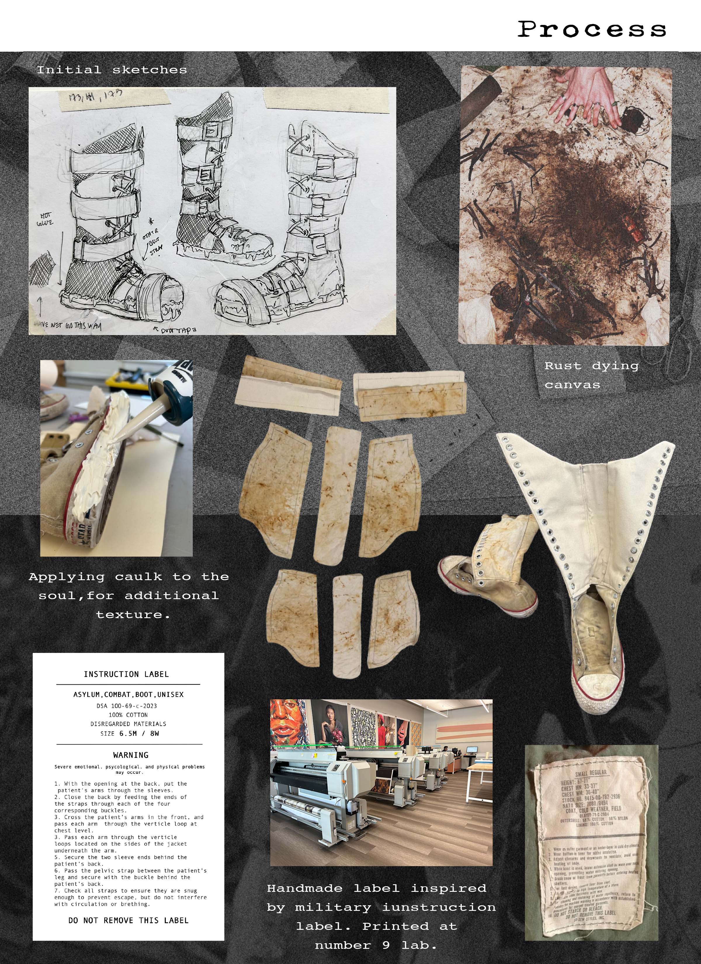 Our world is deteriorating more and more every day both physically and mentally. These shoes are intended to encapsulate this element of decomposition, by portraying an abandoned insane asylum. The initial pair of chuck taylors were dyed with coffee and then assembled with canvas rust dyed by Lilla Rosenberg. Keeping in mind the theme of the shoe, salvaged military belts were incorporated to mirror the straps of a straight jacket. In addition, there is a hand-designed, military-inspired label on how to strap a patient into a straight jacket.