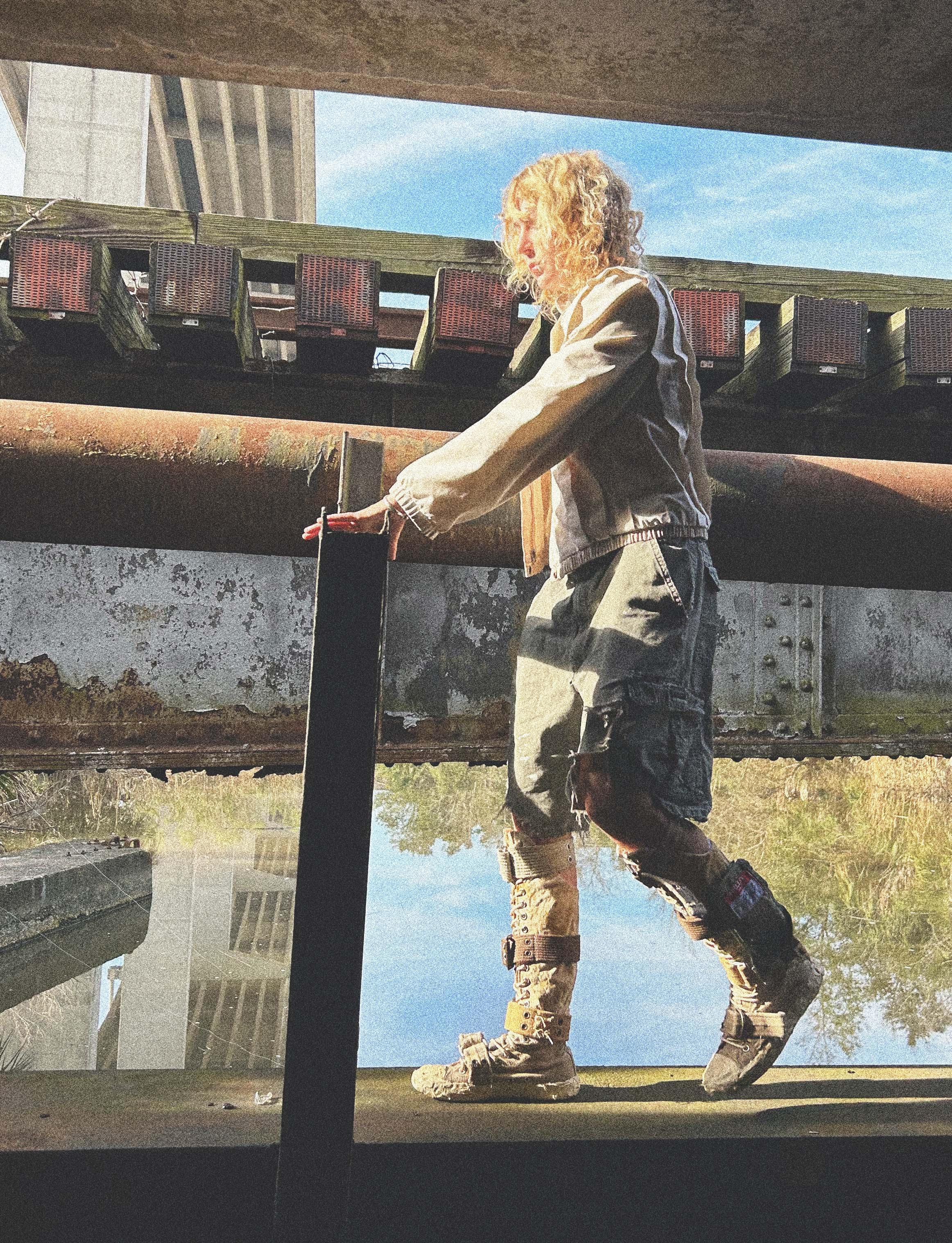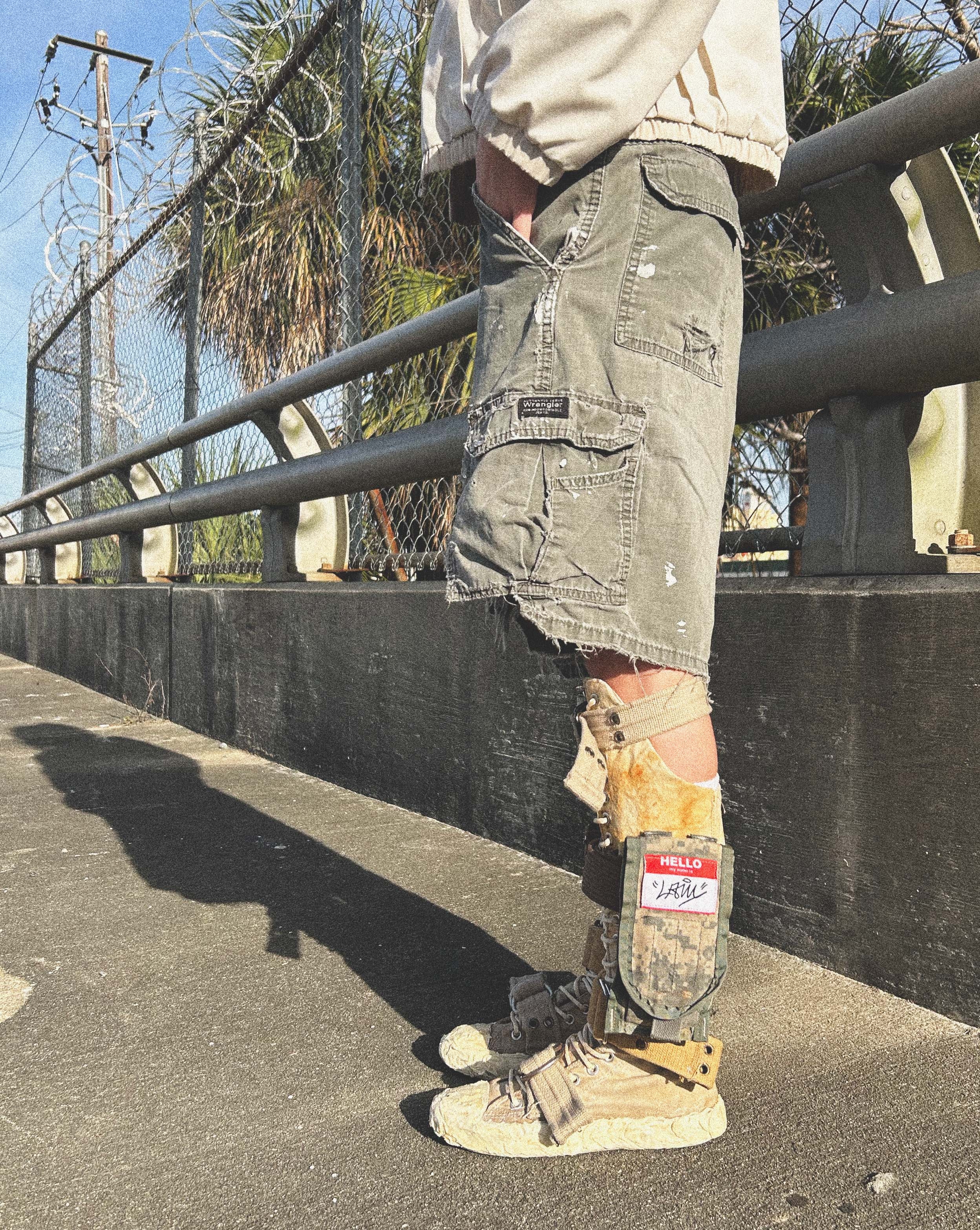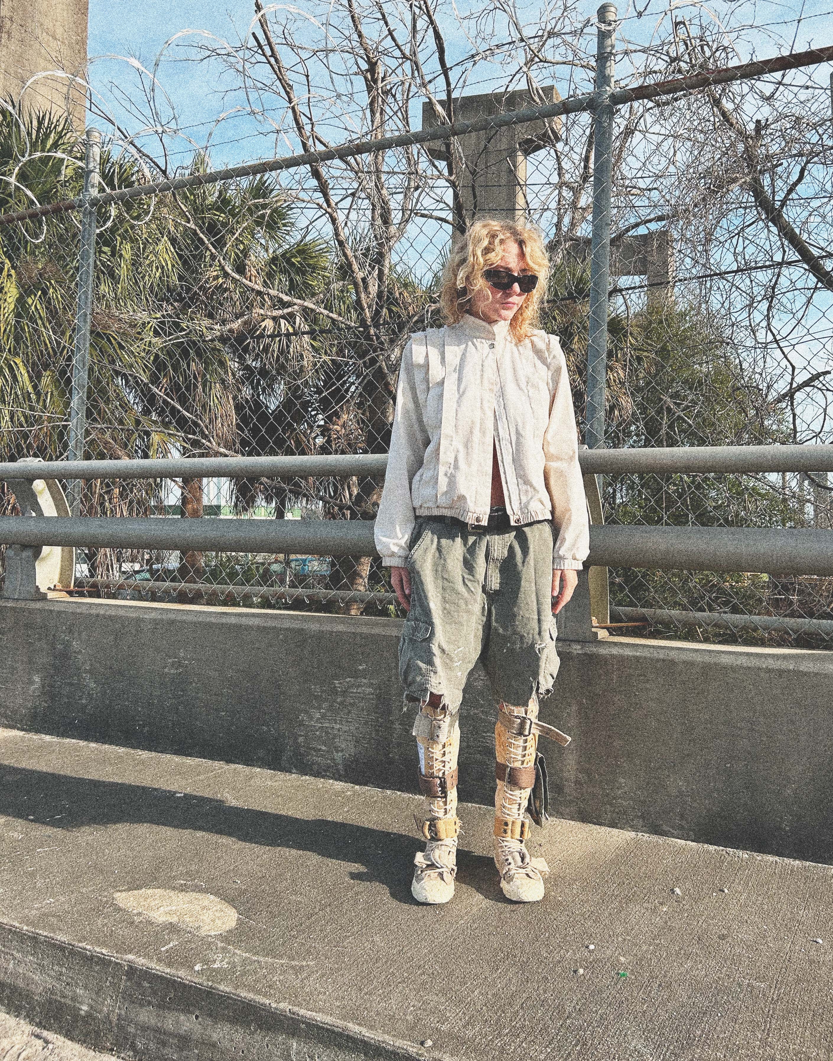 Our world is deteriorating more and more every day both physically and mentally. These shoes are intended to encapsulate this element of decomposition, by portraying an abandoned insane asylum. The initial pair of chuck taylors were dyed with coffee and then assembled with canvas rust dyed by Lilla Rosenberg. Keeping in mind the theme of the shoe, salvaged military belts were incorporated to mirror the straps of a straight jacket. In addition, there is a hand-designed, military-inspired label on how to strap a patient into a straight jacket.