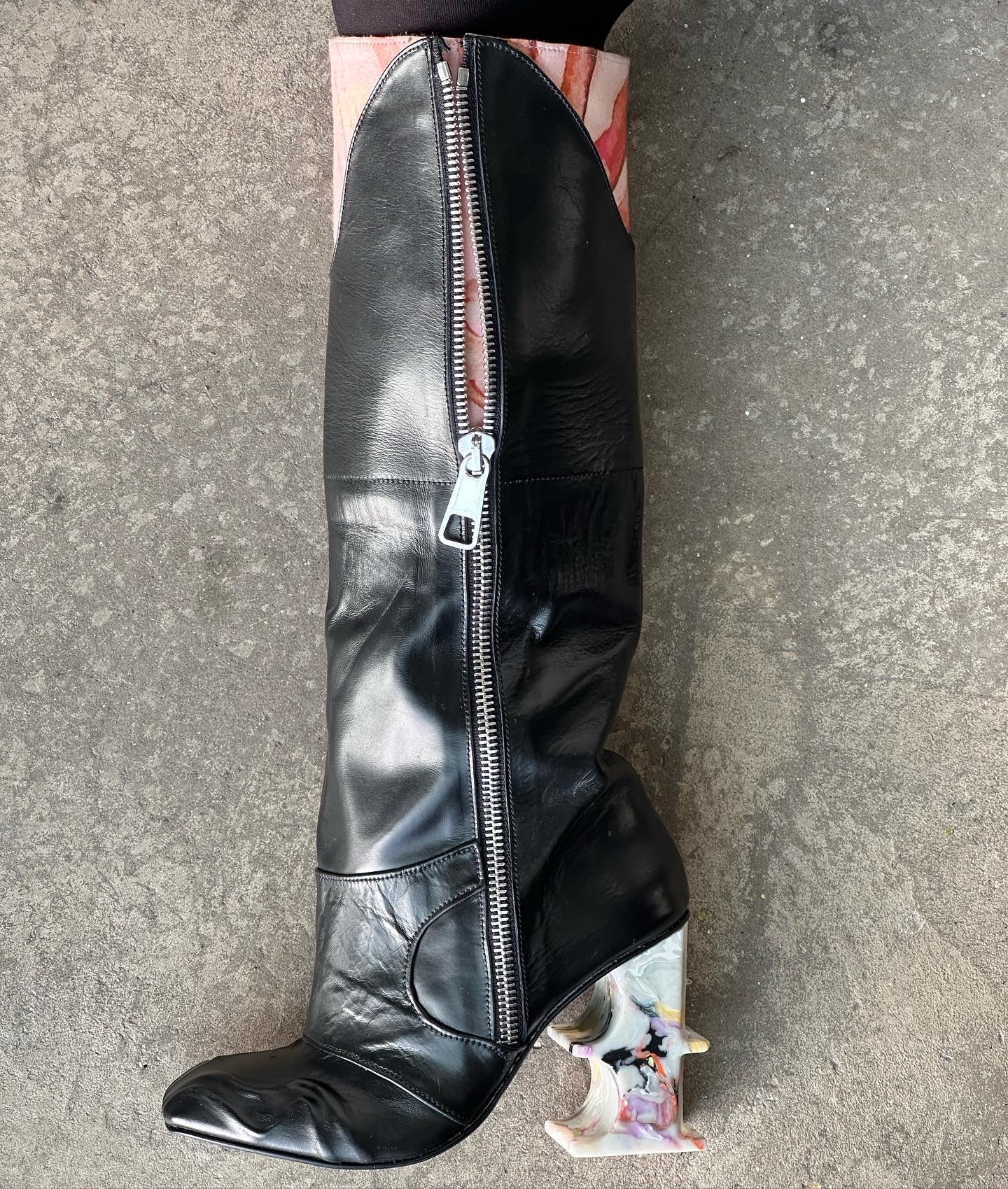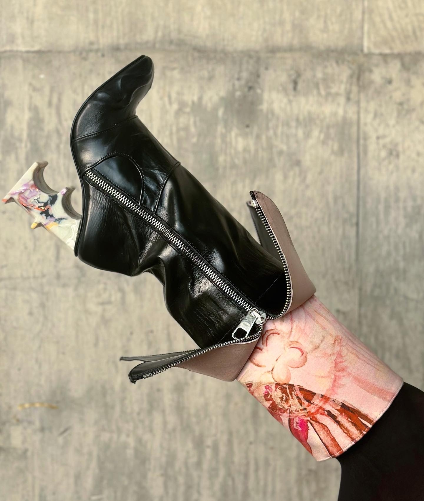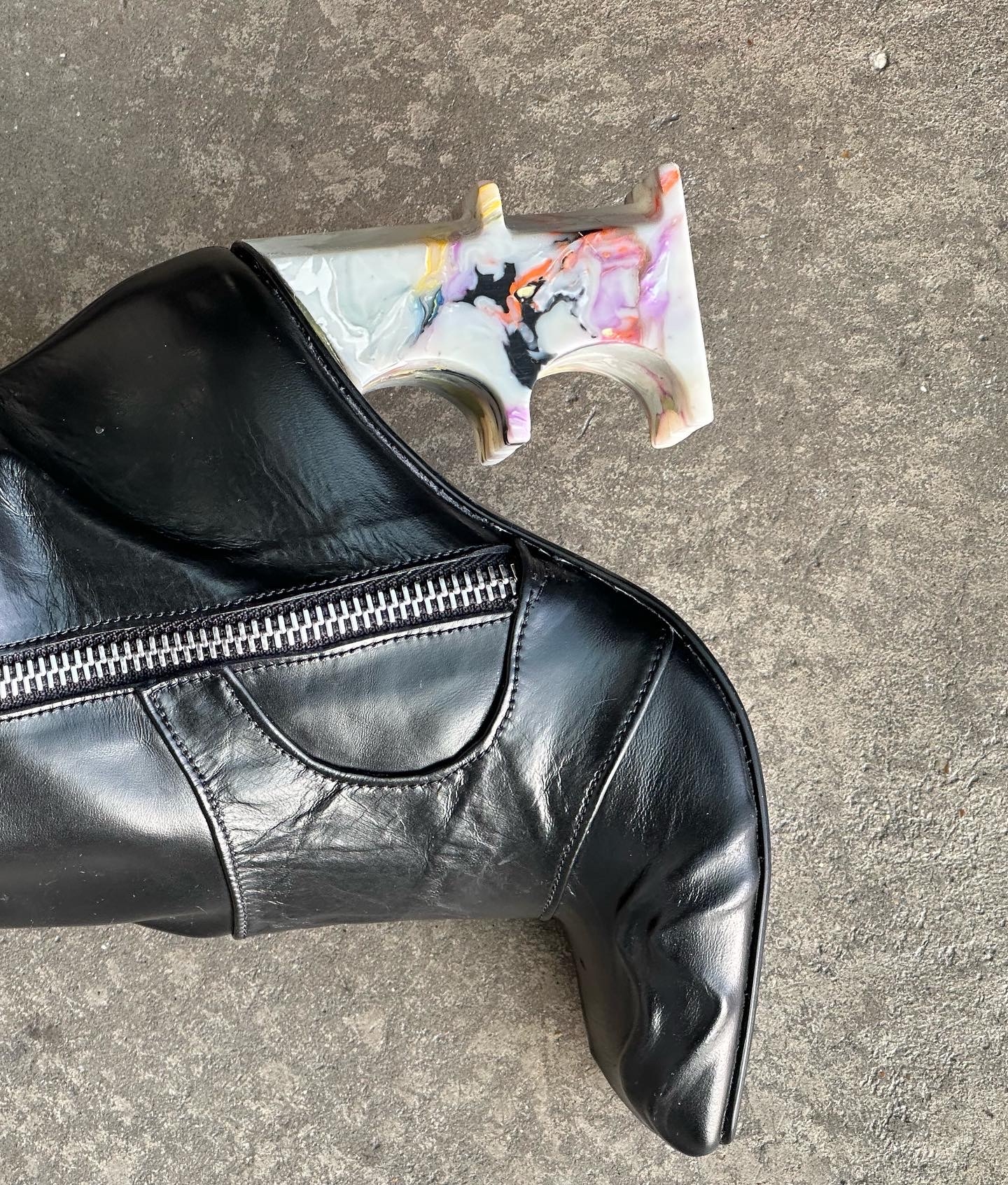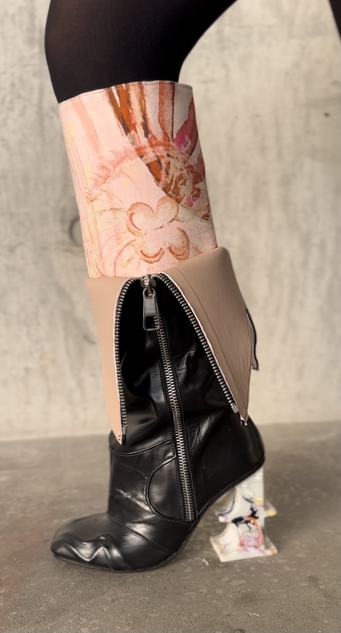 The 'Layers' Boot design draws its inspiration mainly from deep-sea ecosystems that are in danger of extinction. The hybrid human figures in Alexander McQueen's Plato’s Atlantis collection are the muse of this footwear range which symbolizes the danger if customers don’t stop over-consumption. The recycled heel design can be thought of as a plastic-bone hybrid extension of the human foot. Layers boot is a multifunctional design since it can be worn with the zip open or closed. The heel is made from HDPE Recycled plastic to prevent waste and water pollution to a certain extent.