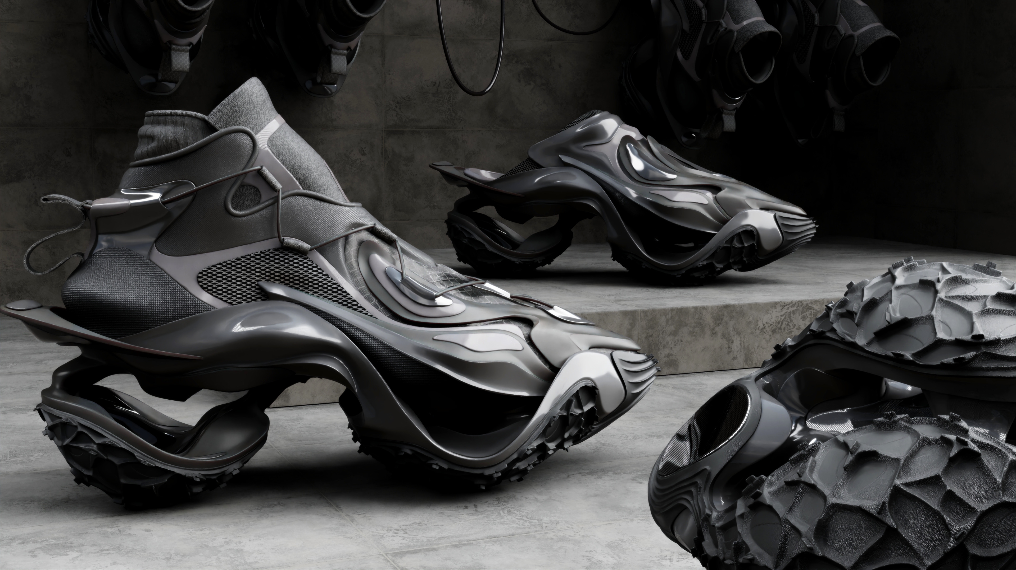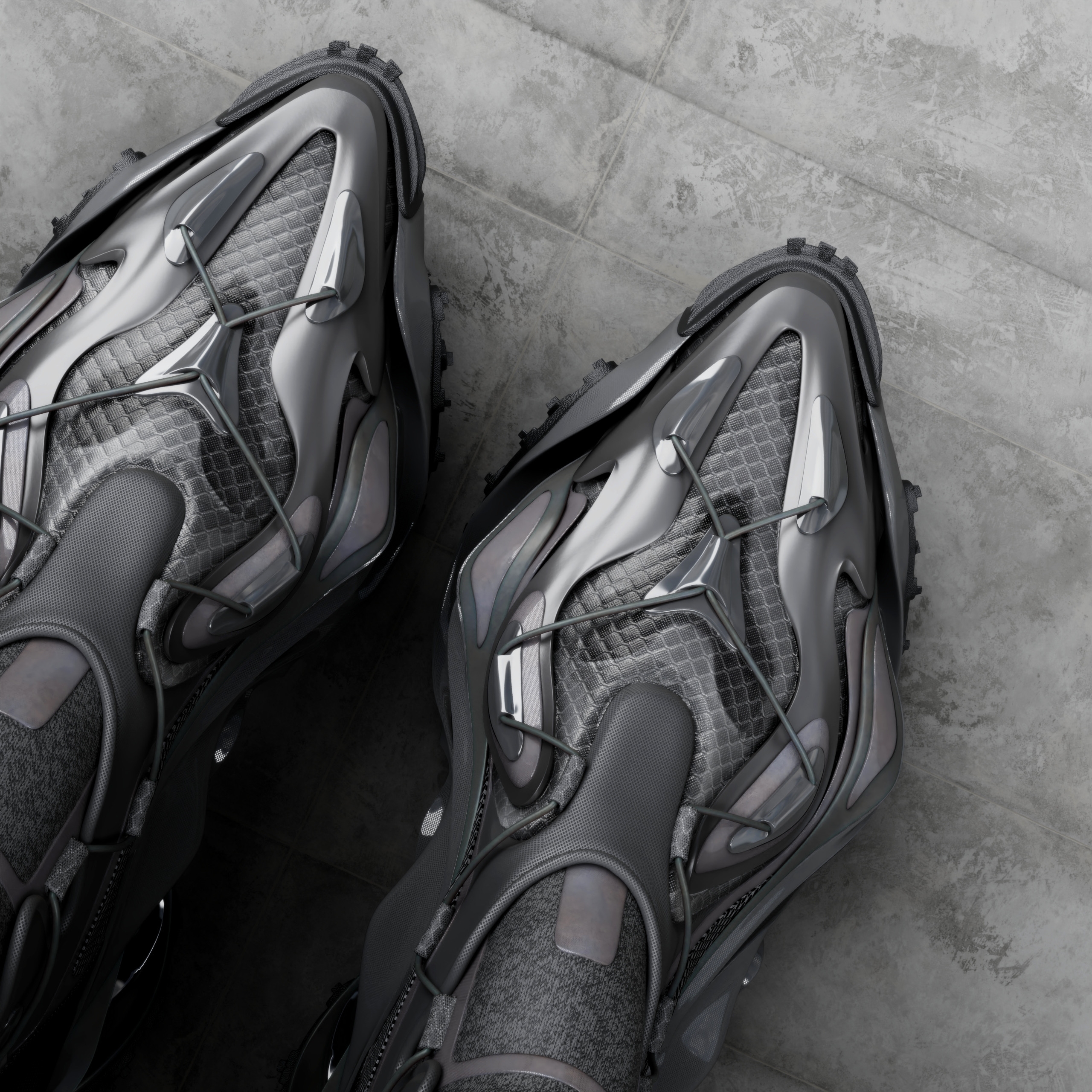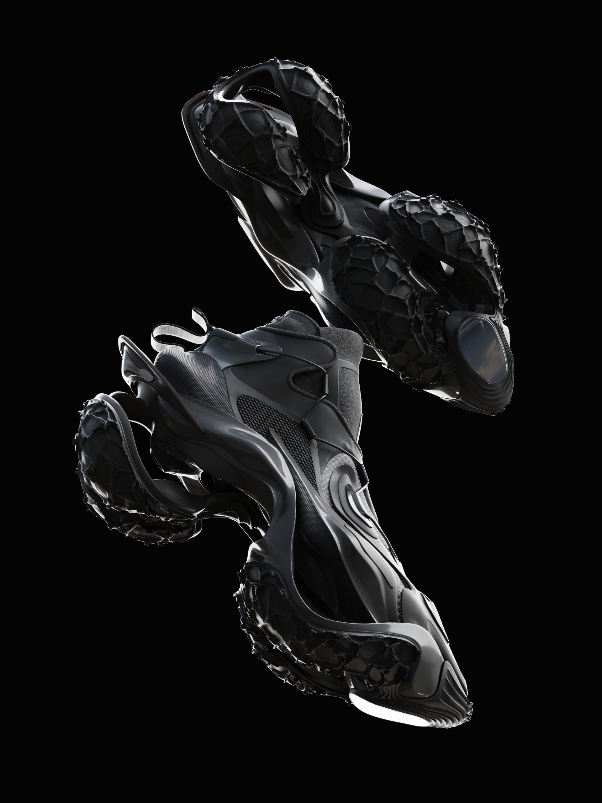 This collection draws inspiration from elevated military references and technical detailing. It uses tafoni sandstone formations as the foundation for the tread, serving as a design feature that allows it to adapt to diverse environments and terrains. Both styles are driven by elements that create a sense of support, incorporating protective paneling and versatility to echo the tactical nature of the designs, while offsetting it with non-traditional silhouettes.