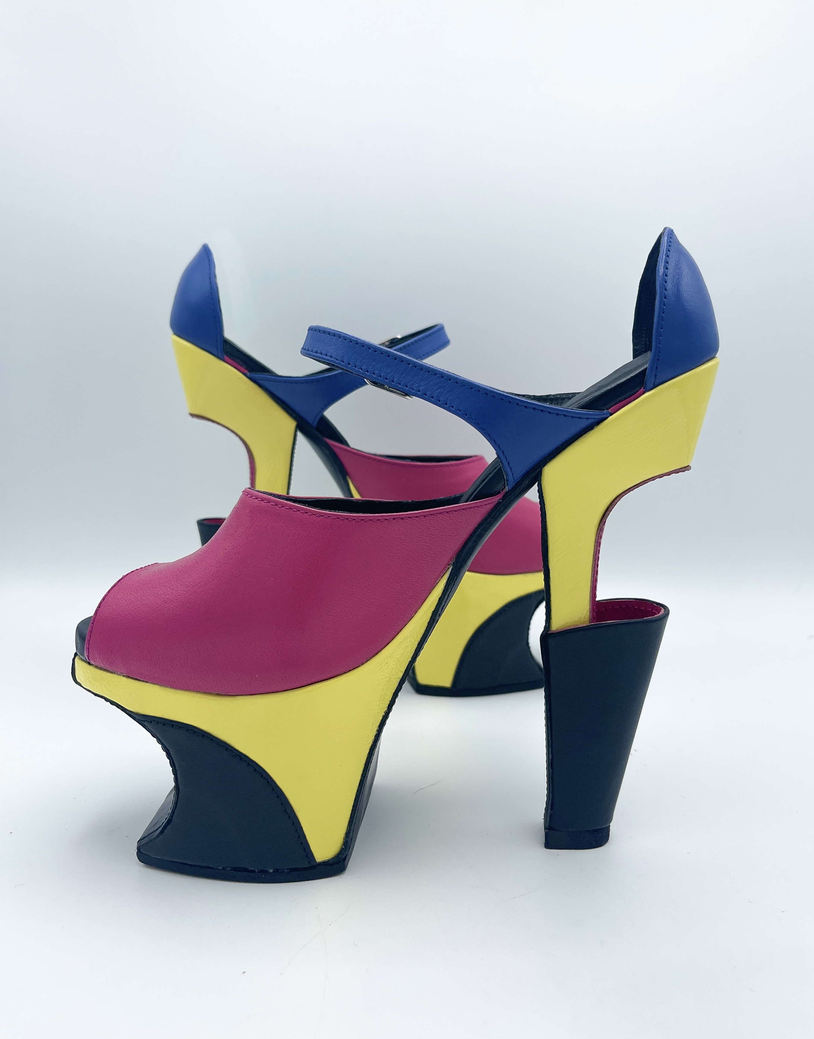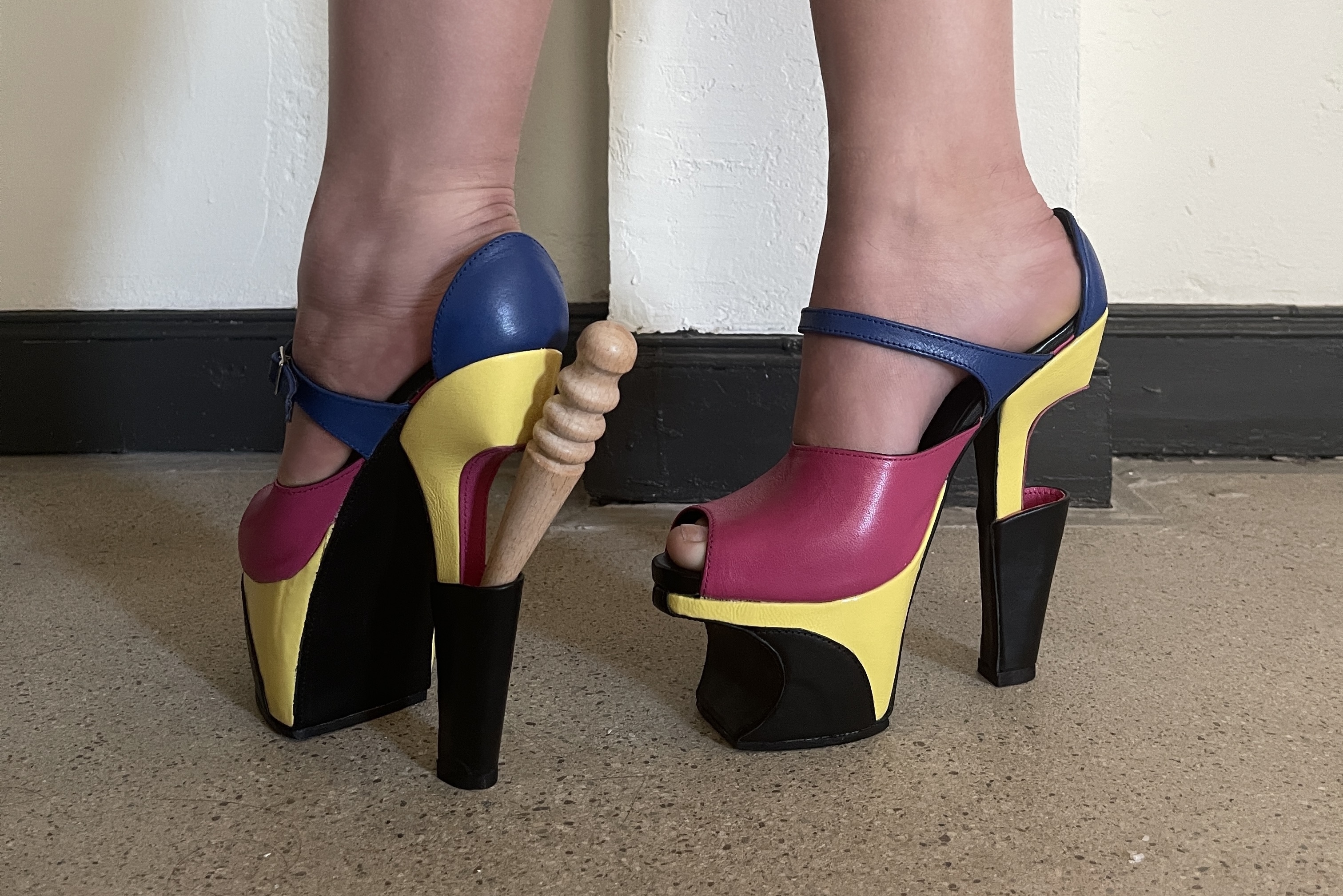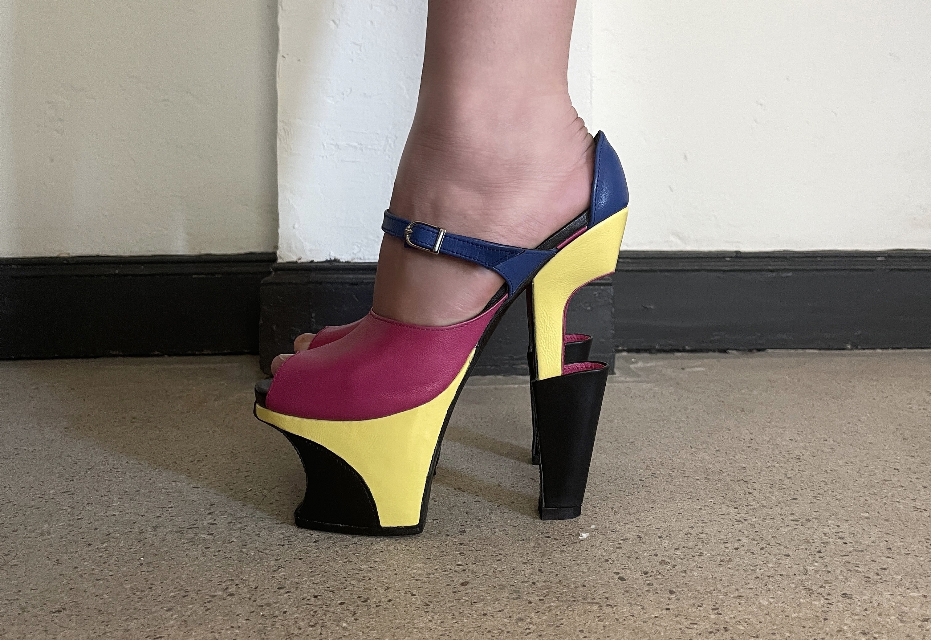 These heels are inspired by Mid Century Modern Scandinavian furniture. Highlighting the continuation of lines and sharp angles present throughout the design. The back portion of the heel is hollow and is intended to hold small objects, hence the name “flower vase”.