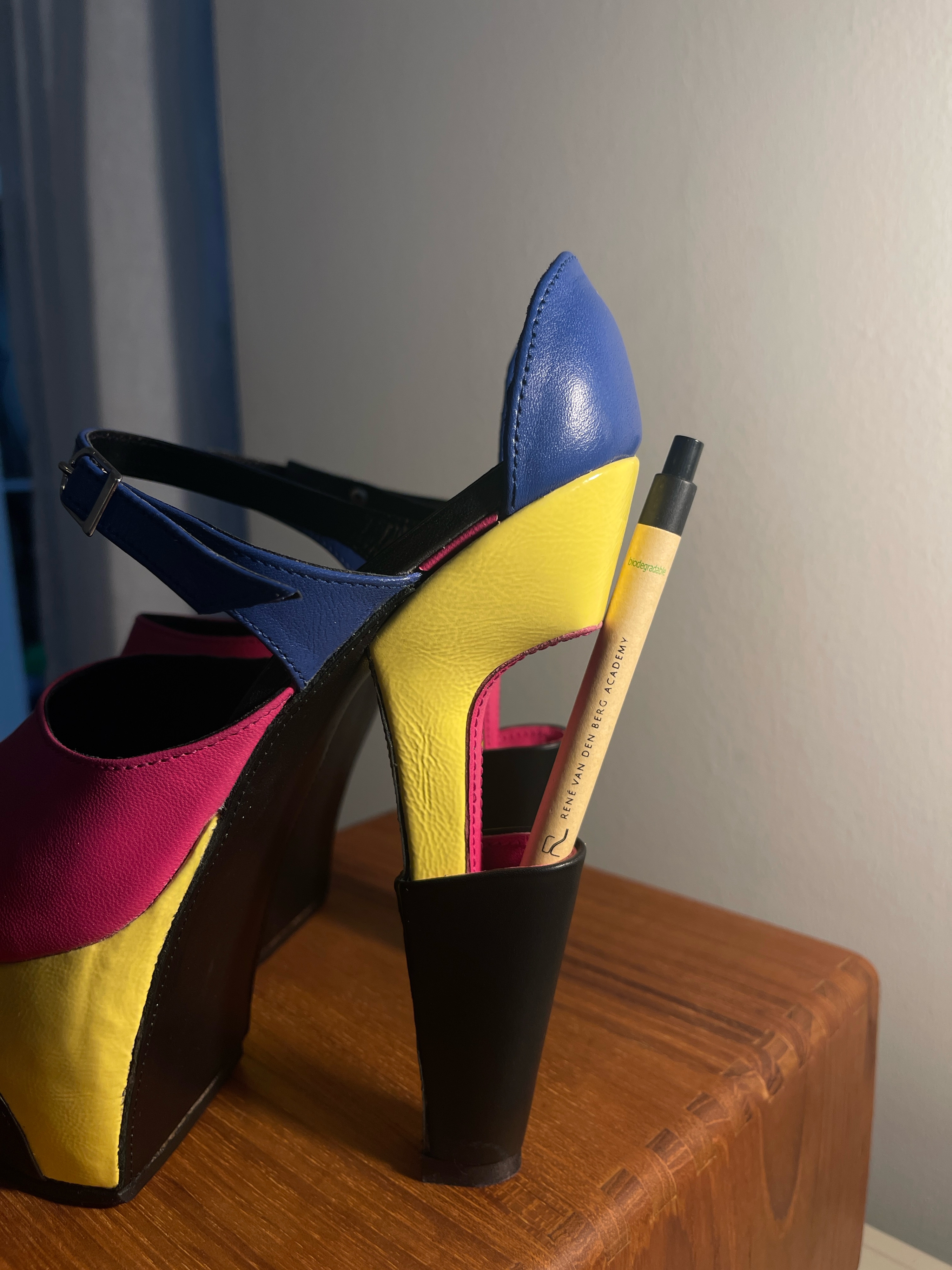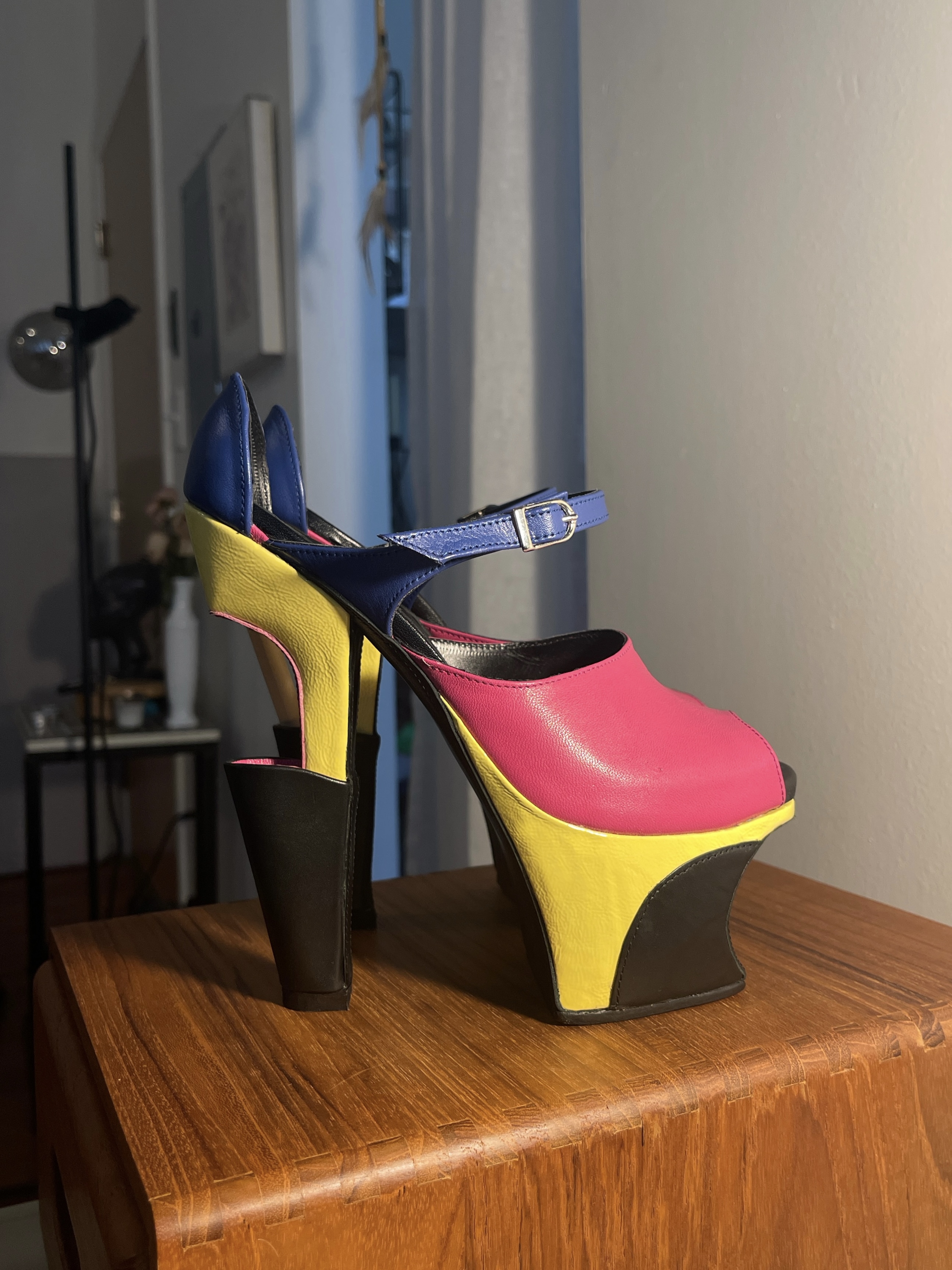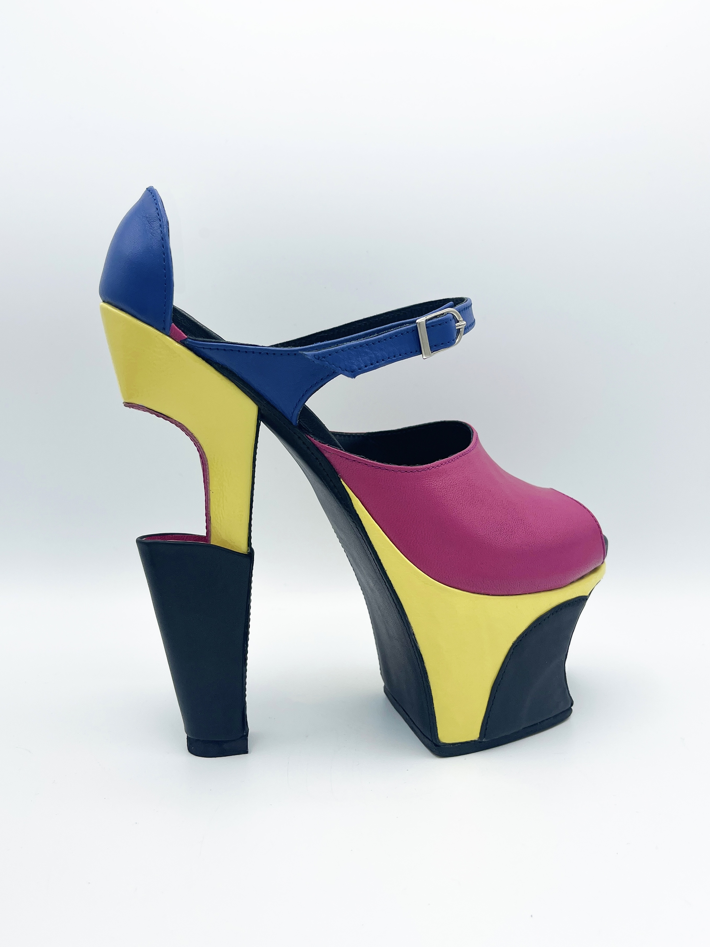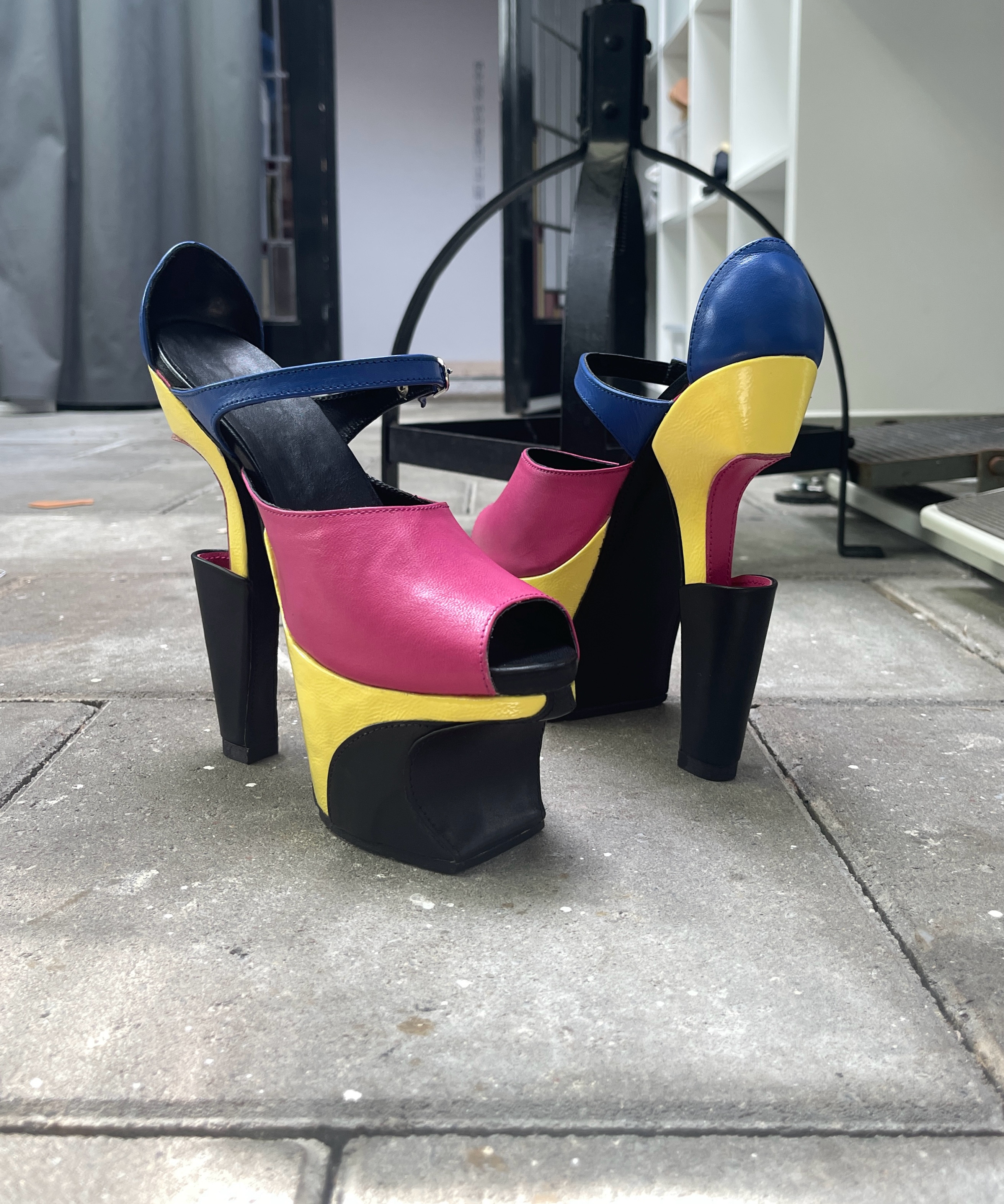 These heels are inspired by Mid Century Modern Scandinavian furniture. Highlighting the continuation of lines and sharp angles present throughout the design. The back portion of the heel is hollow and is intended to hold small objects, hence the name “flower vase”.