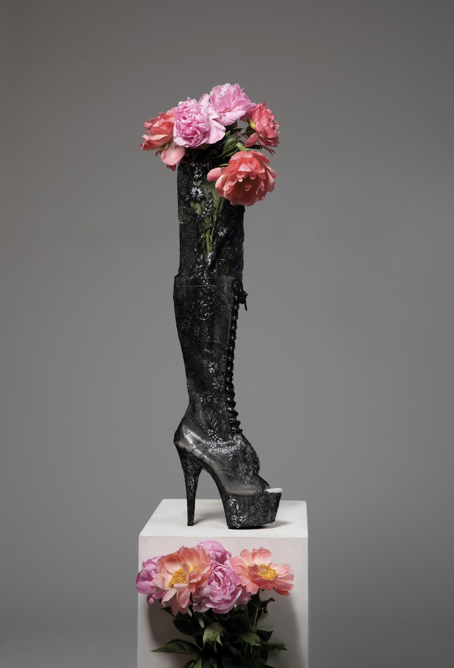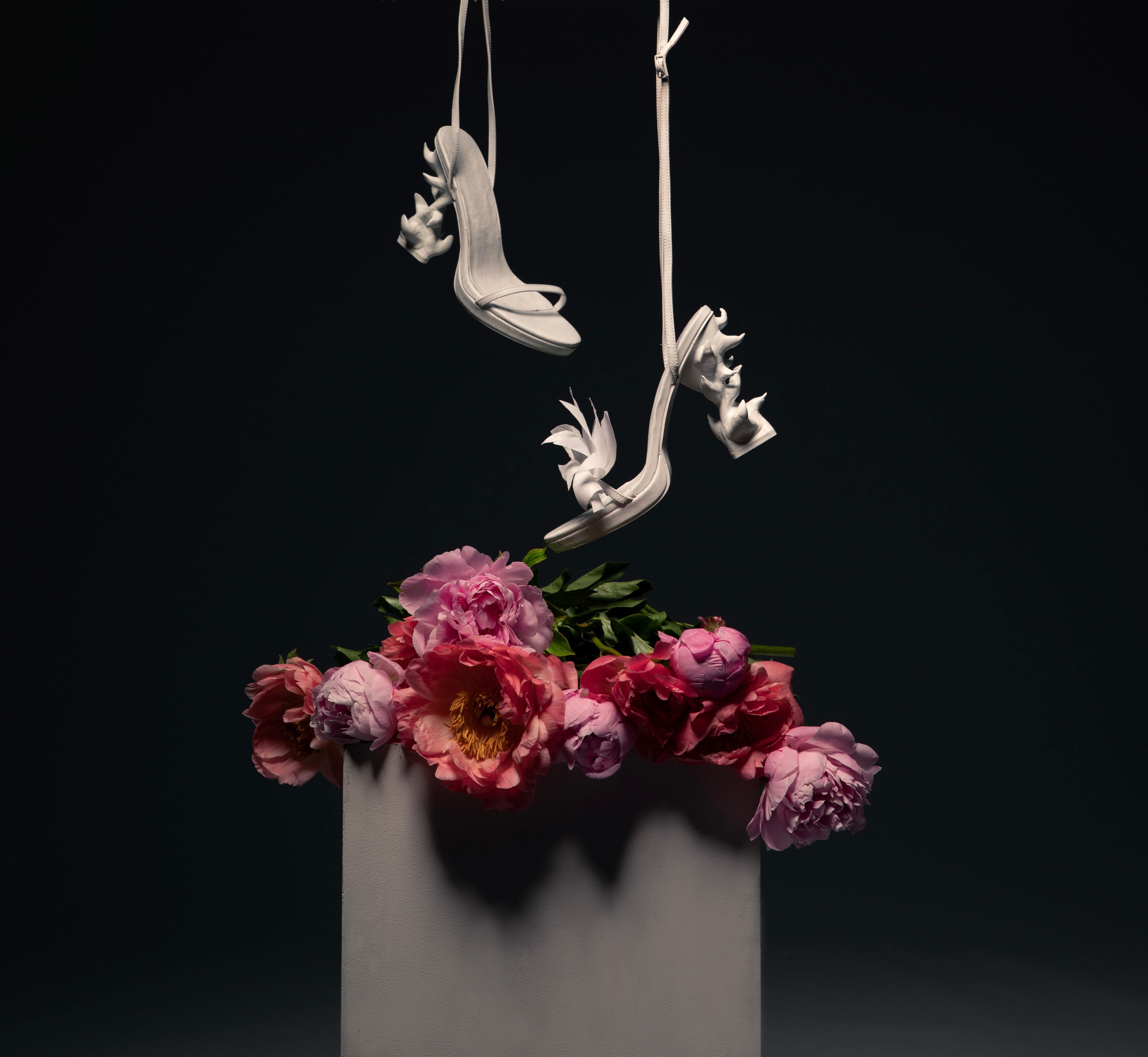 'Roots of Rebirth' explores the symbiosis of bio-materials and the artisanal craftsmanship of shoemaking through a collection that references the rebirth created by the contrast of the fragility and strength. The high-heeled sandal design captures the fragile yet sinister nature of the thorn and a newly blooming flower with blade-sharp petals. The heel and sole unit are made of bio plastic, encourages sustainable designs and prevents fashion waste. The pleaser boots bring a soft yet strong approach to femininity, rebirth from contrast. The design is produced with leftover materials- a revival.