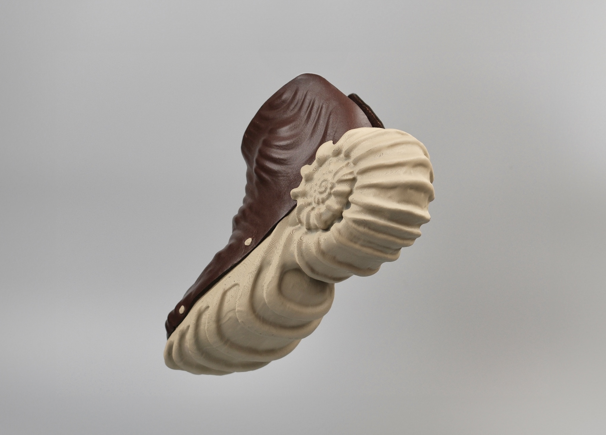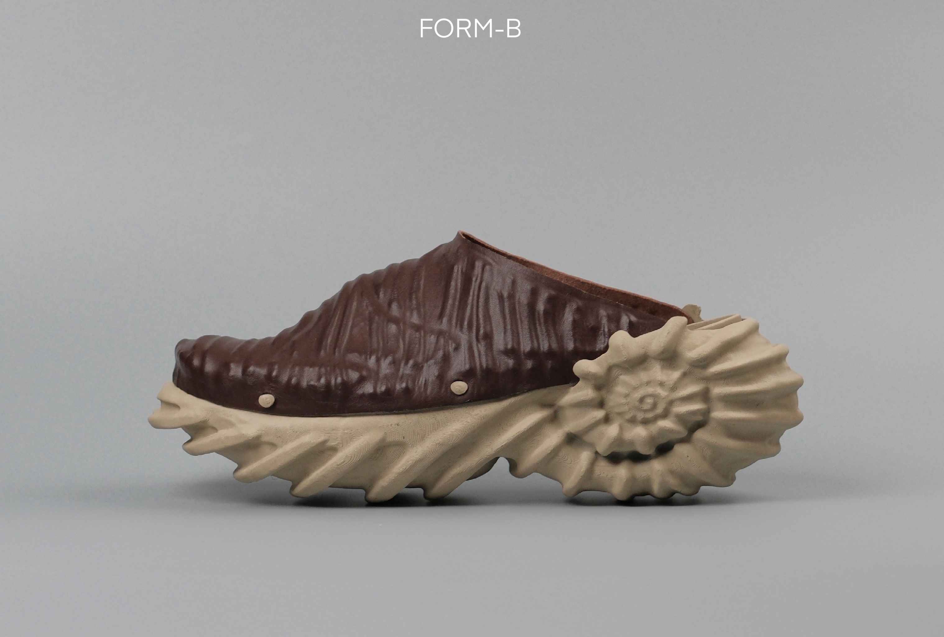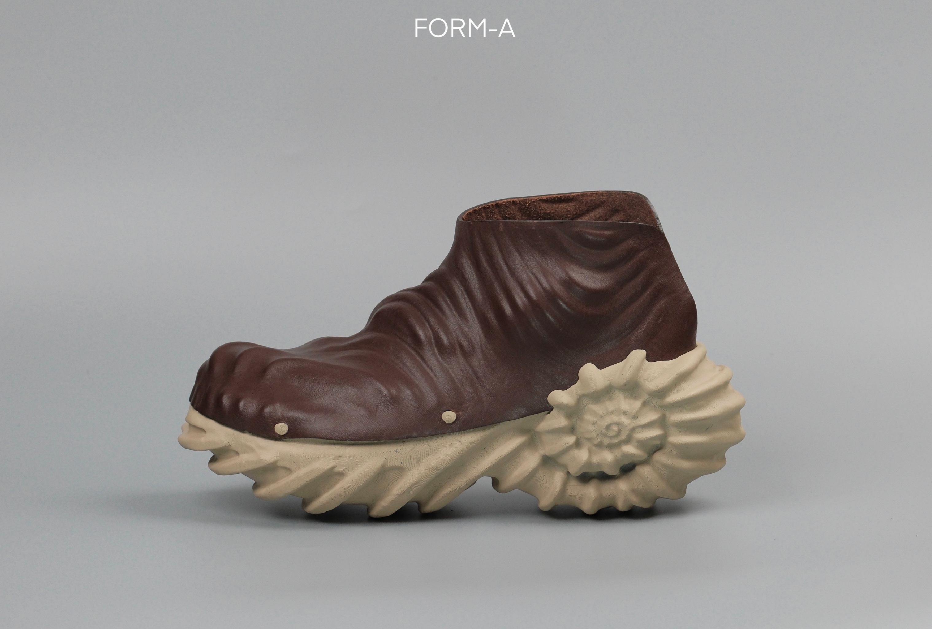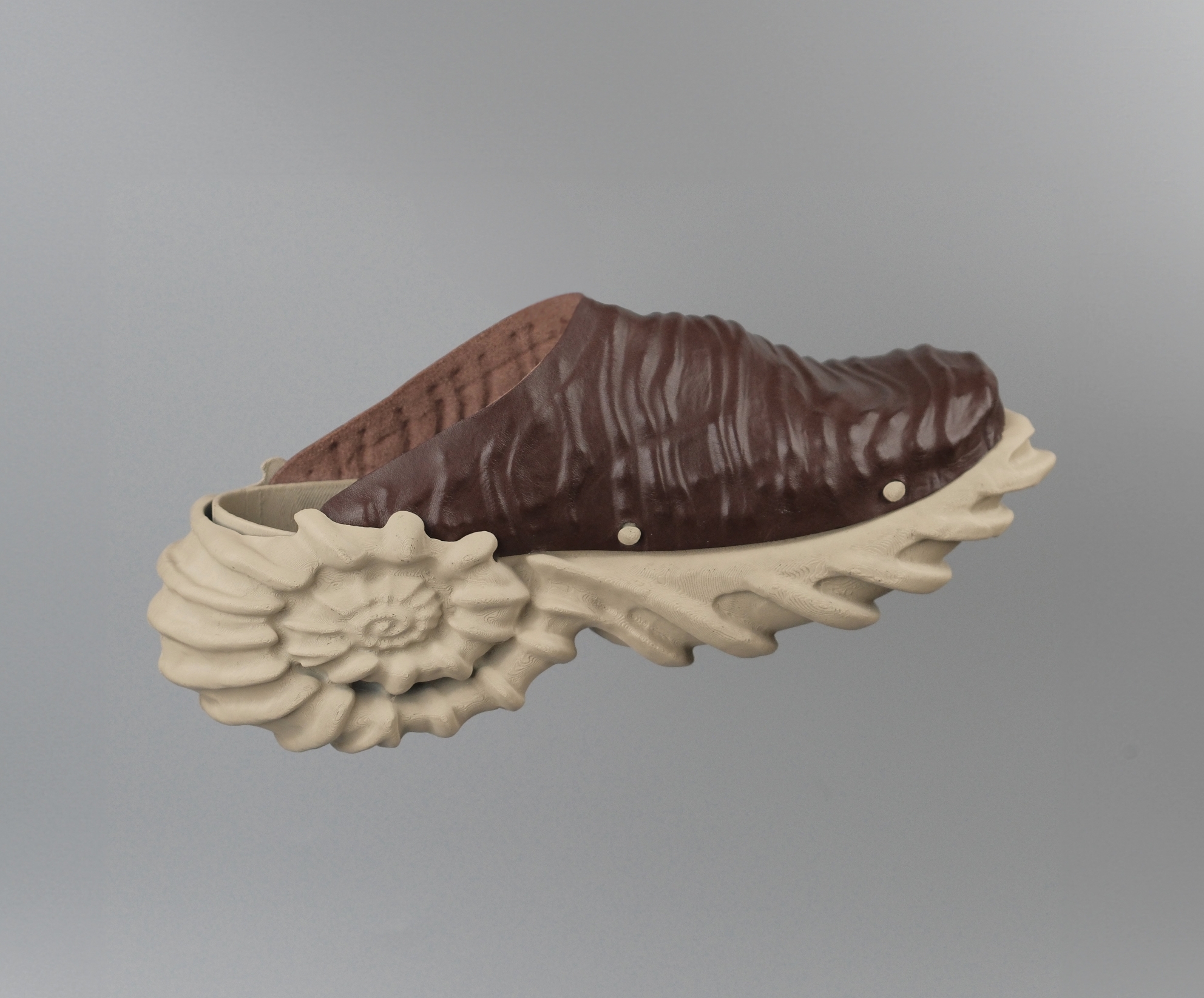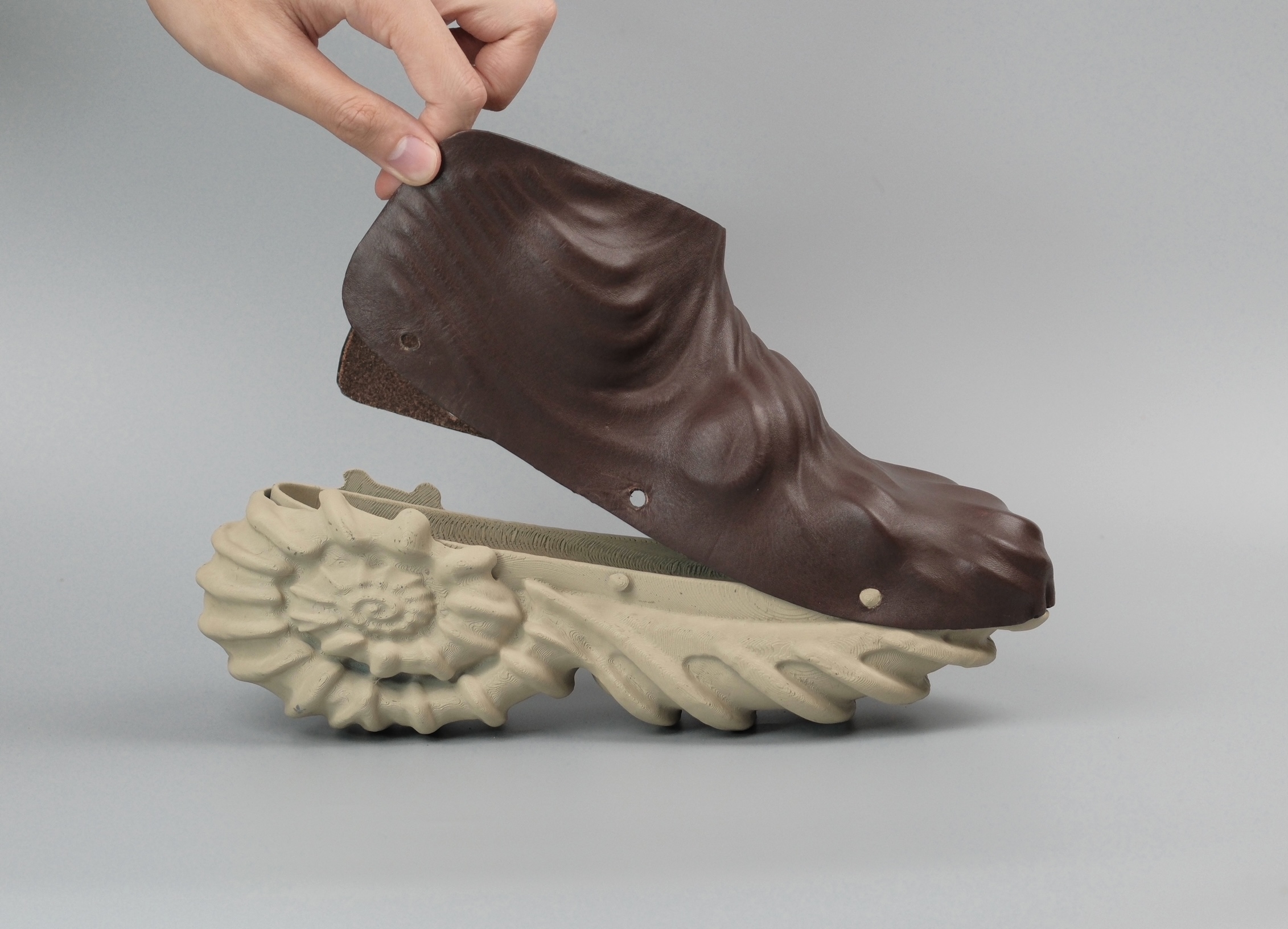 I conducted on-site collection of ammonite fossils and integrated their geometric aesthetics into the shoe sole design using 3D scanning technology, combined with parametric design and biodegradable 3D printing materials. The shoe upper features natural organic textures, reinterpreted through the leather wet-molding technique.