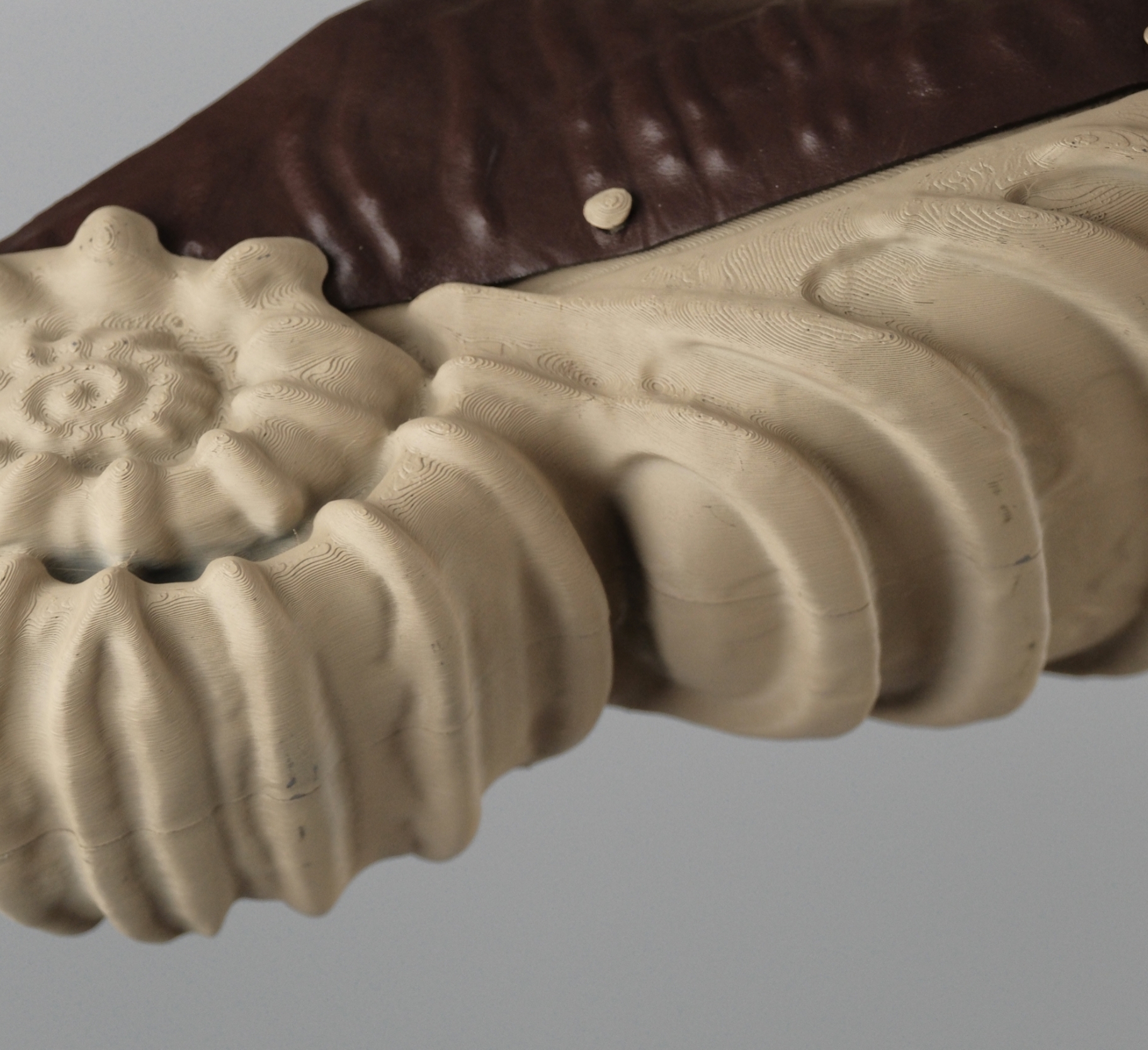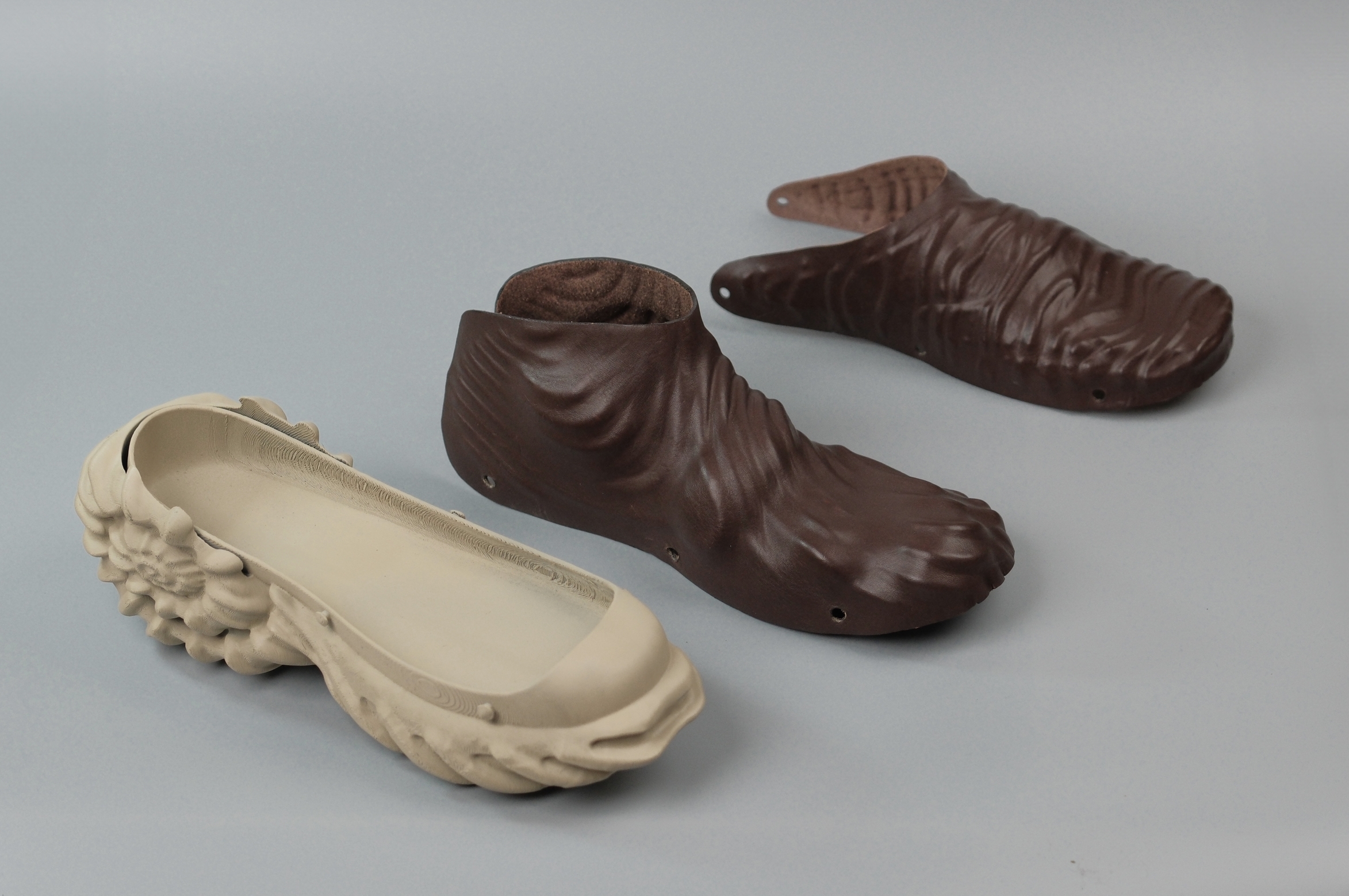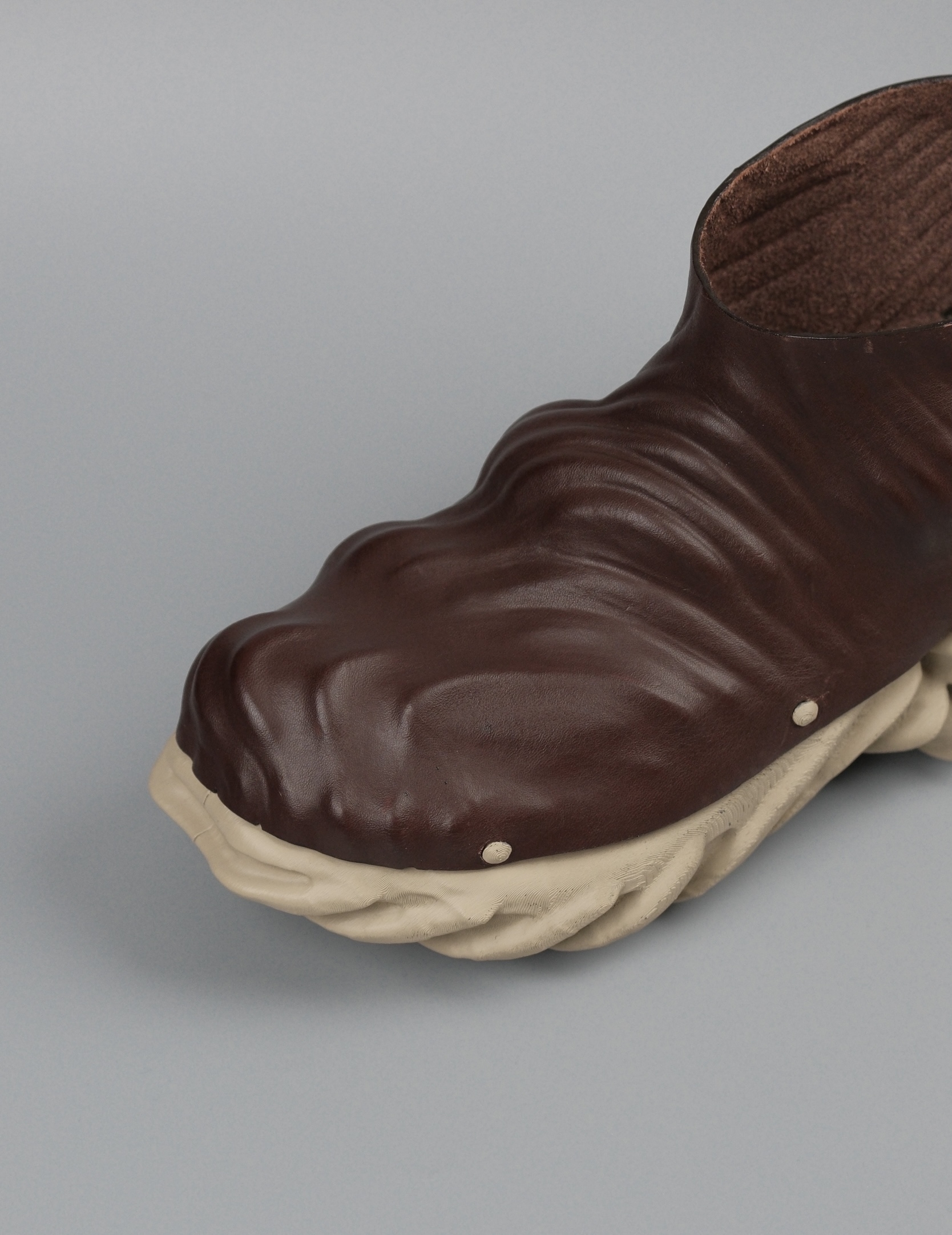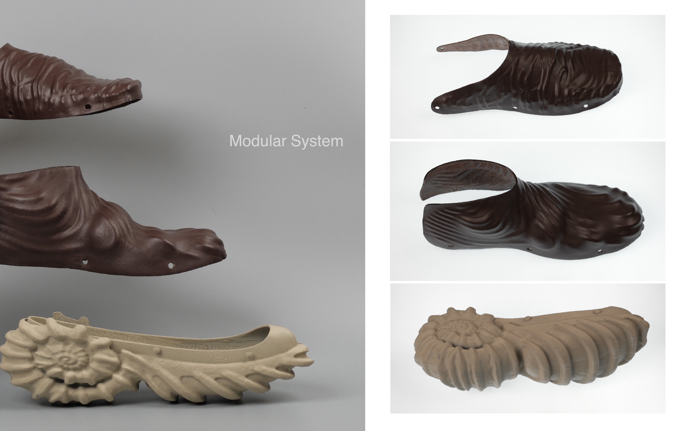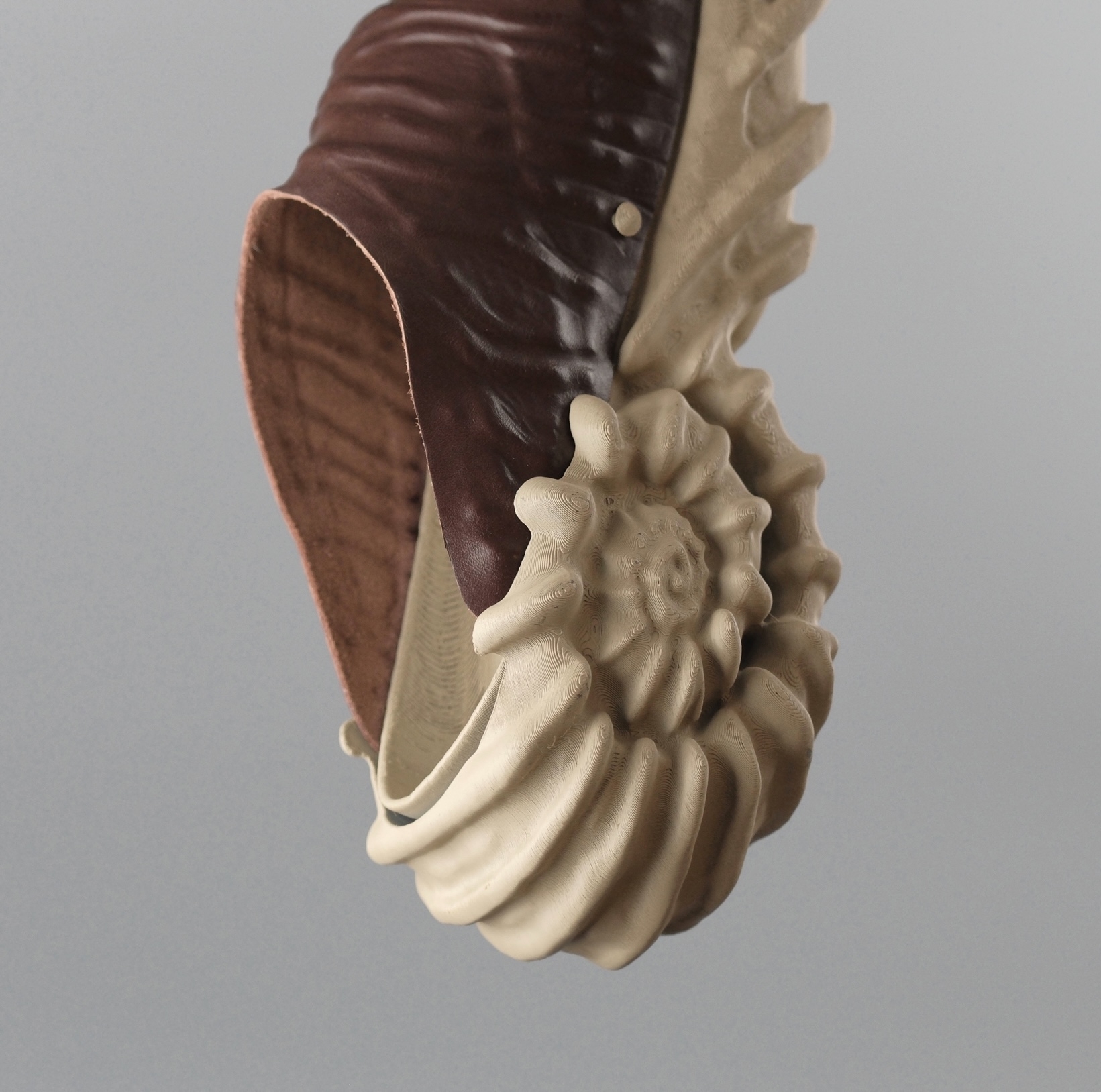 I conducted on-site collection of ammonite fossils and integrated their geometric aesthetics into the shoe sole design using 3D scanning technology, combined with parametric design and biodegradable 3D printing materials. The shoe upper features natural organic textures, reinterpreted through the leather wet-molding technique.