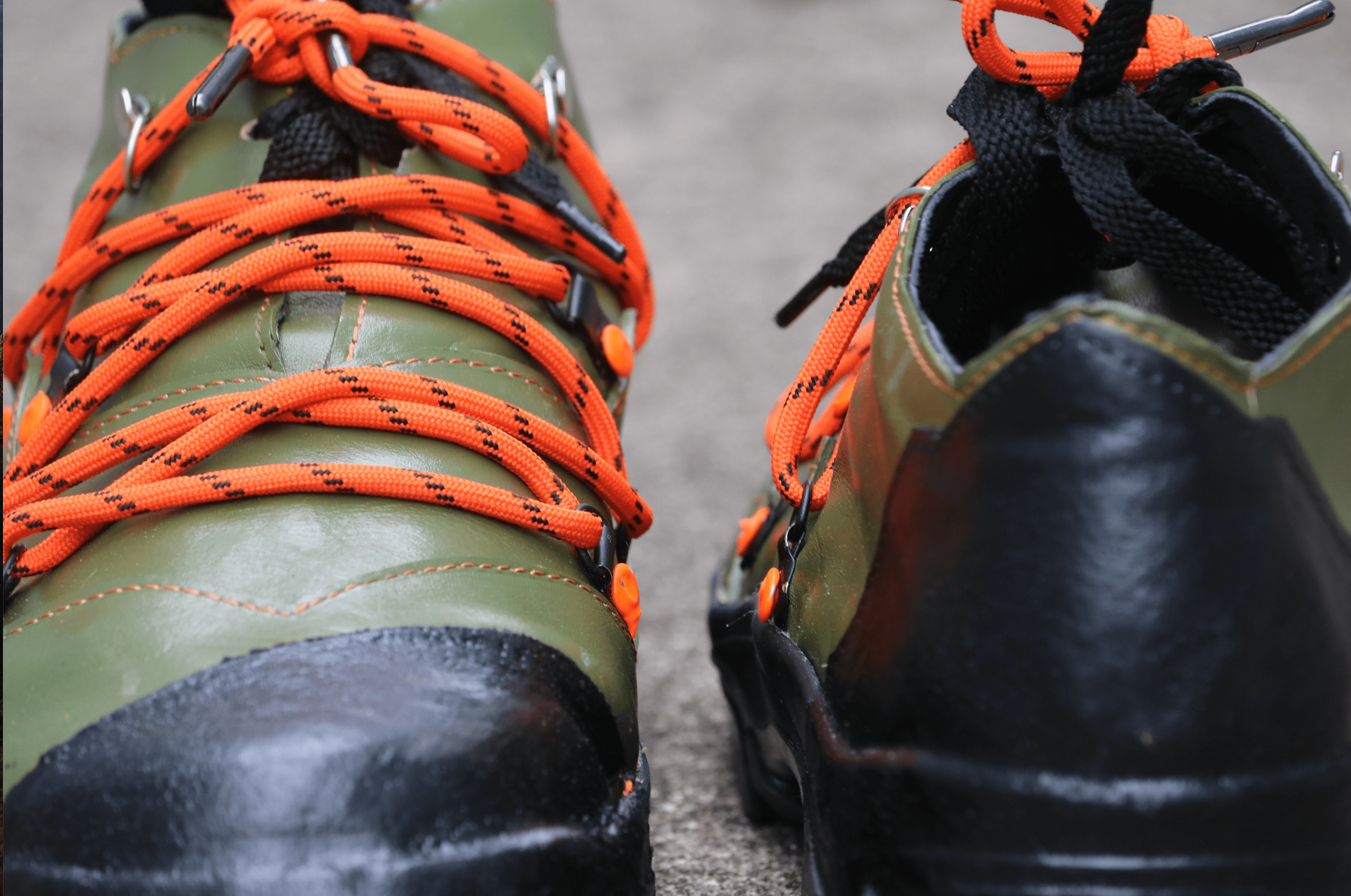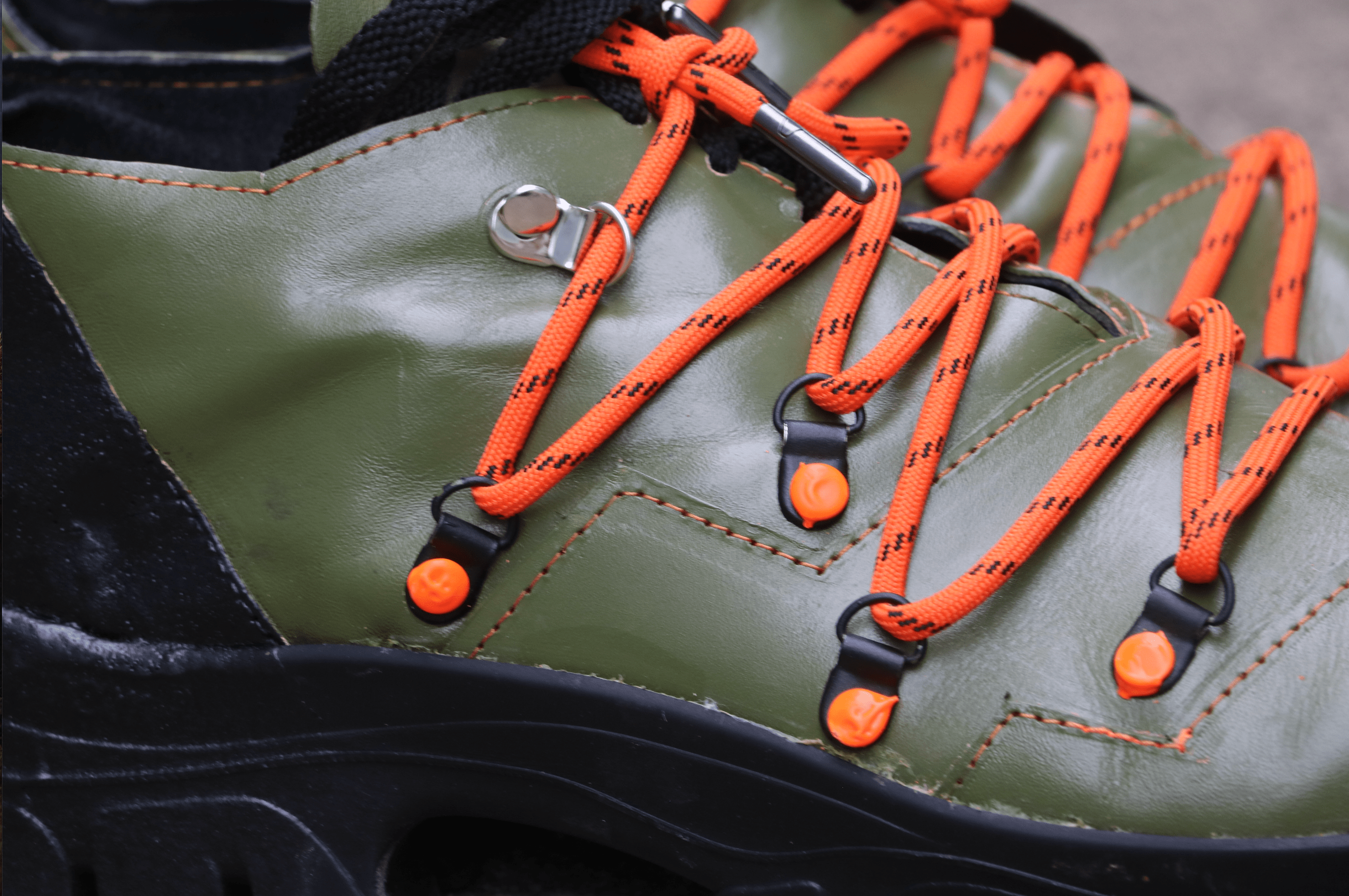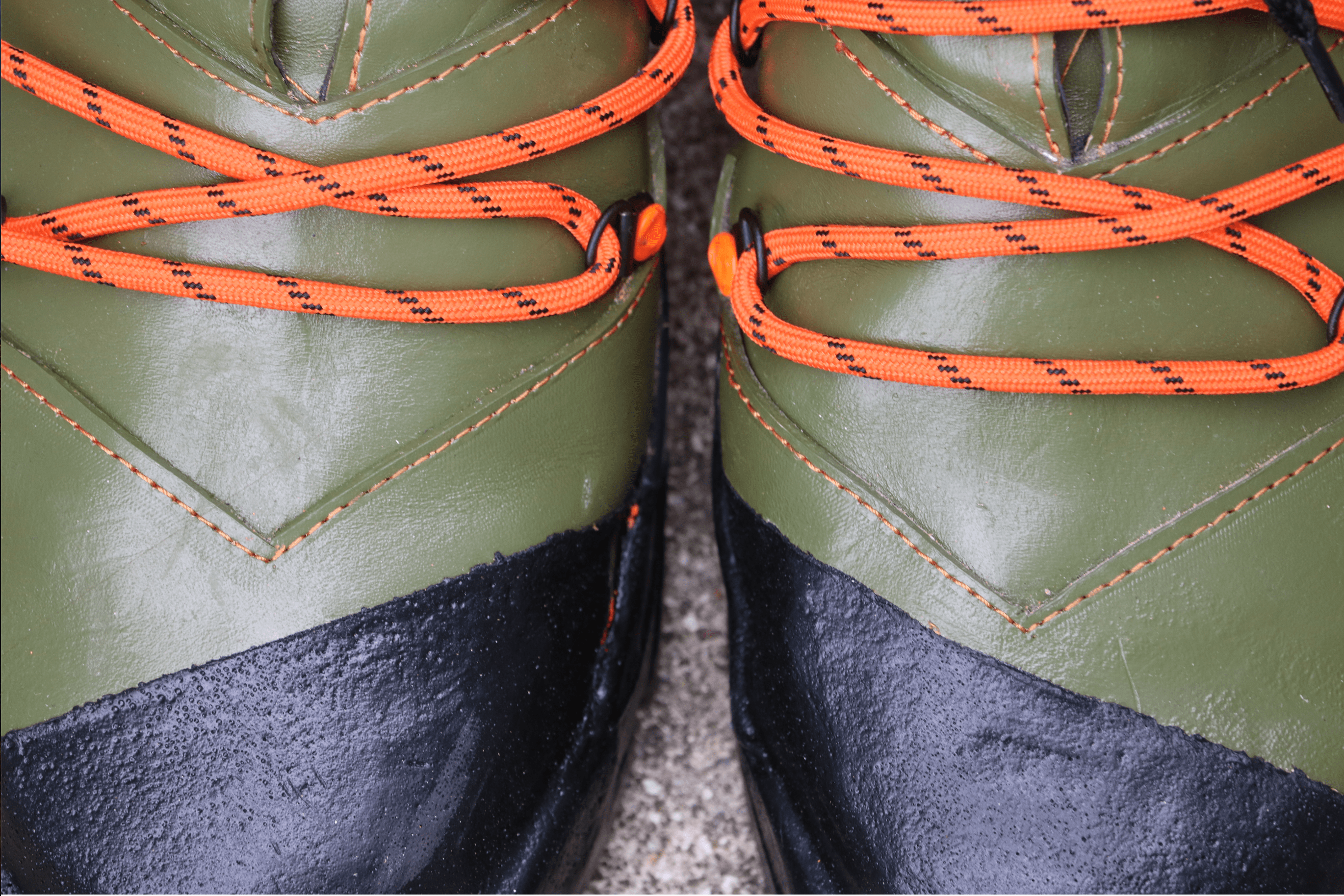 A modern twist on a classic style, the Digi-Spike oxford is inspired by the angularity of fighter aircraft as well as the colors of military camo. The Digi-Spike is made of a veg-tan upper, pig suede lining, Vibram soling as well as Plasti-Dip and Flex Seal.