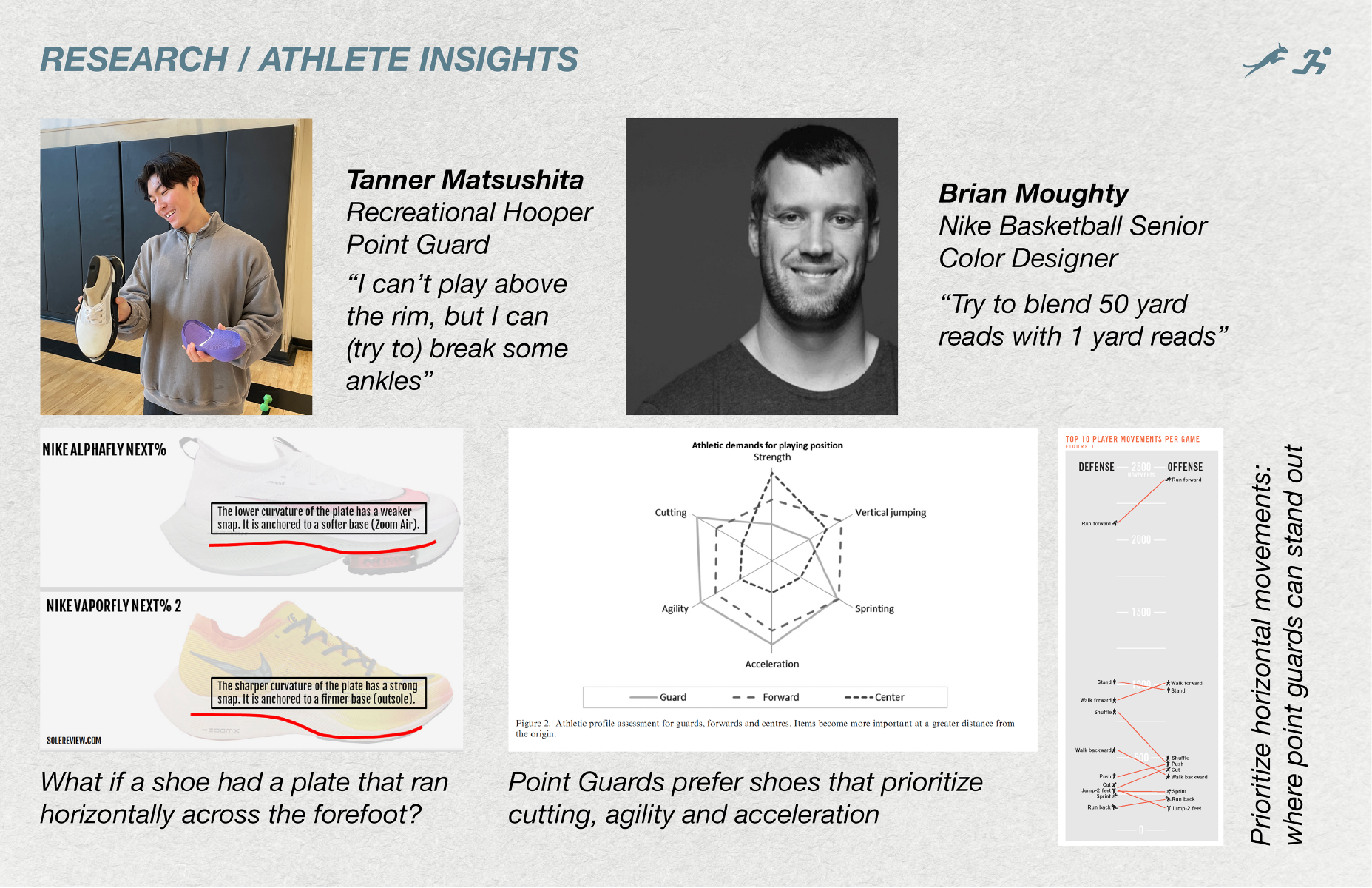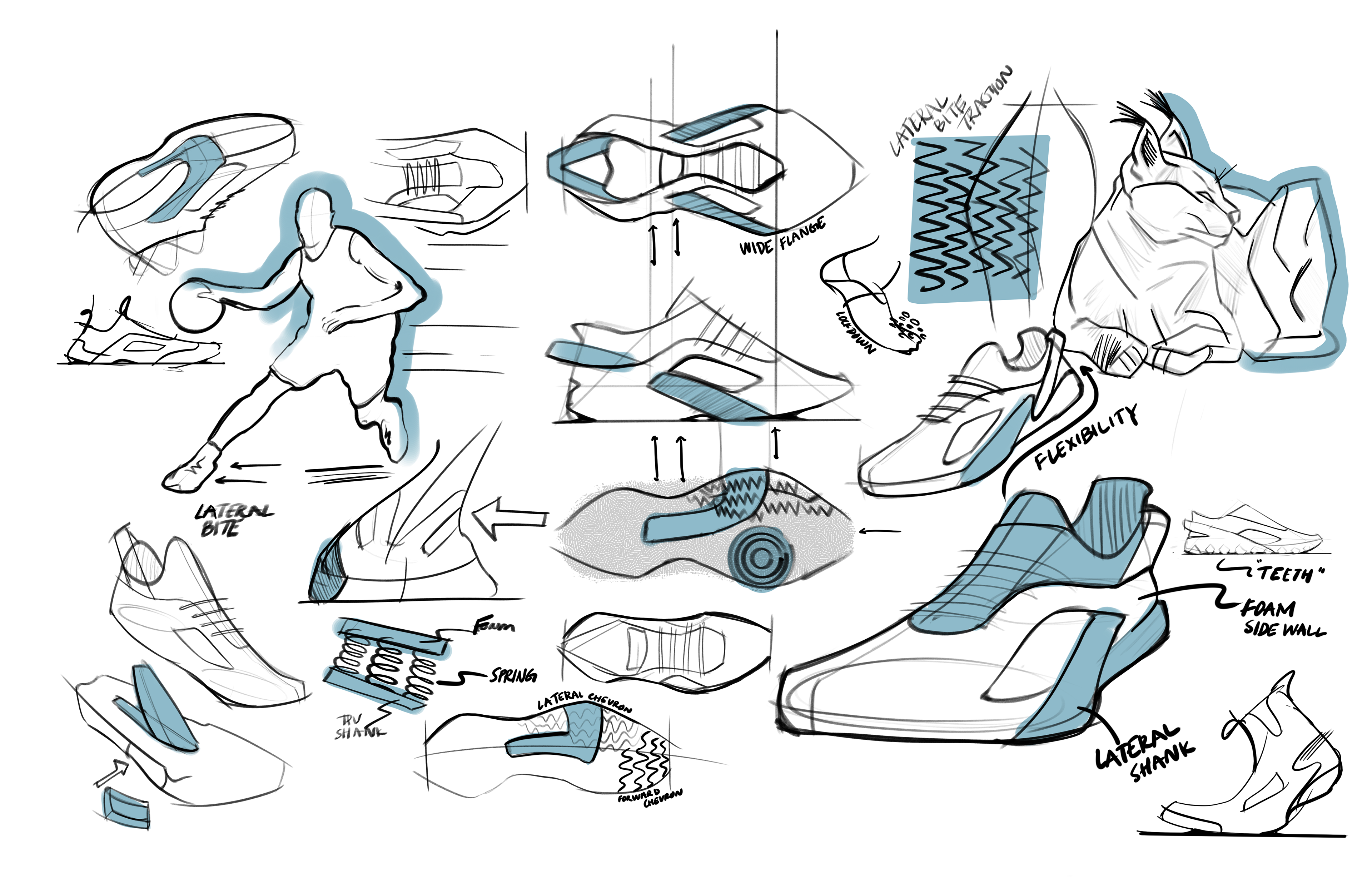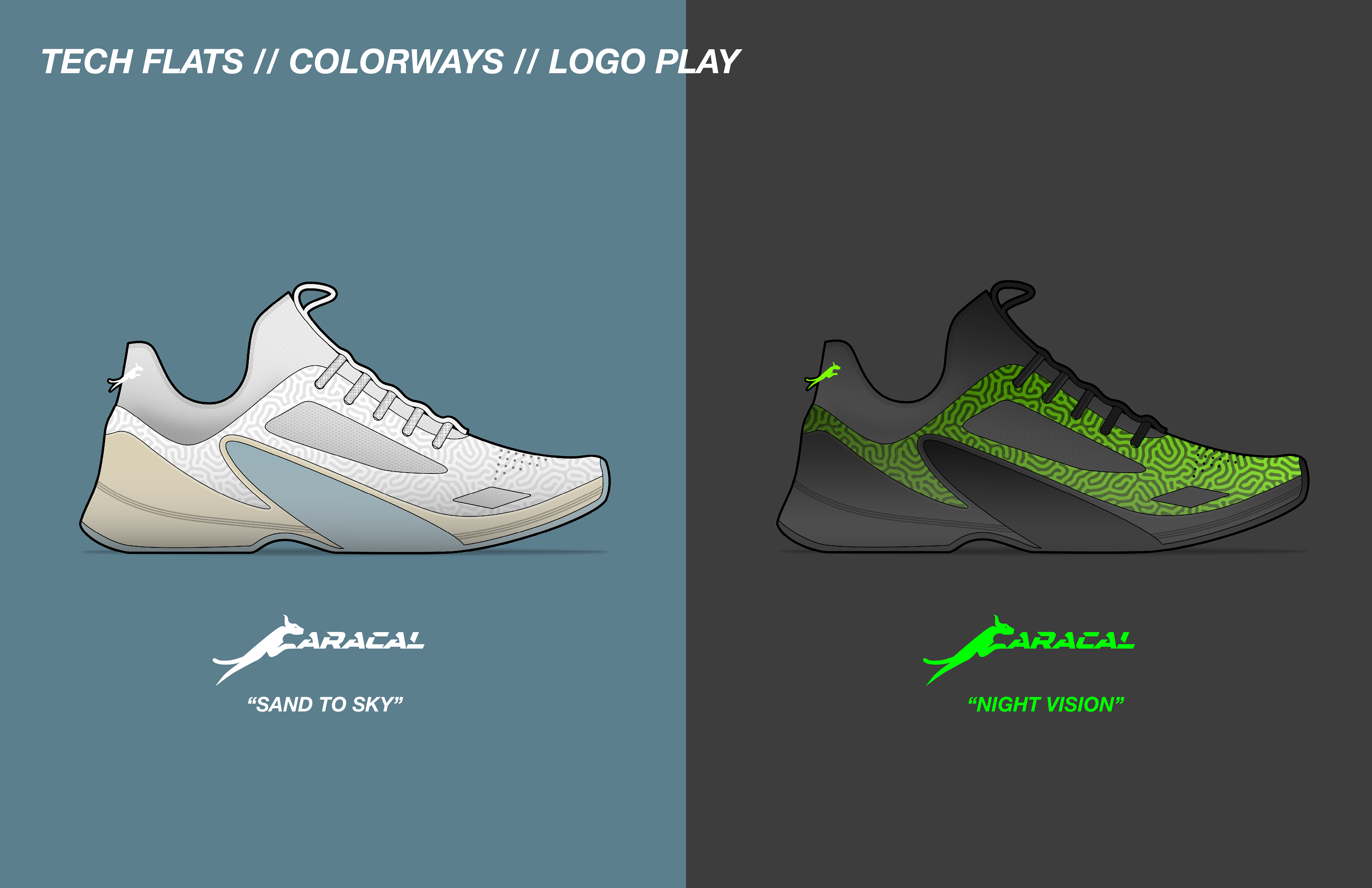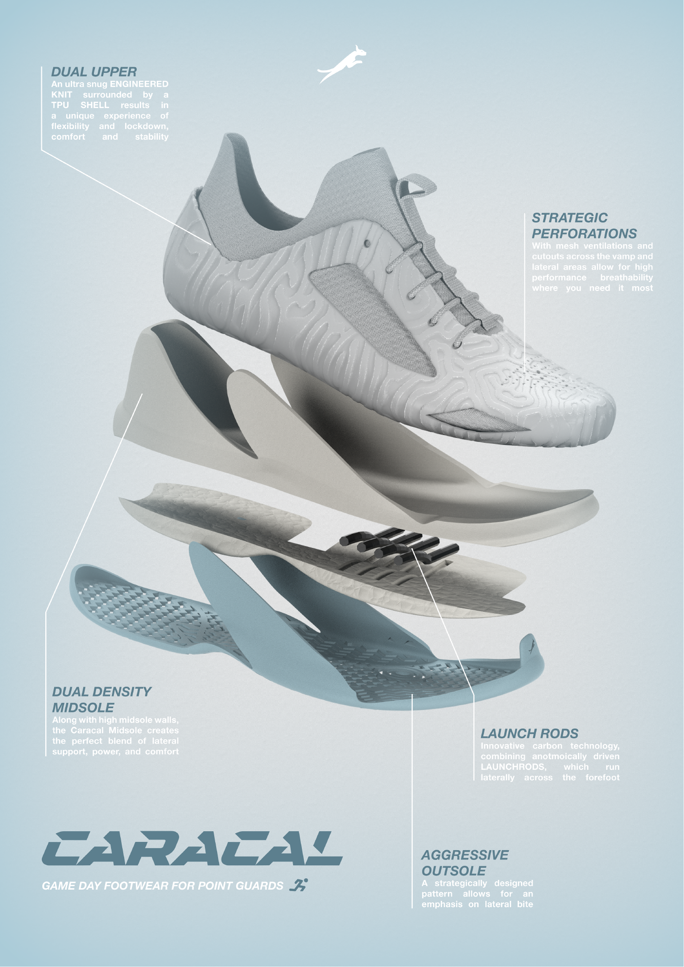 CARACAL is a game day basketball shoe designed for point guards. Designed with lateral rods embedded across the forefoot of the midsole, CARACAL emphasizes lateral explosive movements. CARACAL mimics modern "super shoe" carbon plate technology but rotates the user's force horizontally.