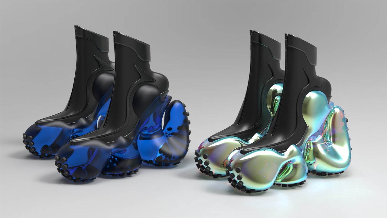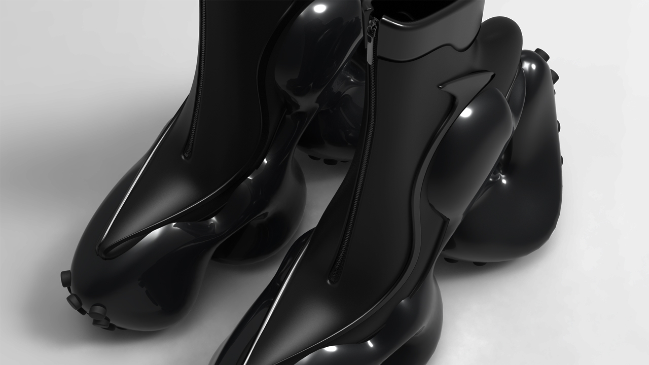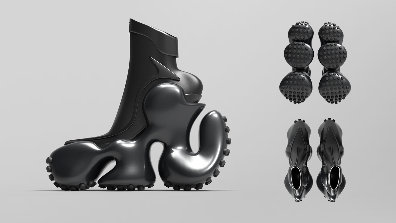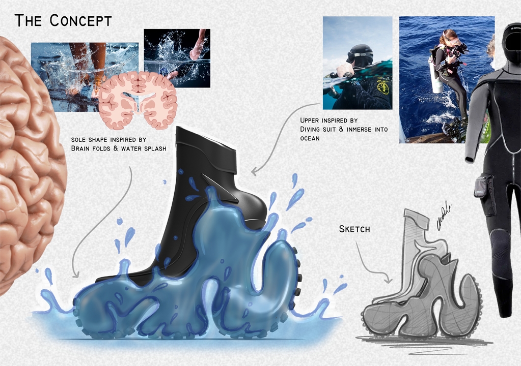 I seek to change the classic form of platform and women's heels, looking for innovation in shape and the exploration of a new type of original sole. For the concept I was inspired by a personal philosophy in which I see the mind as a deep ocean, full of ideas and thoughts to be discovered. The upper symbolises a diver's suit, the foot as a diver going into the water in search of discovering the depths of the mind to new ideas, foot's submerging into the sole water. The shape of the platform is a conceptual representation of water and brain folds, comparing the brain to an ocean.
