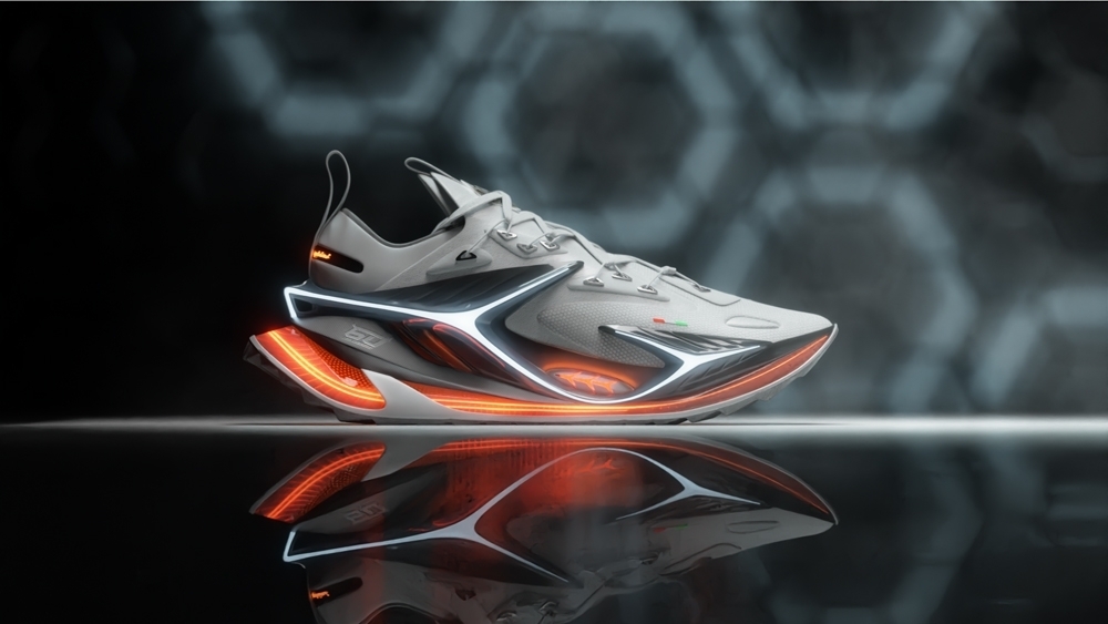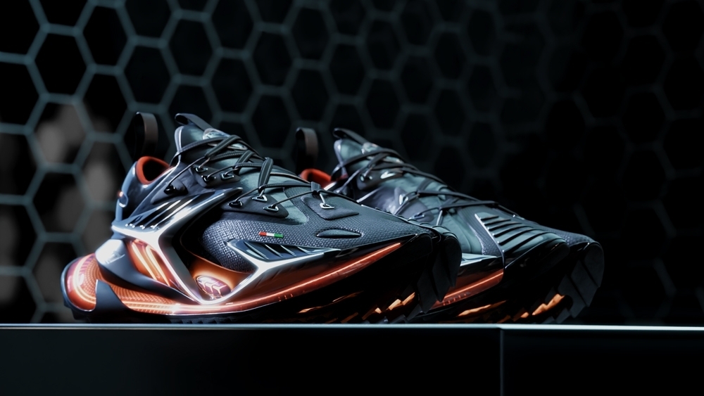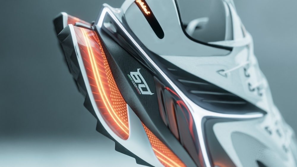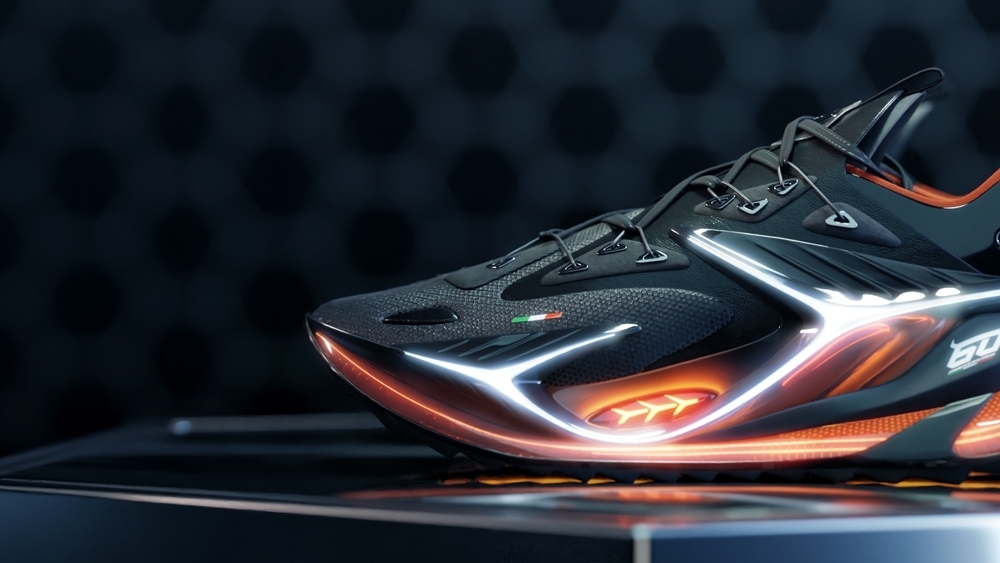 The shoe design features intricate details such as neon lights and vents, similar to those found in the luxury sports car, providing a unique and innovative look. The project offers a fresh take on footwear design, bringing together the elements of high-end fashion and automotive design.