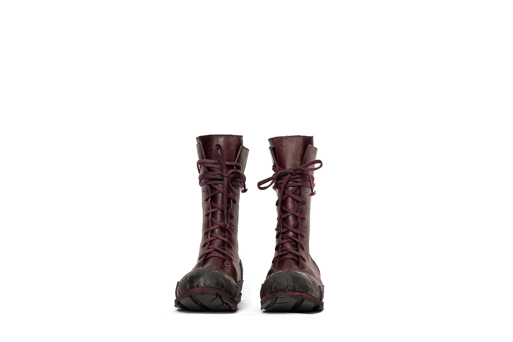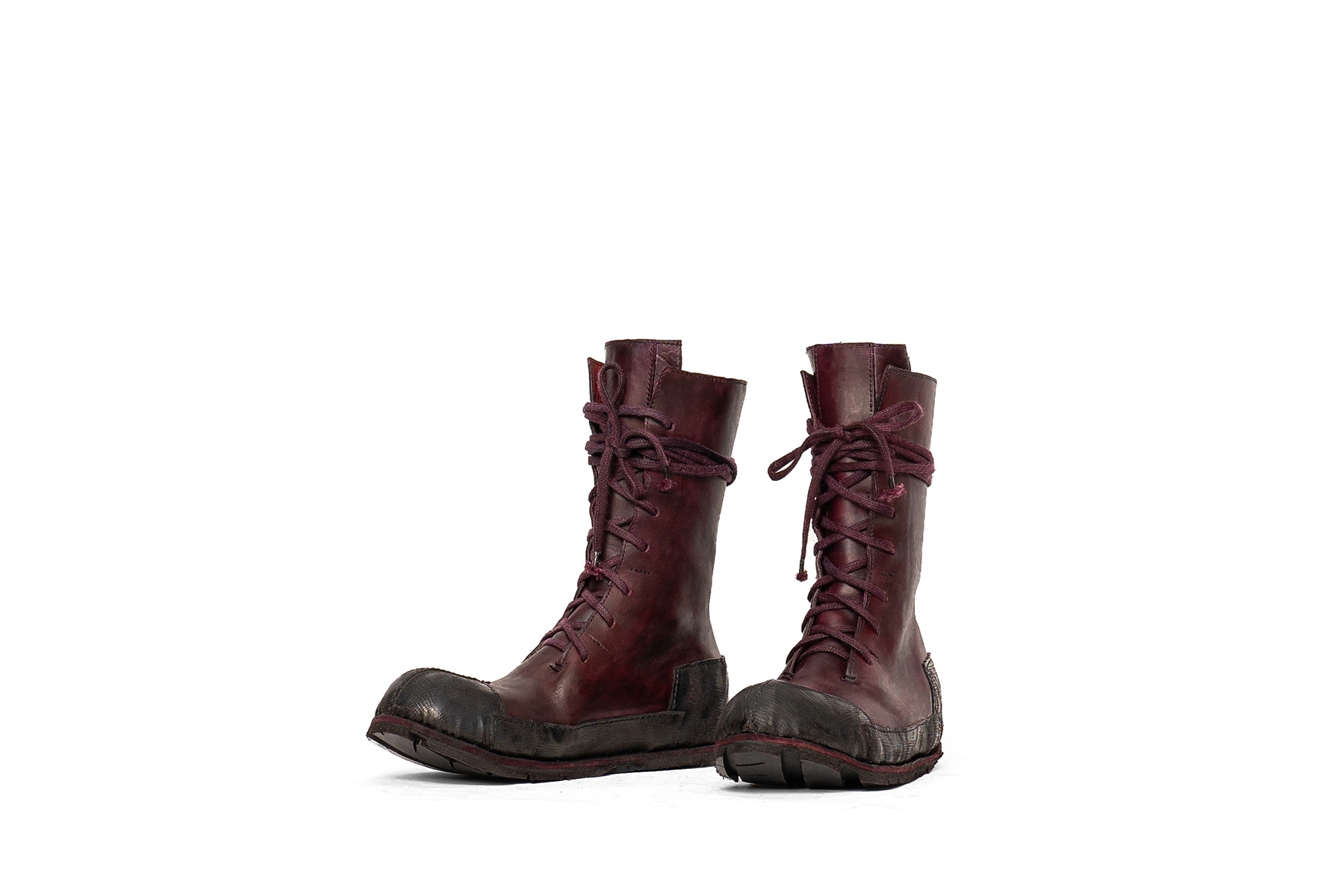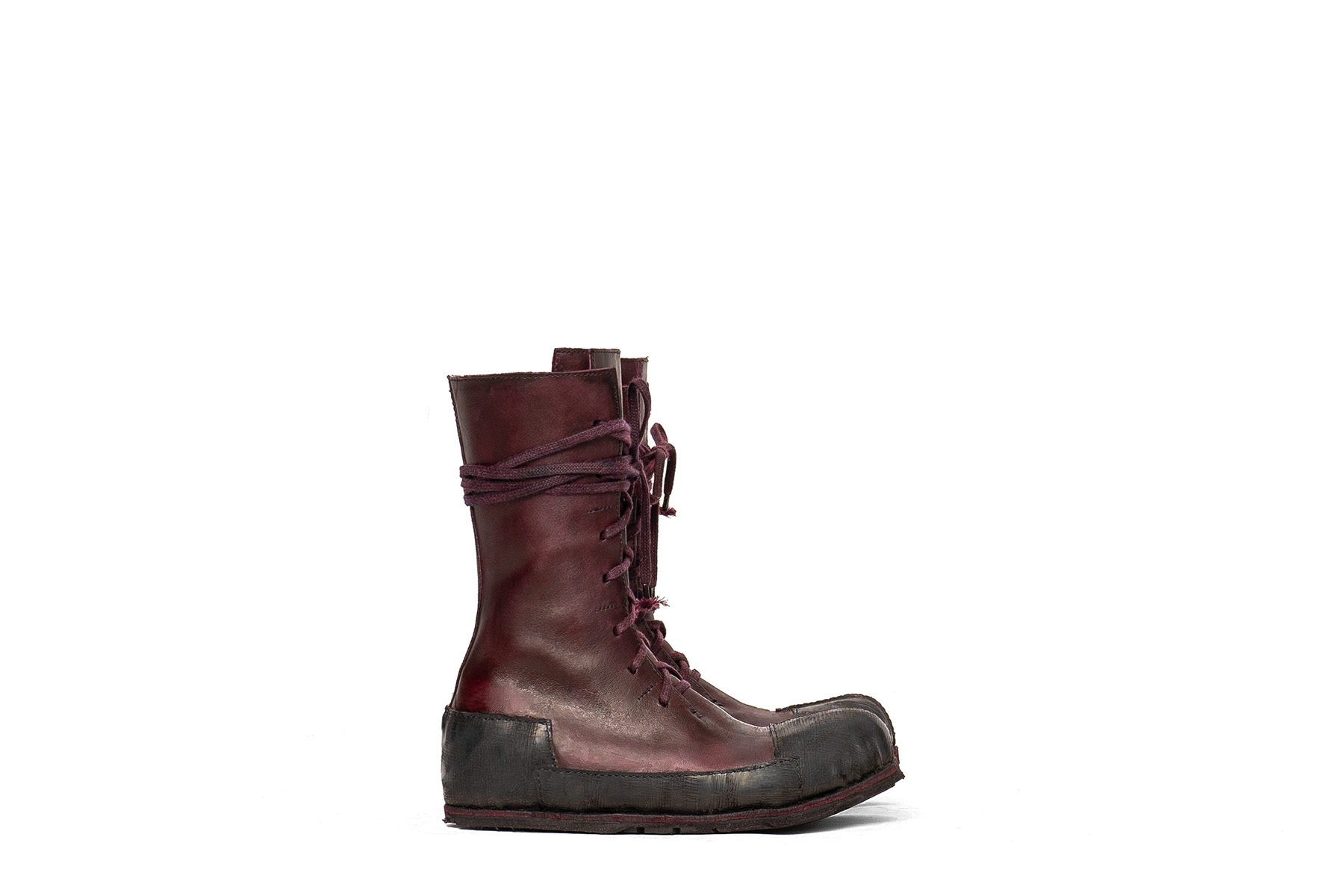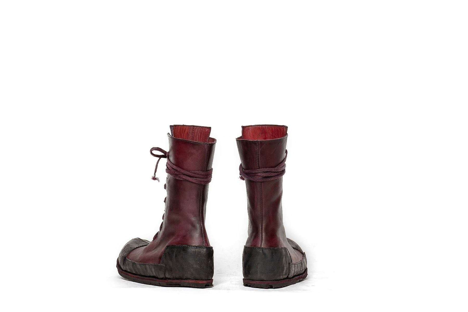Unisex tall lace-up sneakers crafted from hand-painted culatta horse leather in deep red and burgundy tones. Featuring a smooth calf lining, Blake stitch sole construction, and a leather and rubber sole for added durability. A design-forward piece blending rugged texture with sleek lines.