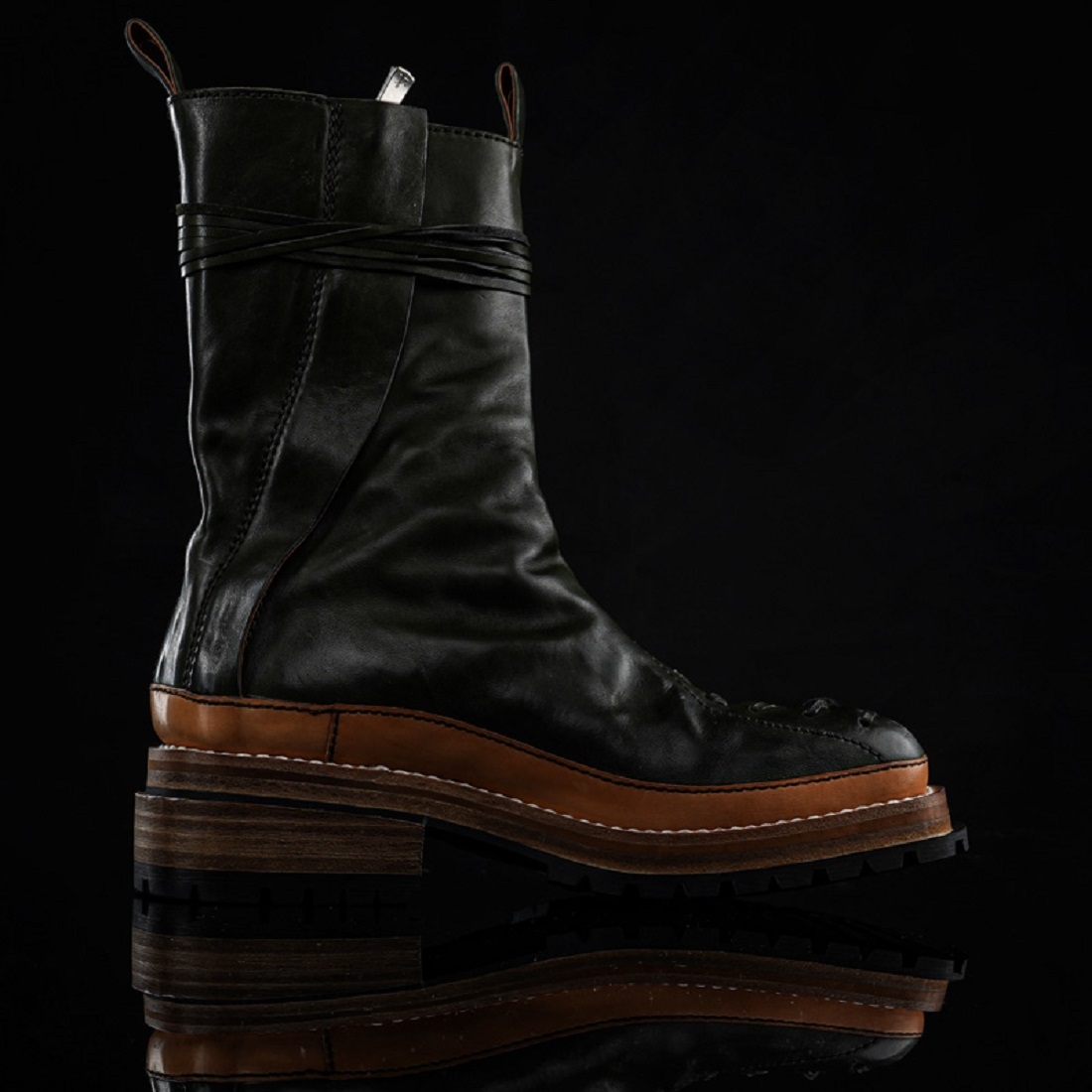 "Death Entanglement" is a deeply philosophical footwear piece crafted from premium Italian calfskin, featuring full handmade Goodyear welt stitching. The designer employs the "Square and Circle" philosophy, presenting a unique contrast between the square toe and the round heel, symbolizing the dualities and harmonies in our lives.
