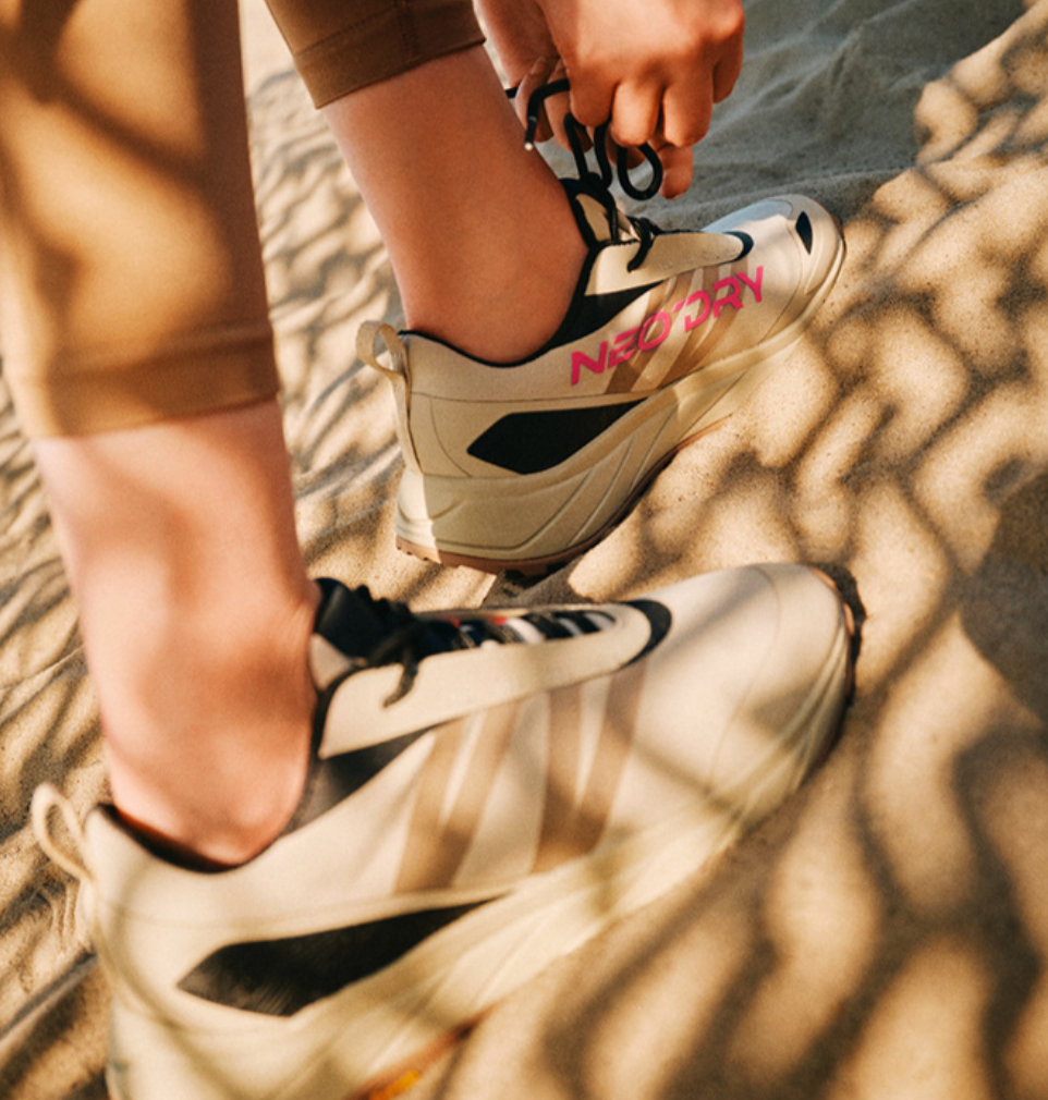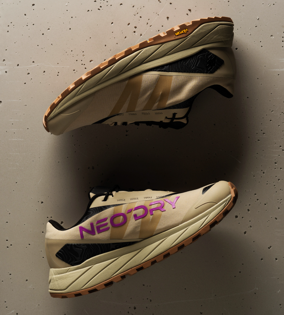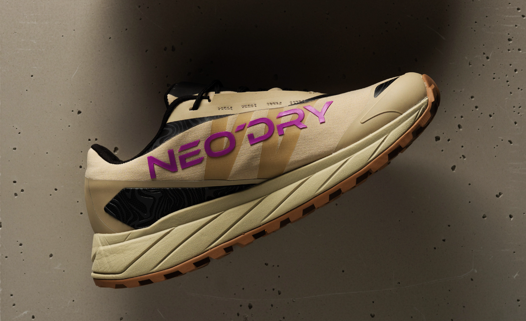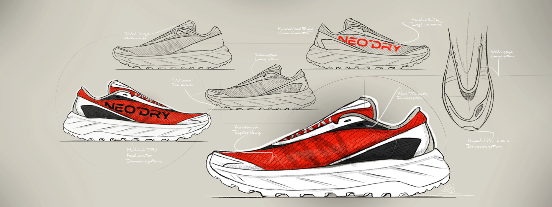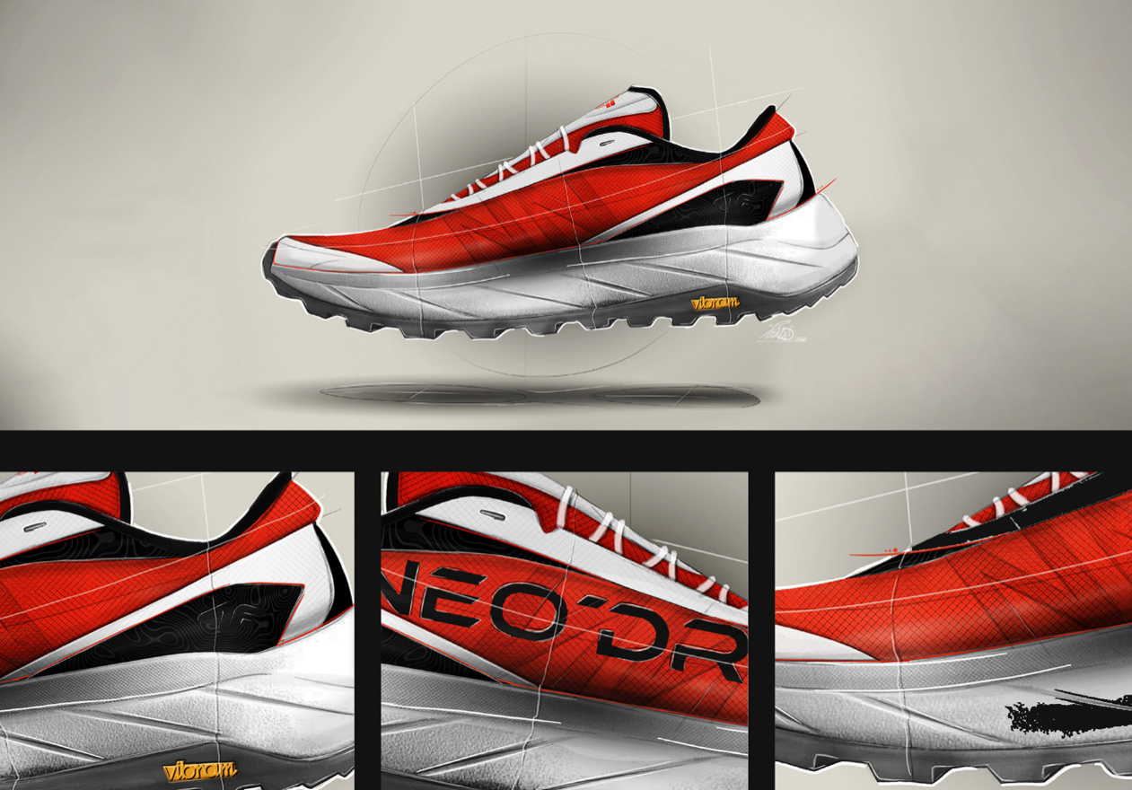BLADE is a trail running shoe built for durability, inspired by the process of crafting a Damascus blade. The design mimics the layering and fusing technique, incorporating patterns formed during forging. Materials like Vibram outsole, ripstop, and hard reinforcements were key from the start. The challenge was balancing a sharp, bold design with simplicity, leading to the addition of the Damascus blade pattern and a visible NeoDry logo. A rubber-molded heel counter was critical, but after initial testing, adjustments were made to ensure optimal performance and construction.