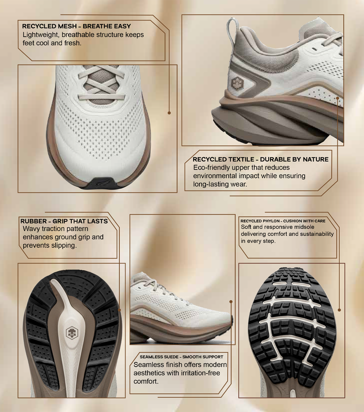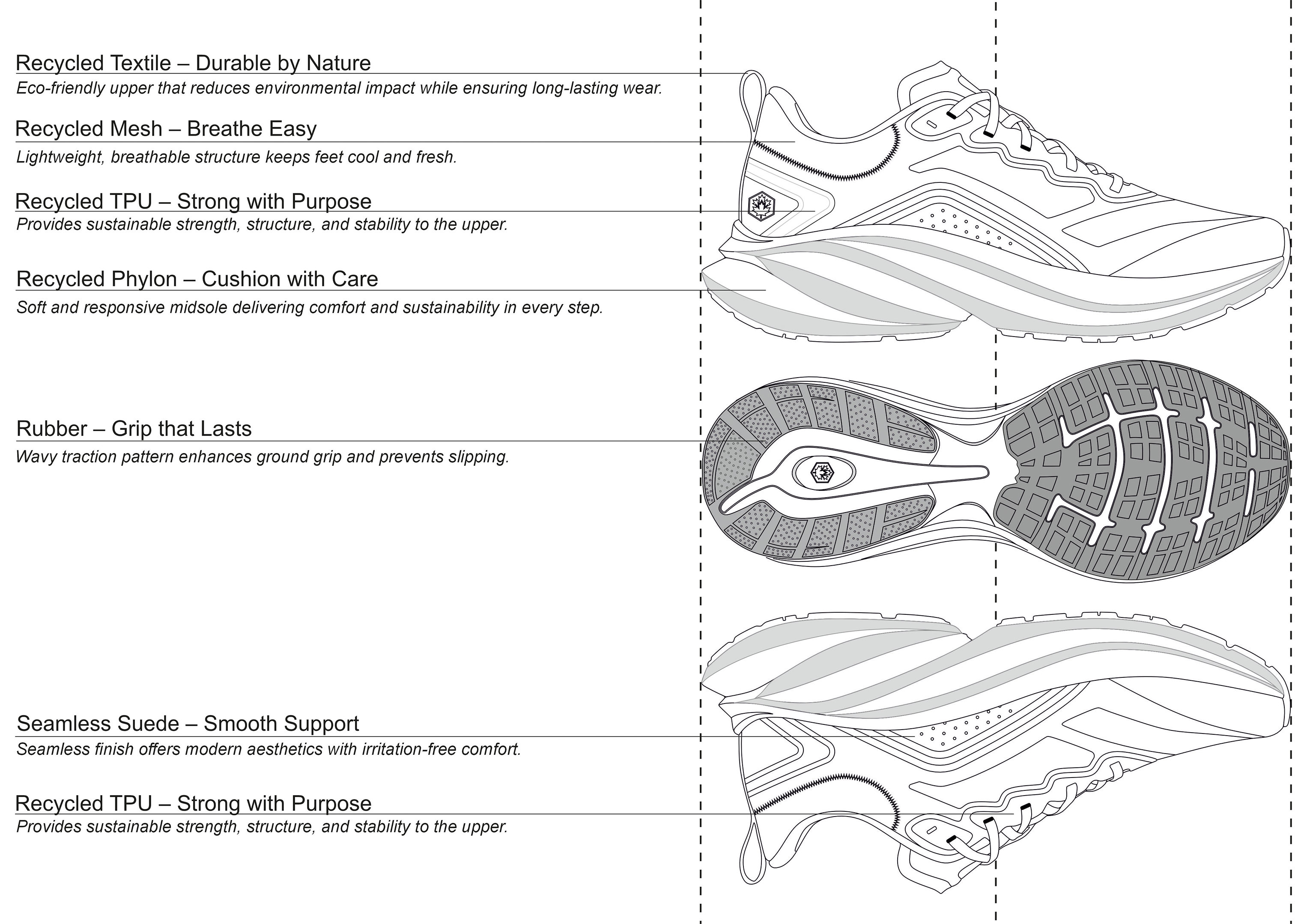 Shaped by the shifting dunes, SANDORA captures the spirit of desert running. Its breathable upper is crafted from recycled mesh yarns, delivering lightweight comfort and ventilation. The sculpted phylon midsole, also recycled, channels natural dune geometry to return energy with every stride. Warm sand-inspired tones connect performance with nature, while its sustainable build reflects Lumberjack’s vision: a running shoe where speed, resilience, and responsibility move as one.