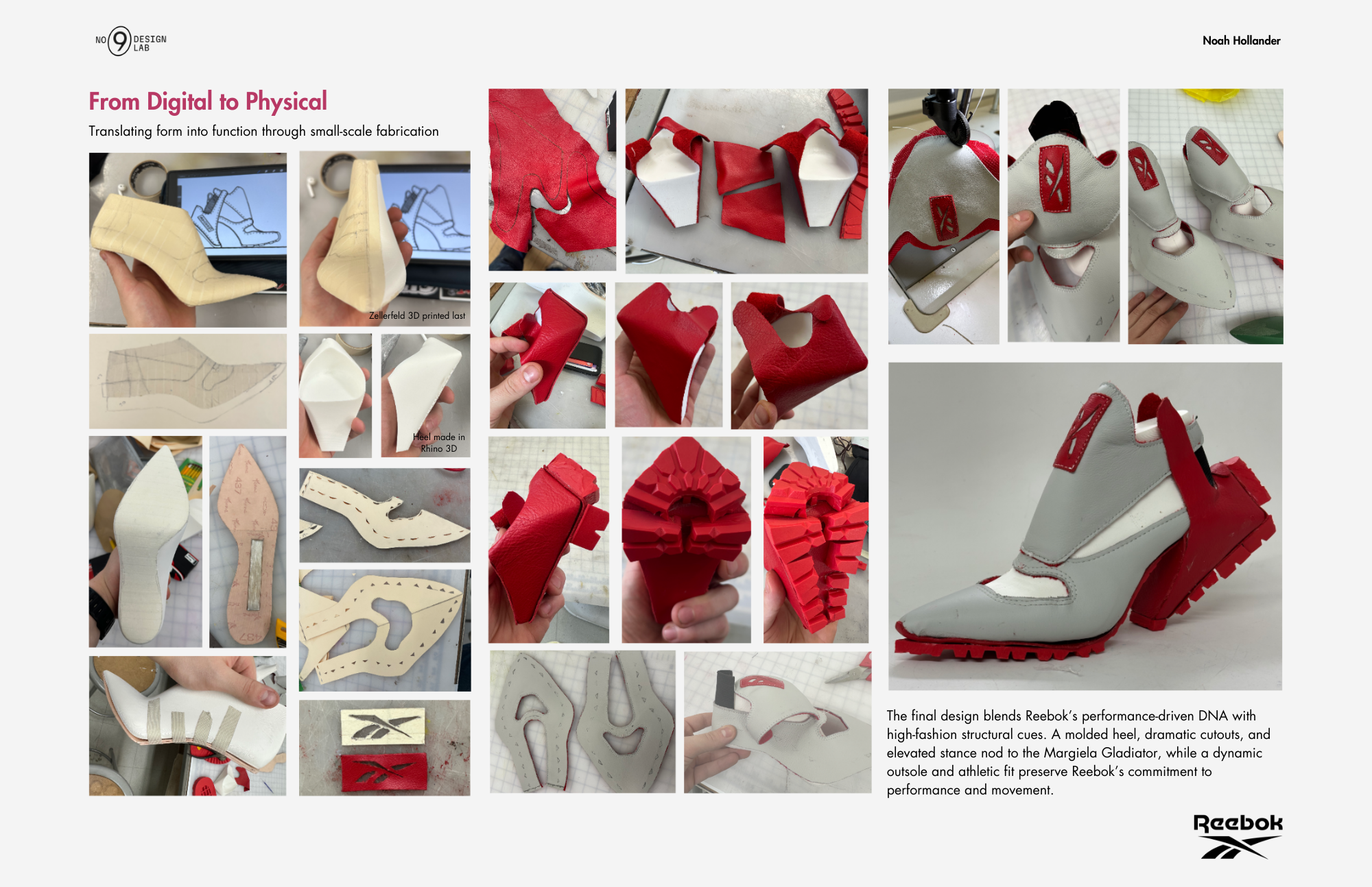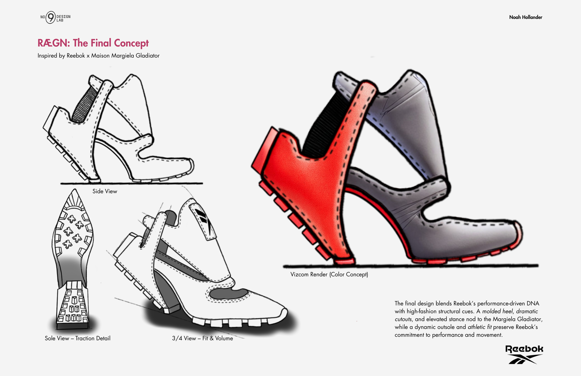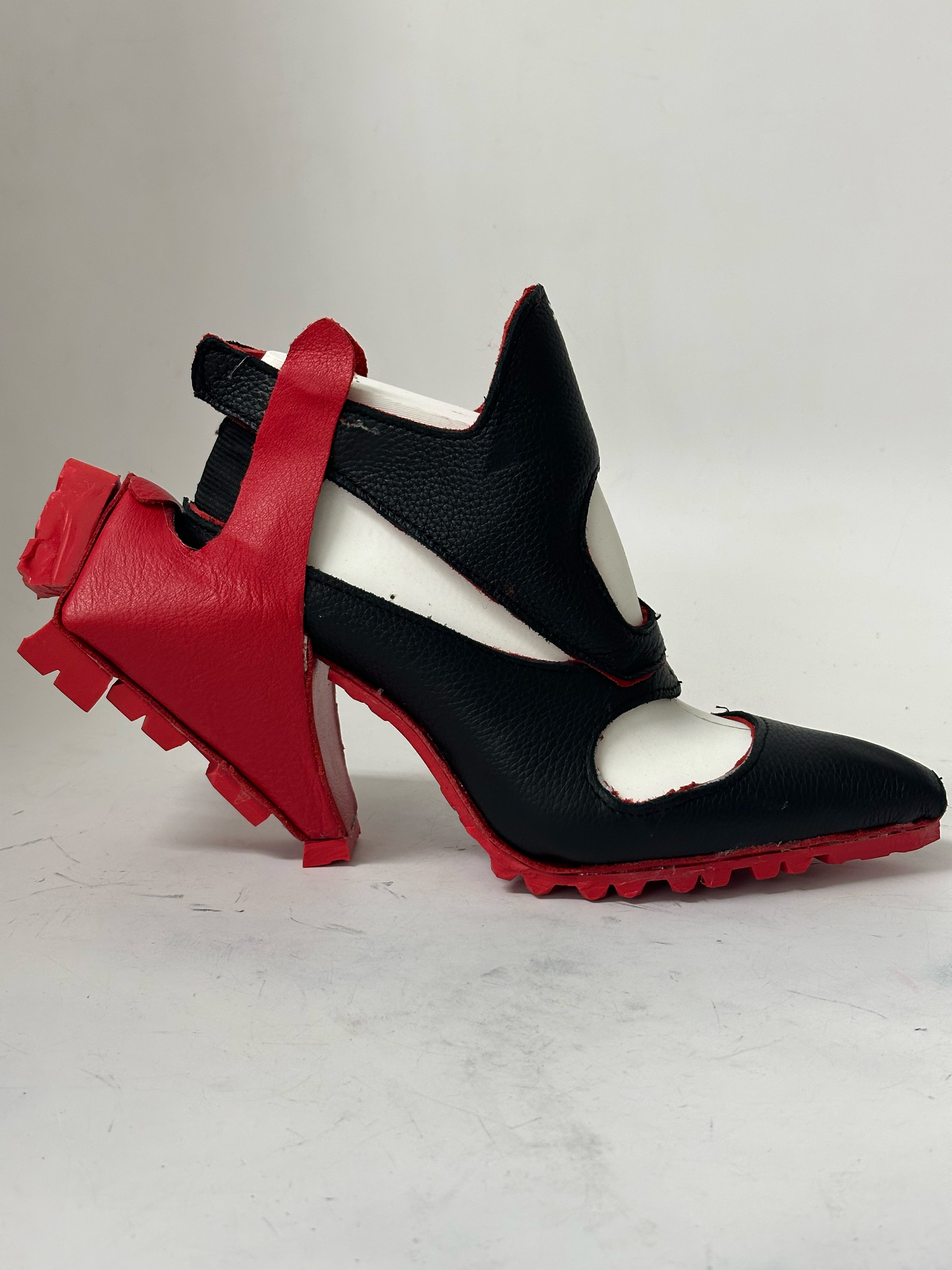 A sneaker-heel hybrid for Reebok, designed in Rhino and Vizcom, and built around a 3D-printed women’s last using pebbled leather, spacer mesh, and a repurposed red Vibram boot sole. Inspired by Angel Reese, this concept fuses sculptural 3D modeling, AI rendering, and hands-on prototyping to blend Reebok’s bold performance DNA with fashion-forward energy. Not designed for mass production—this is a one-off statement piece meant to challenge category expectations and push the line between sport and style.