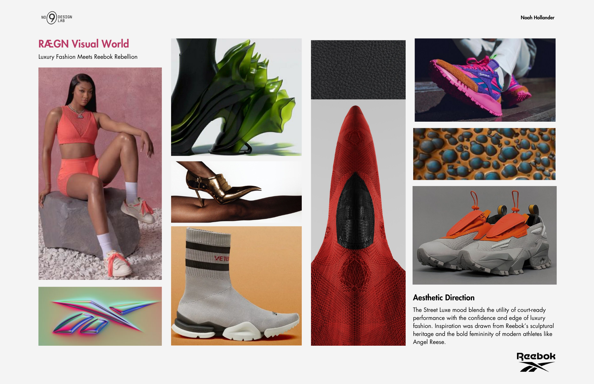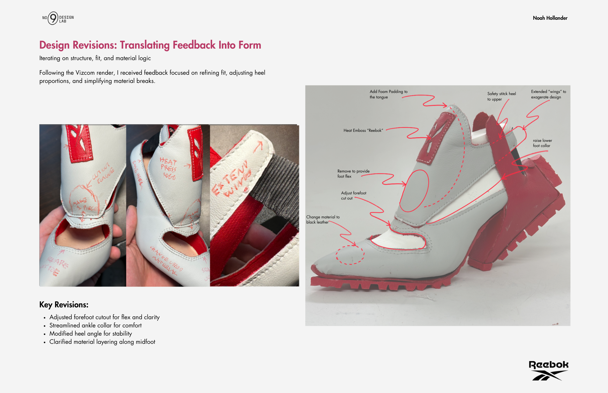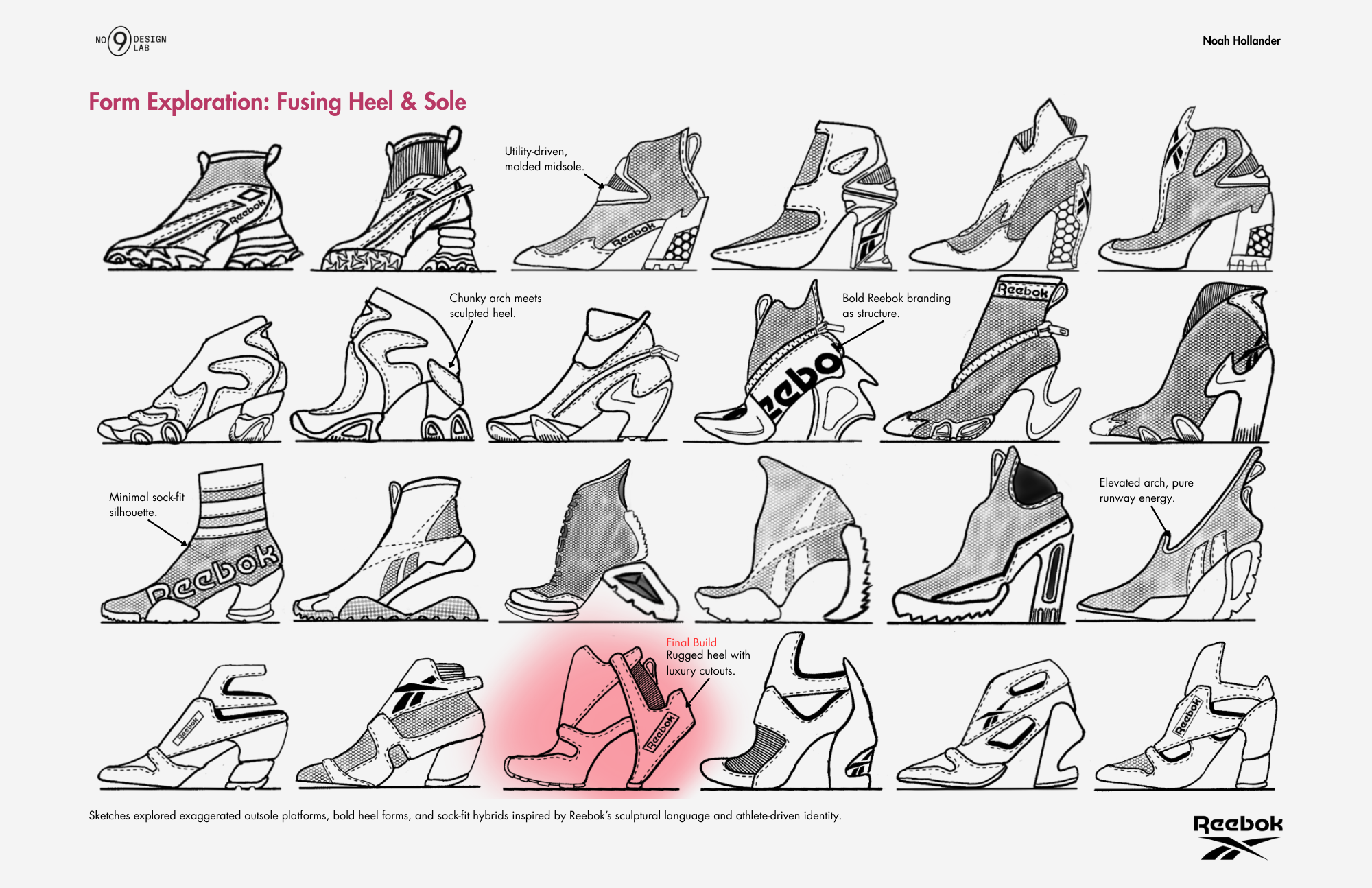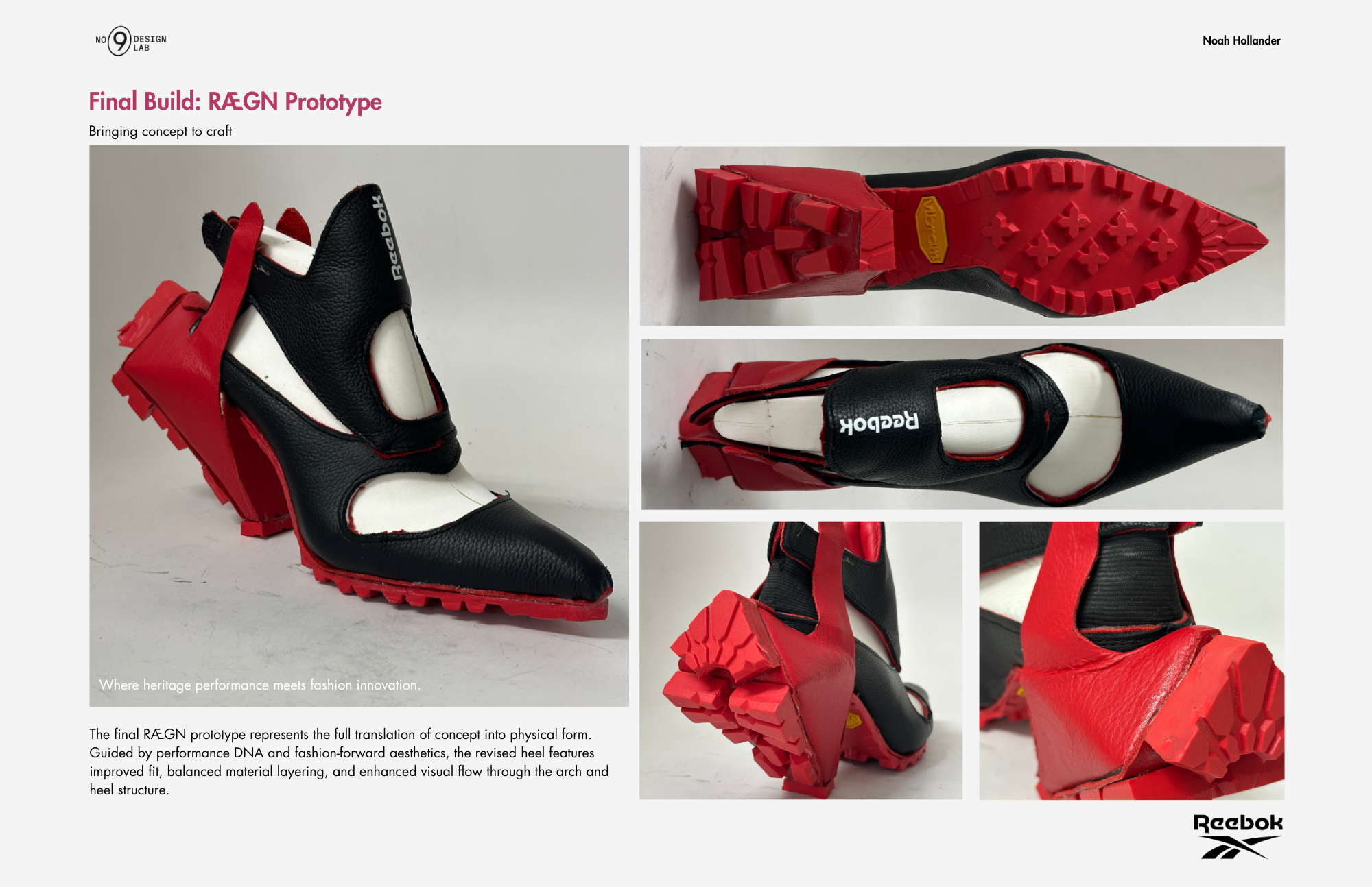 A sneaker-heel hybrid for Reebok, designed in Rhino and Vizcom, and built around a 3D-printed women’s last using pebbled leather, spacer mesh, and a repurposed red Vibram boot sole. Inspired by Angel Reese, this concept fuses sculptural 3D modeling, AI rendering, and hands-on prototyping to blend Reebok’s bold performance DNA with fashion-forward energy. Not designed for mass production—this is a one-off statement piece meant to challenge category expectations and push the line between sport and style.