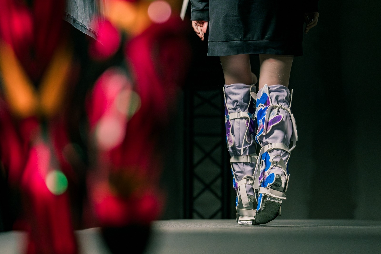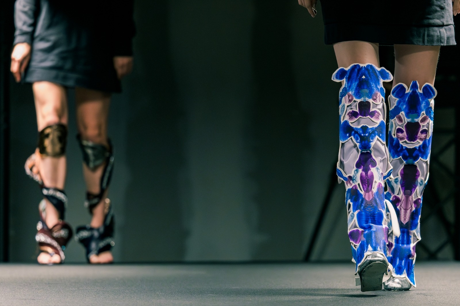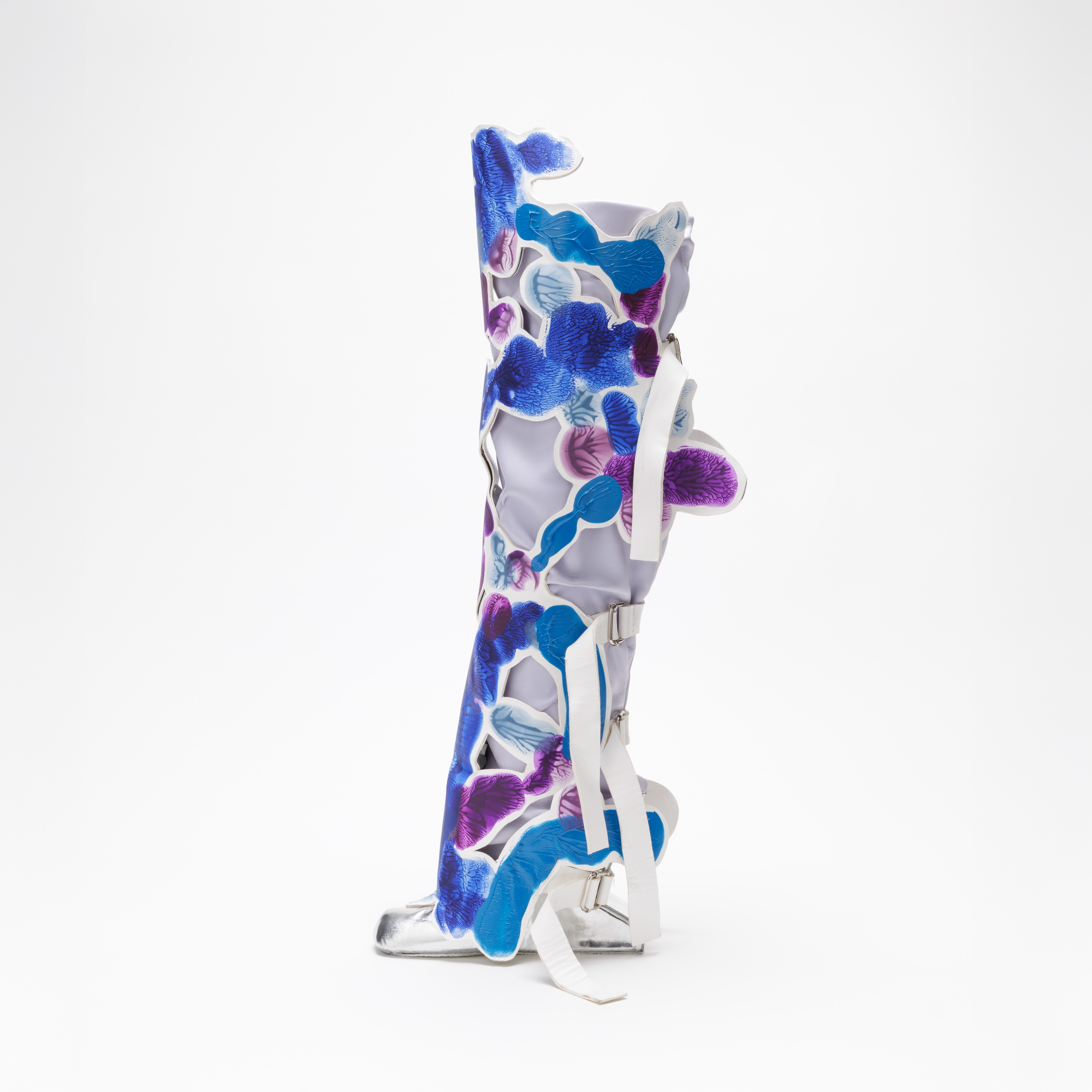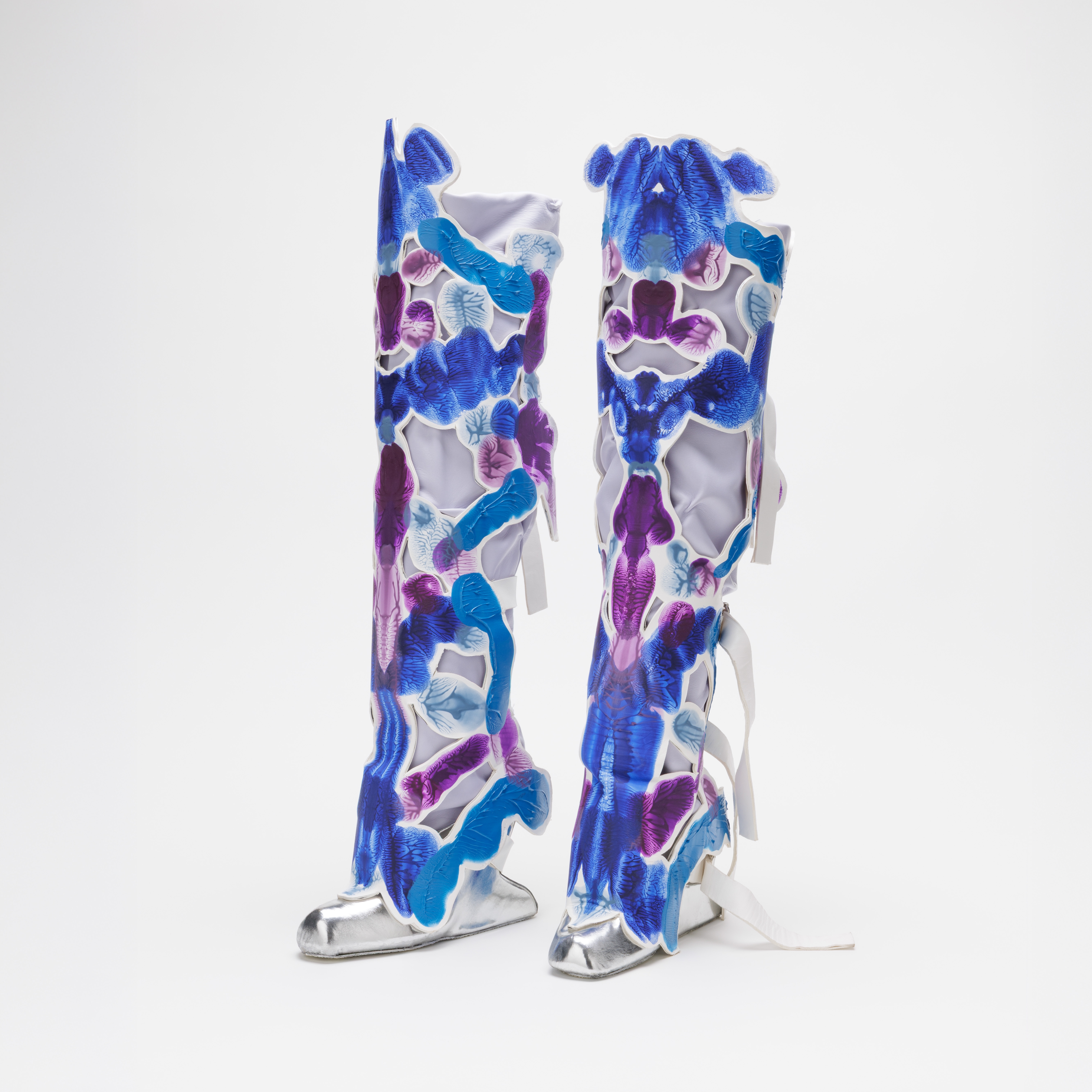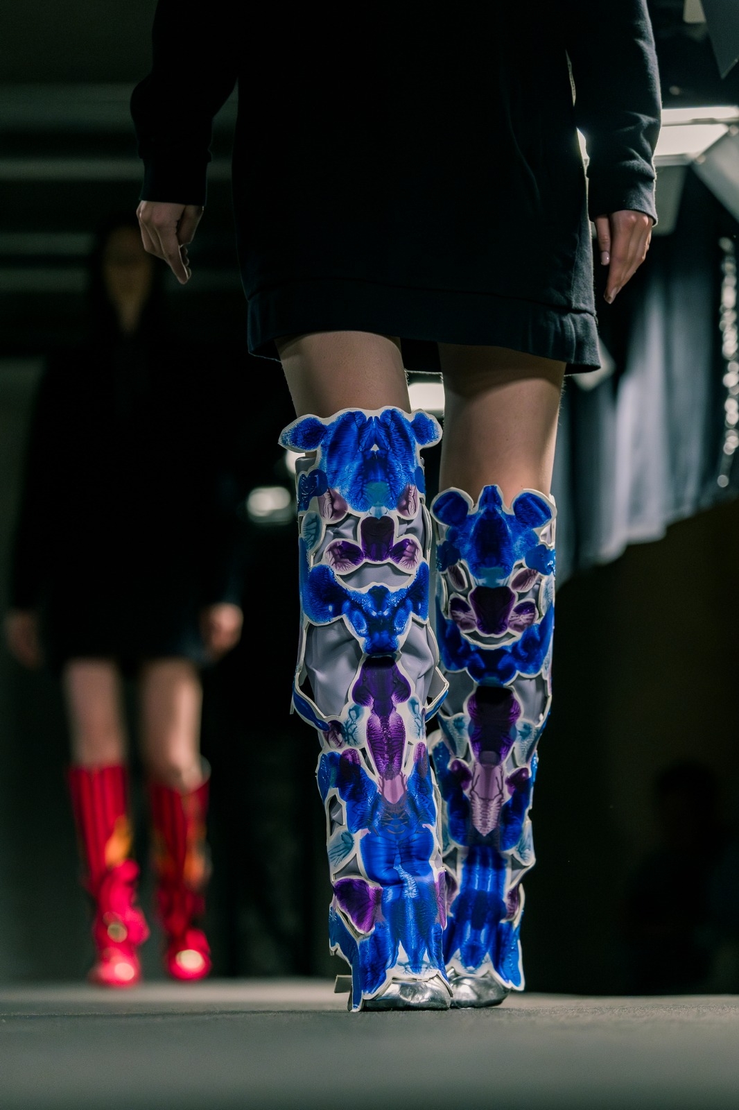 While studying shoe design, I also work at a mental health center. I see daily how hard it is for people to talk about their struggles. This inspired my boot design. I used the Rorschach test, symbolizing how we all see the world differently. The hand-painted inkblots on white lamb leather reflect individuality. The open back with straitjacket-style buckles and mirrored silver leather invites reflection: “Am I still doing okay?” The process taught me a lot — technically and personally.