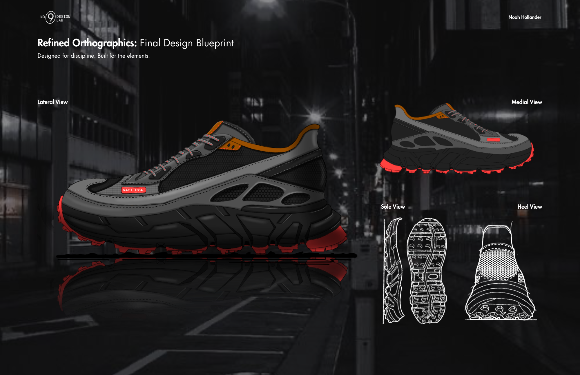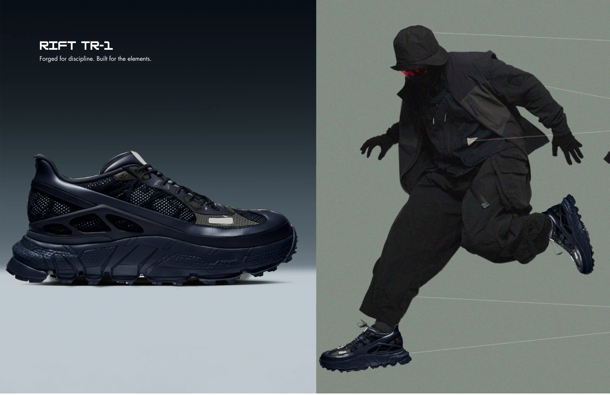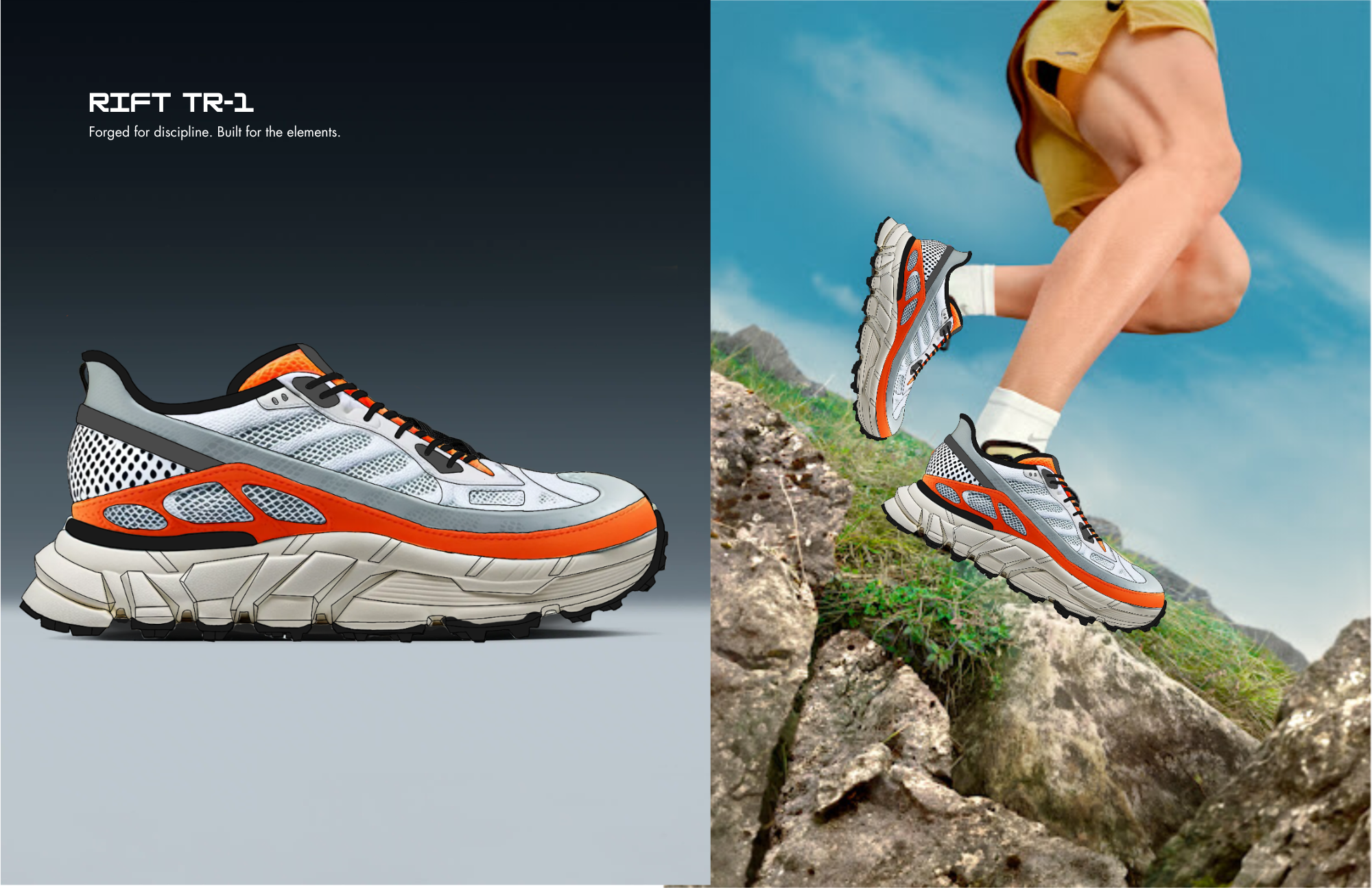 Rift TR-1 is a performance trail runner designed for off-grid discipline and durability. Inspired by Vibram®'s Spiderlock outsole, the shoe integrates real-world tooling with a multi-zone upper made from recycled mesh, spacer knit, and molded TPU overlays. Engineered for production readiness, Rift TR-1 balances rugged traction with elevated material mapping all delivered through a fully spec’d tech pack.