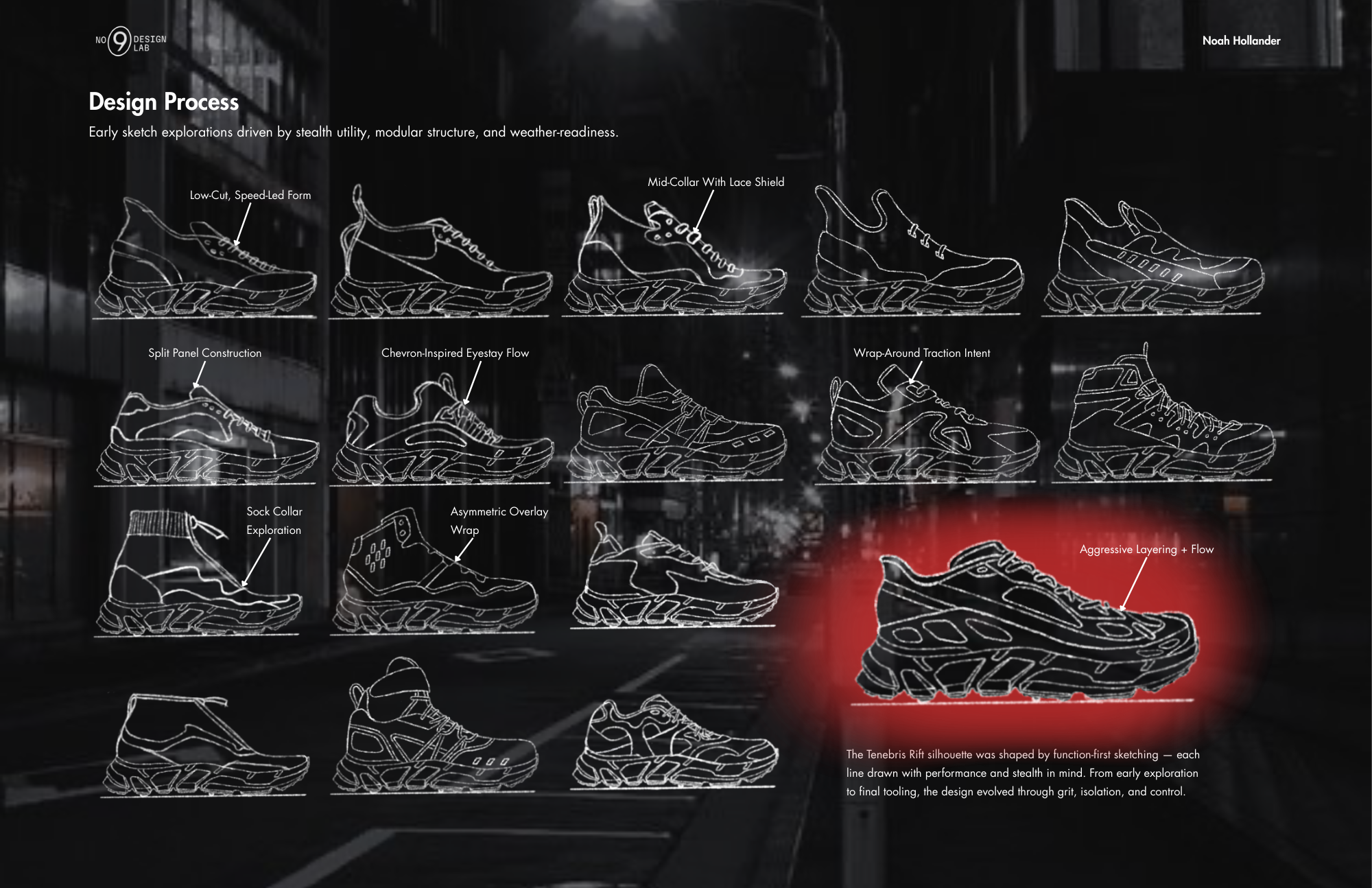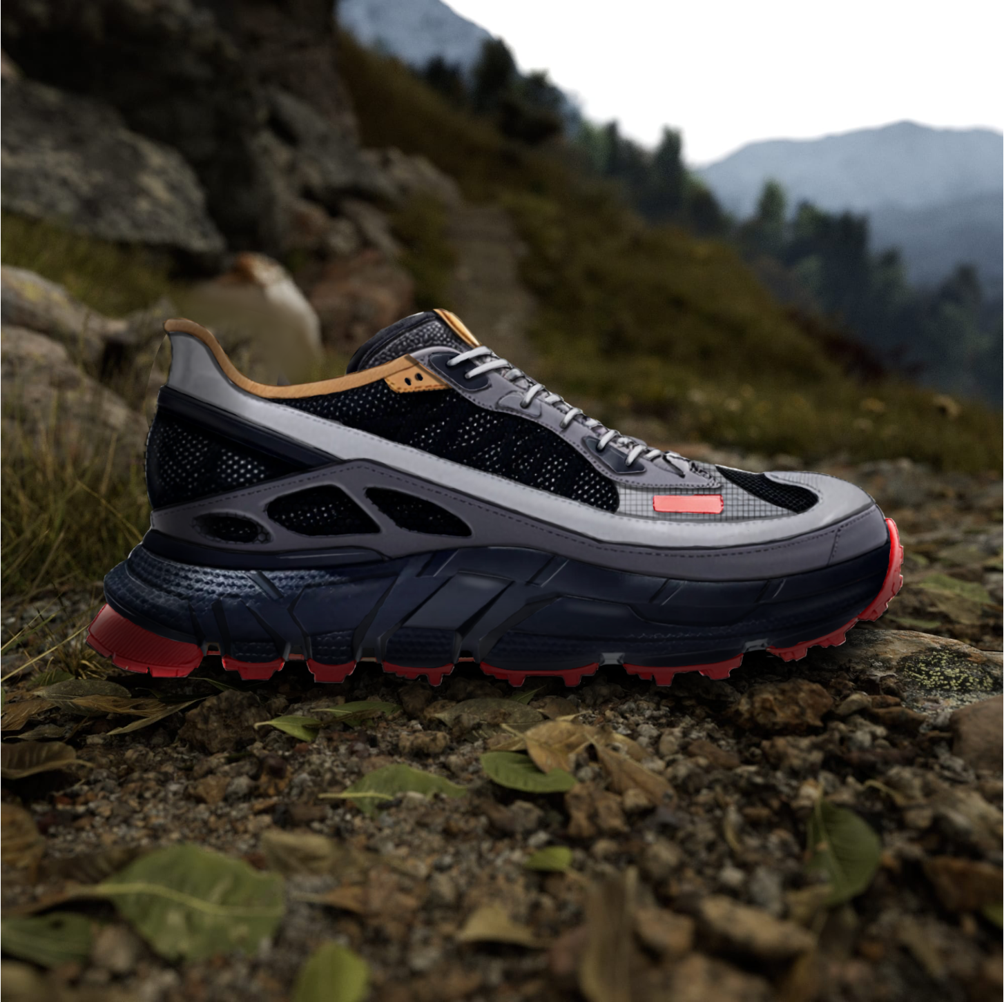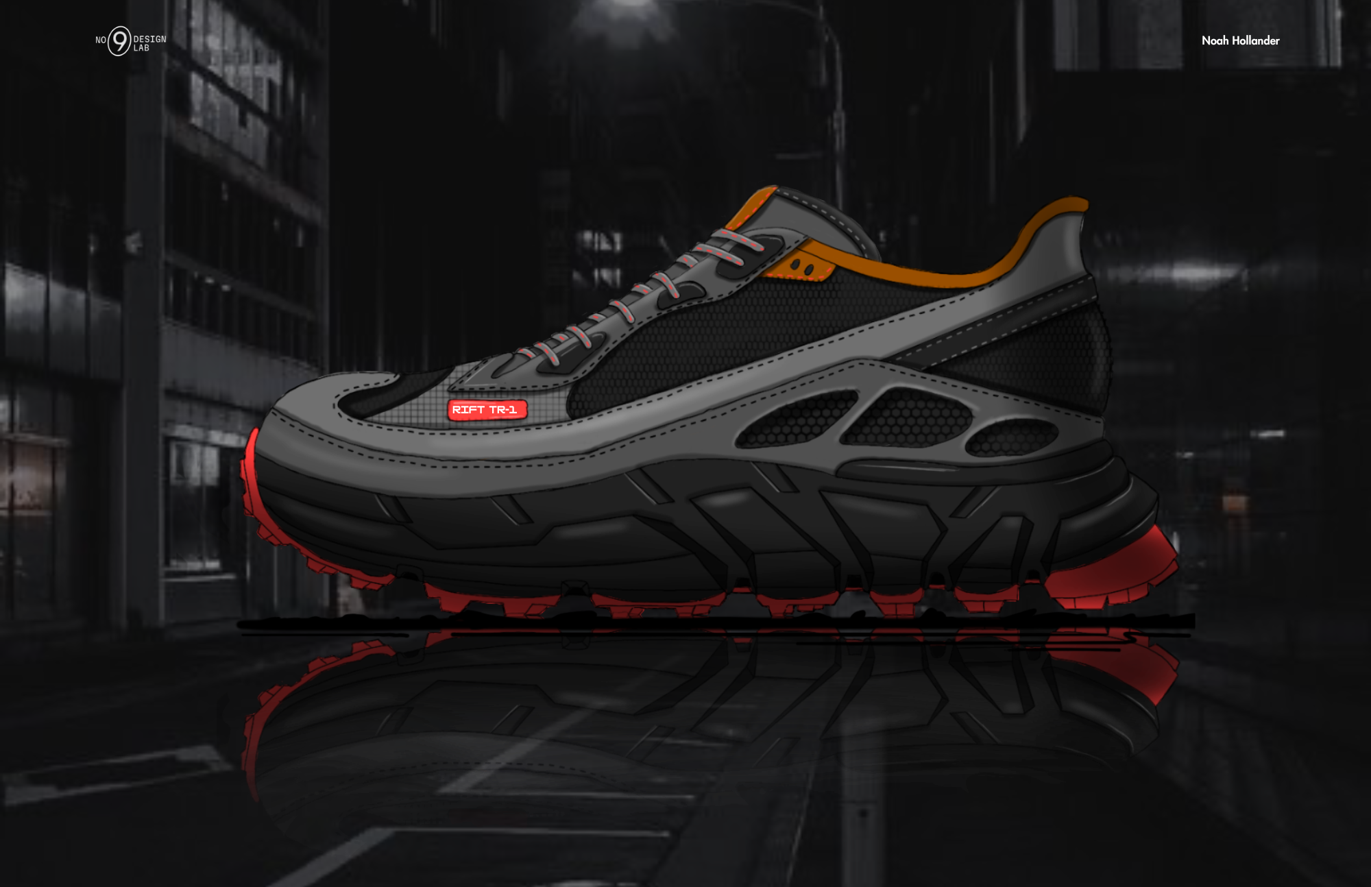 Rift TR-1 is a performance trail runner designed for off-grid discipline and durability. Inspired by Vibram®'s Spiderlock outsole, the shoe integrates real-world tooling with a multi-zone upper made from recycled mesh, spacer knit, and molded TPU overlays. Engineered for production readiness, Rift TR-1 balances rugged traction with elevated material mapping all delivered through a fully spec’d tech pack.