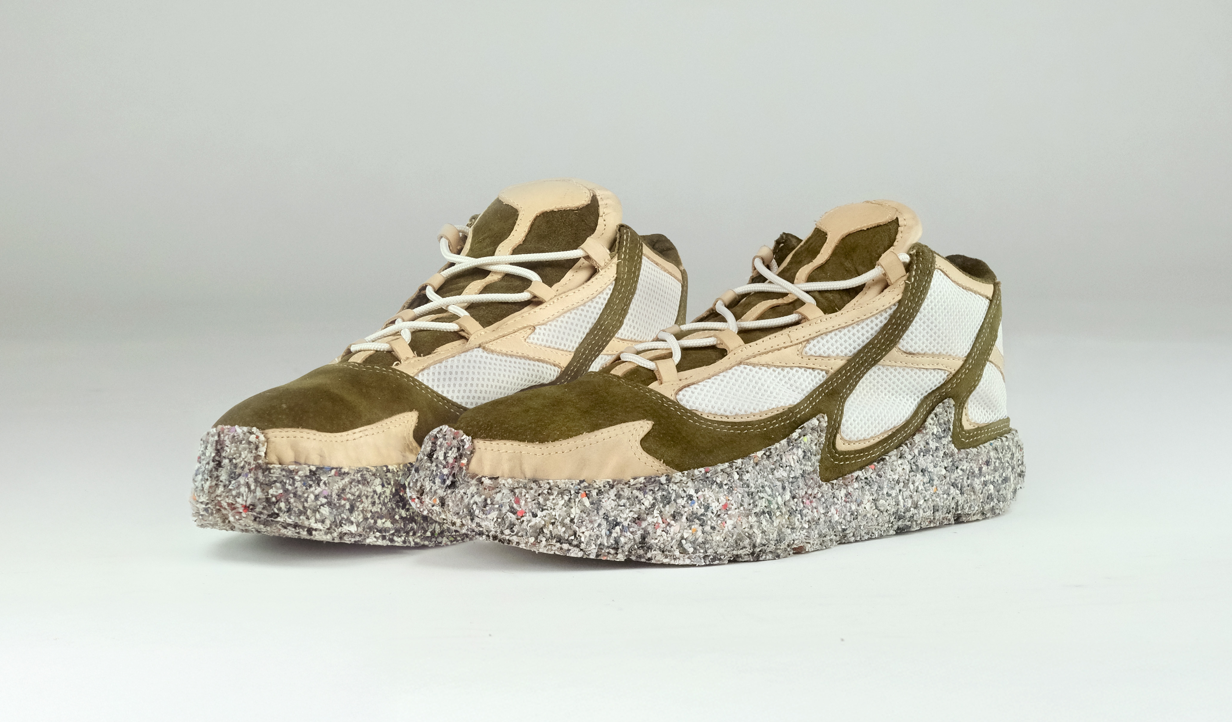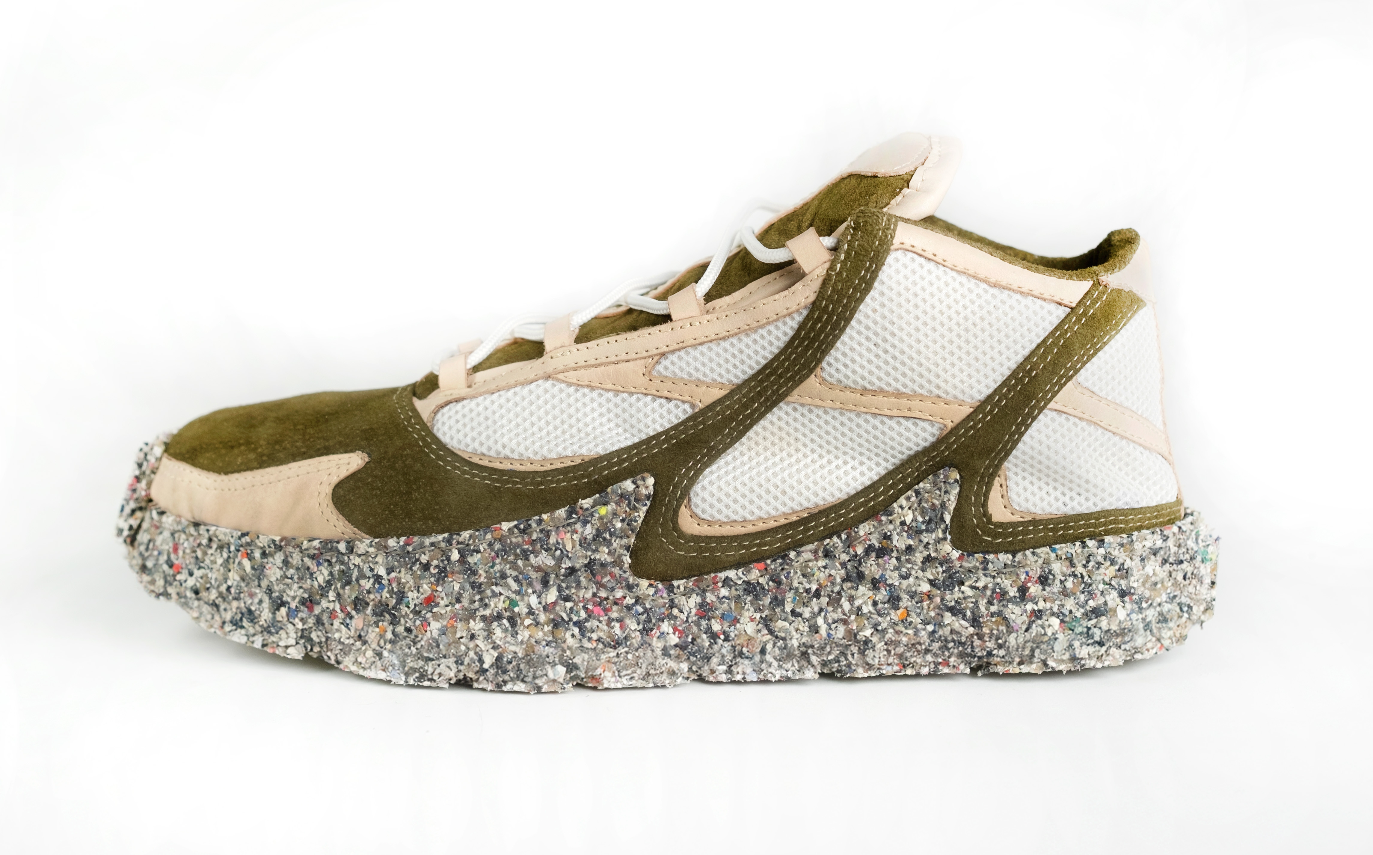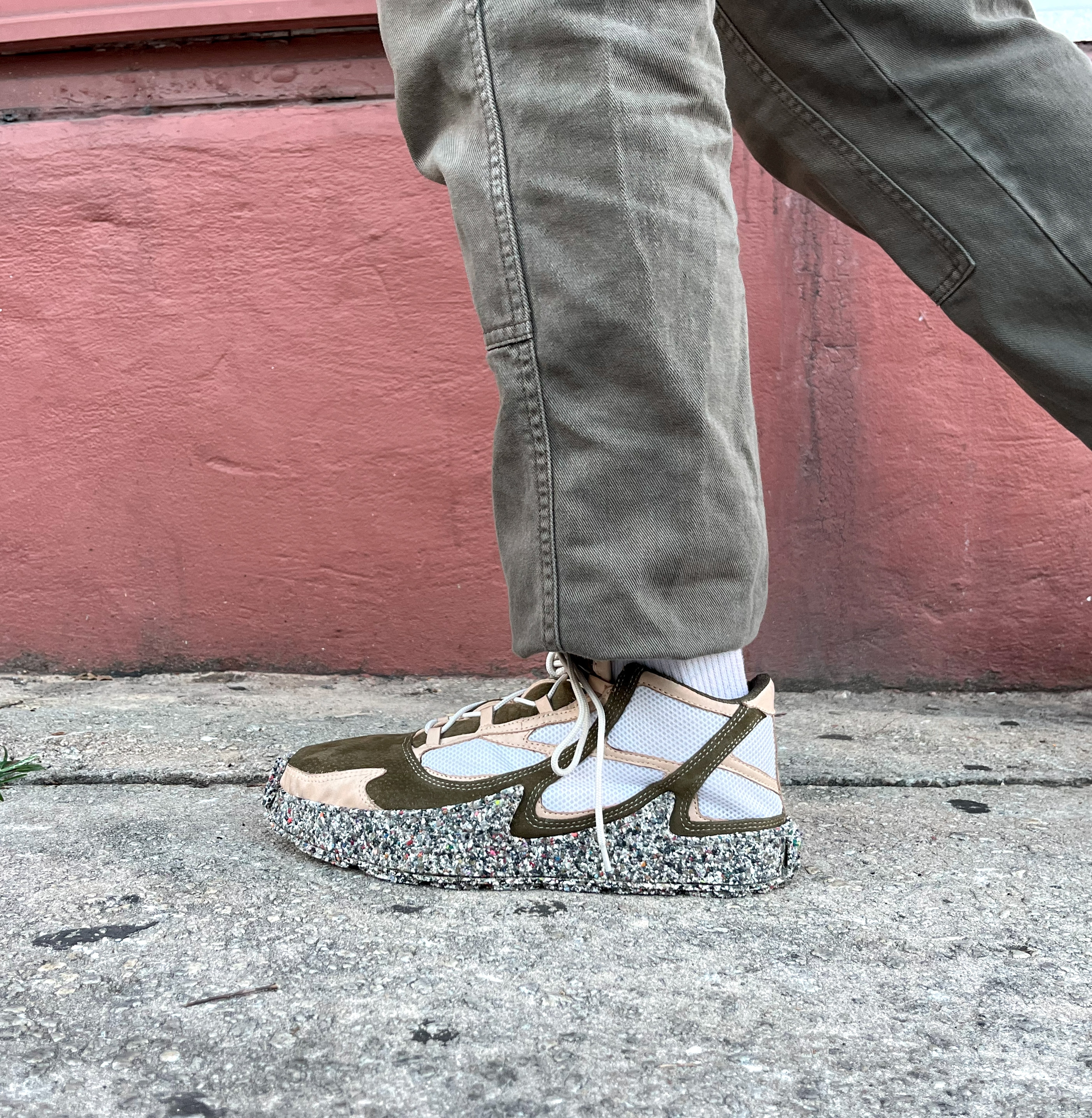 Created in response to the growing demand for footwear that bridges sustainability and style, this shoe blends classic outdoor hiker design with modern, eco-conscious materials. Olive suede and veg-tan leather are ethically sourced; the midsole is made from algae, or sugarcane, based EVA foam; the outsole uses recycled Nike Grind; and the mesh is recycled from New Balance. Designed for those who see the outdoors not just as a place to explore, but as something worth preserving, it offers rugged style, comfort, and versatility--because the world is pretty, and we should keep it that way.
