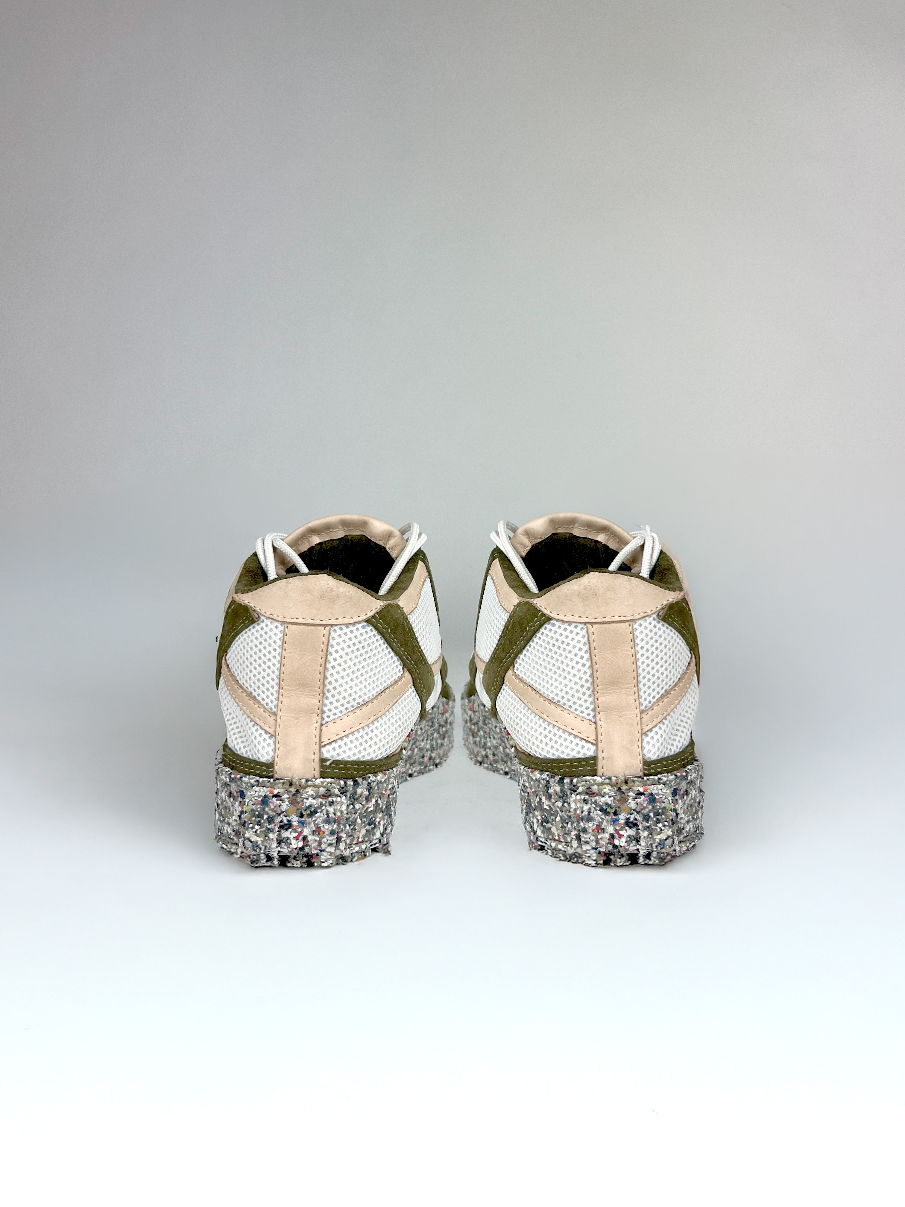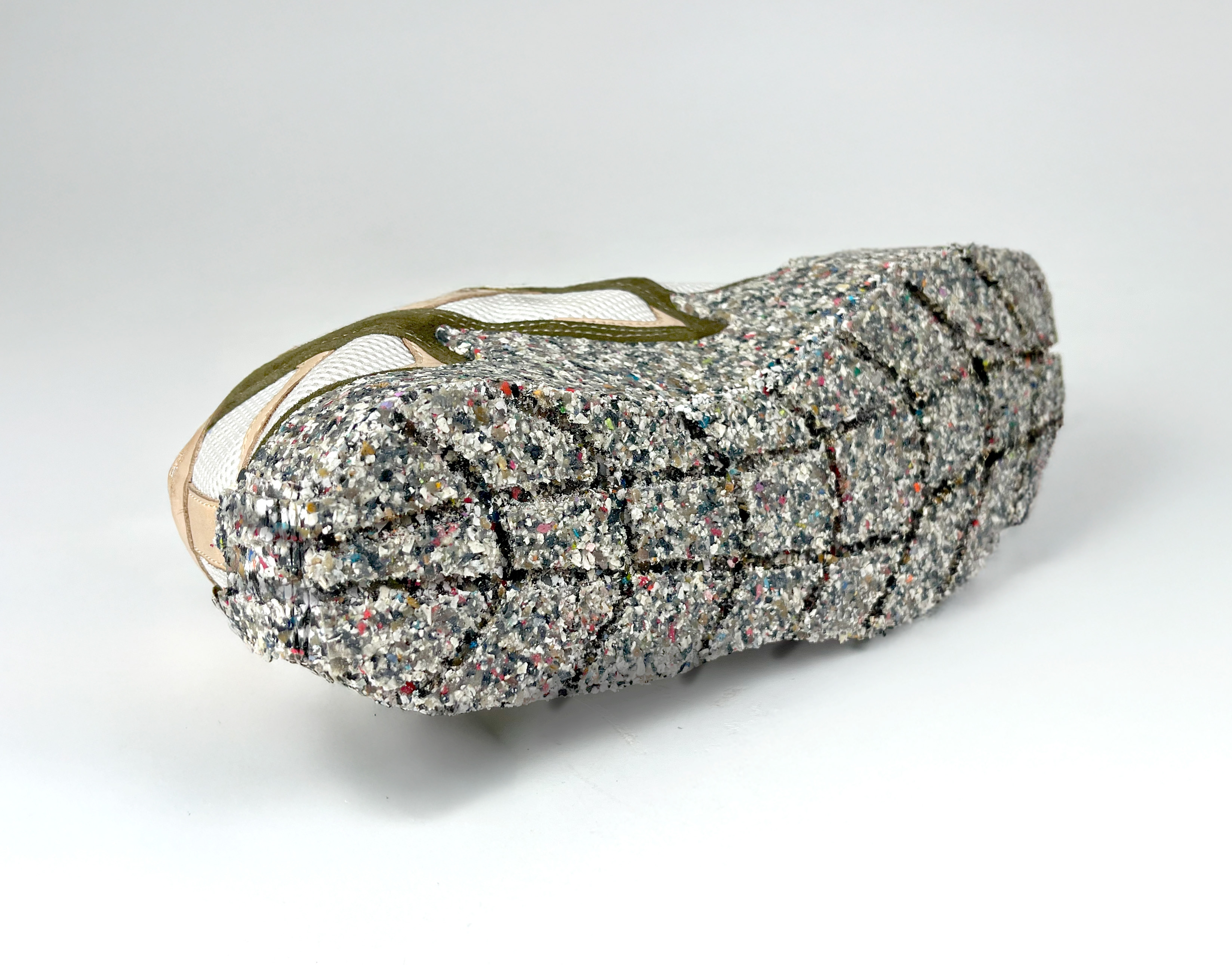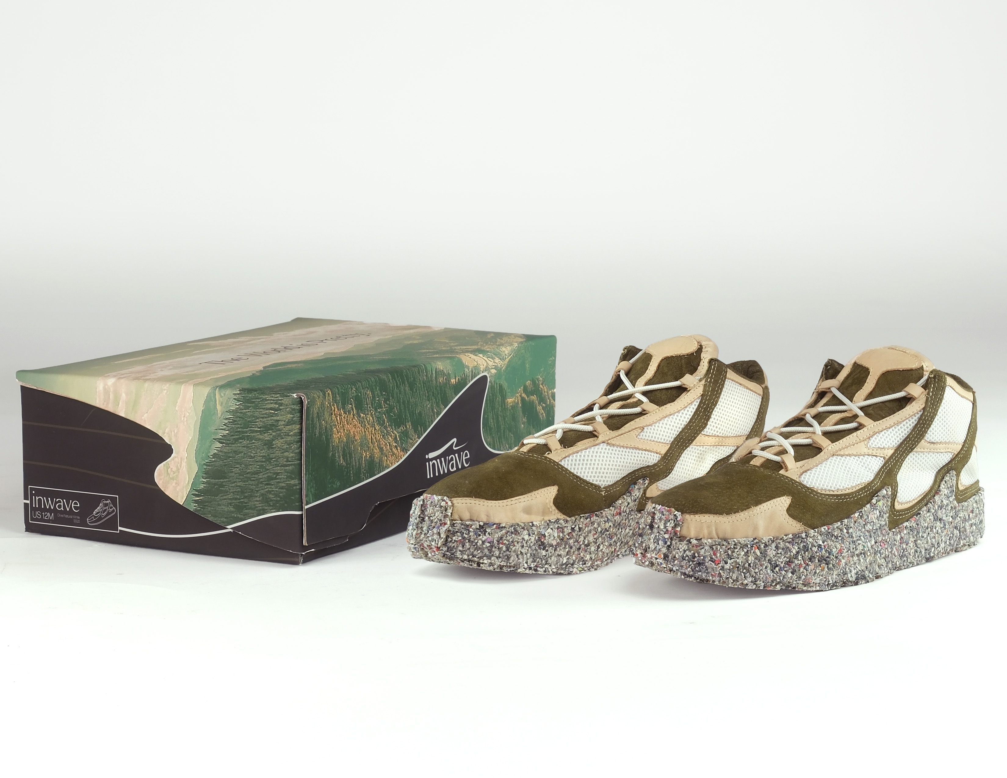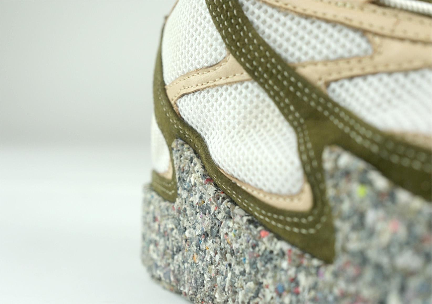Created in response to the growing demand for footwear that bridges sustainability and style, this shoe blends classic outdoor hiker design with modern, eco-conscious materials. Olive suede and veg-tan leather are ethically sourced; the midsole is made from algae, or sugarcane, based EVA foam; the outsole uses recycled Nike Grind; and the mesh is recycled from New Balance. Designed for those who see the outdoors not just as a place to explore, but as something worth preserving, it offers rugged style, comfort, and versatility--because the world is pretty, and we should keep it that way.