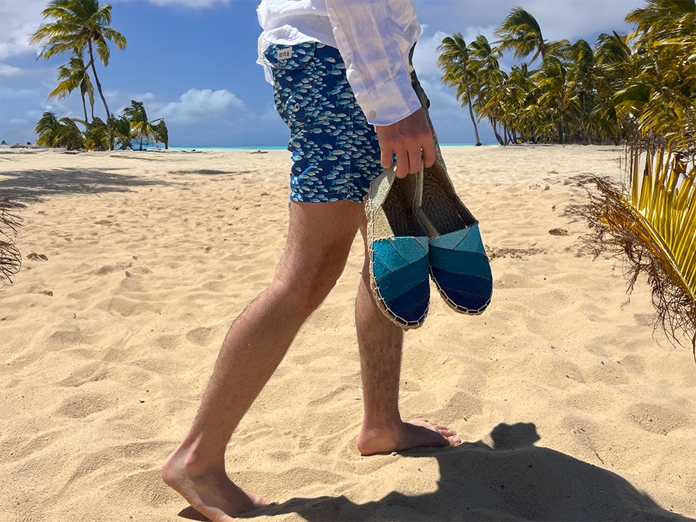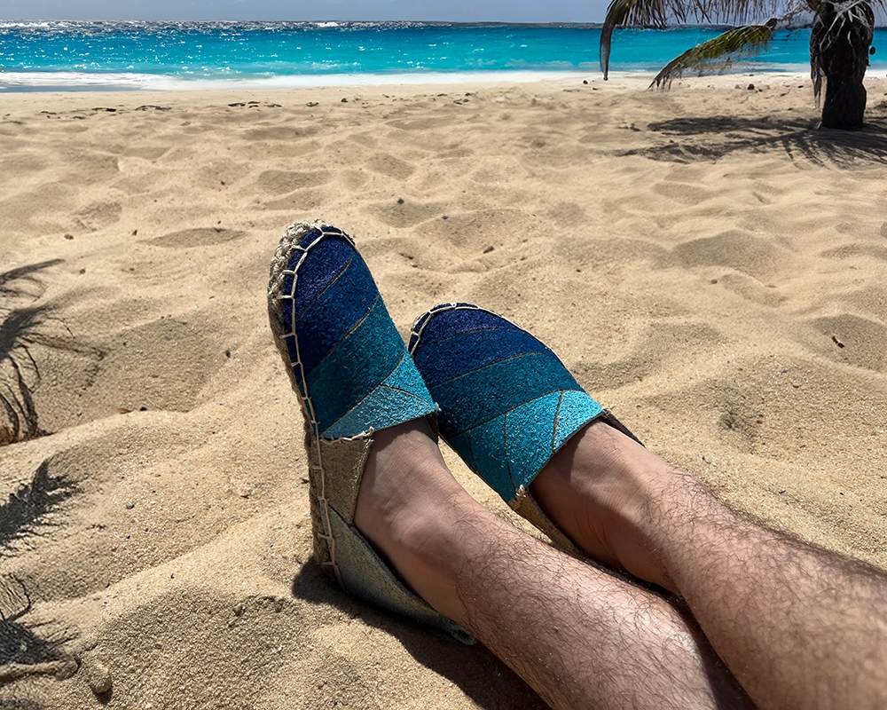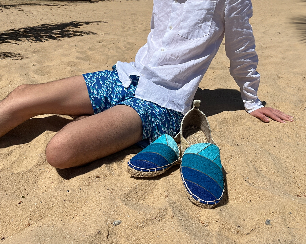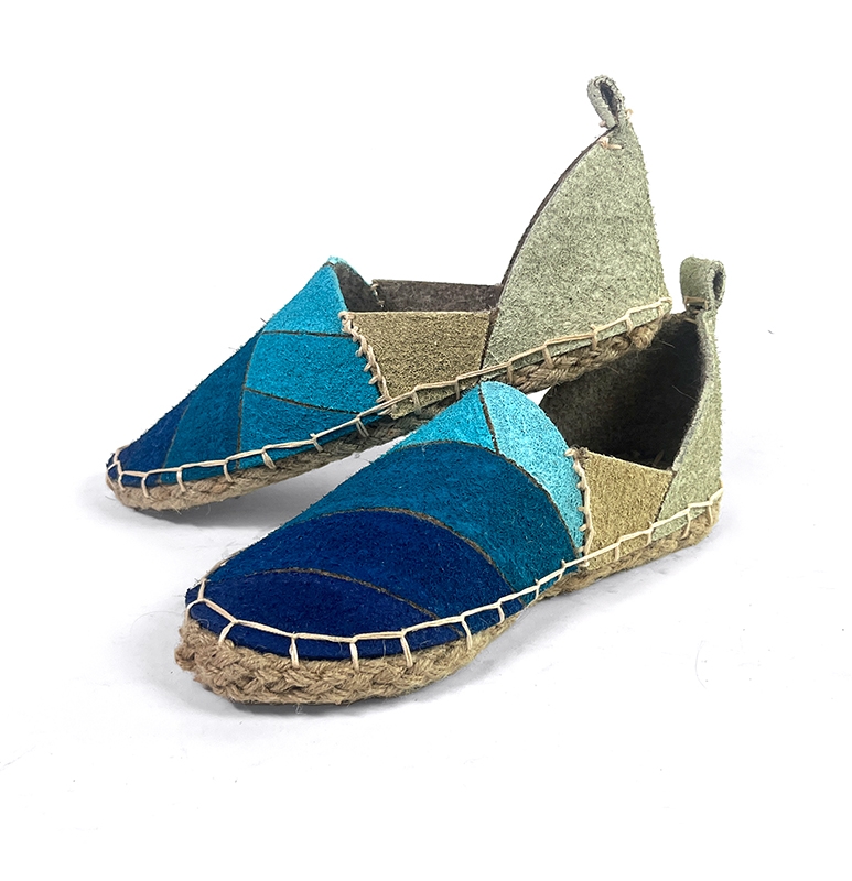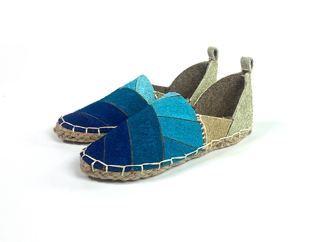 Alisio is a beachwear espadrille made from recycled 100 percent wool and natural twine, assembled without adhesives. It consists of three parts: the upper, the heel wrap, and the sole. The sole is hand-stitched for flexibility and comfort while supporting barefoot-style movement. A soft gradient transitions from deep blue to sandy beige, evoking coastal landscapes. Crafted entirely by hand, Alisio is breathable, lightweight, and rooted in natural materials.