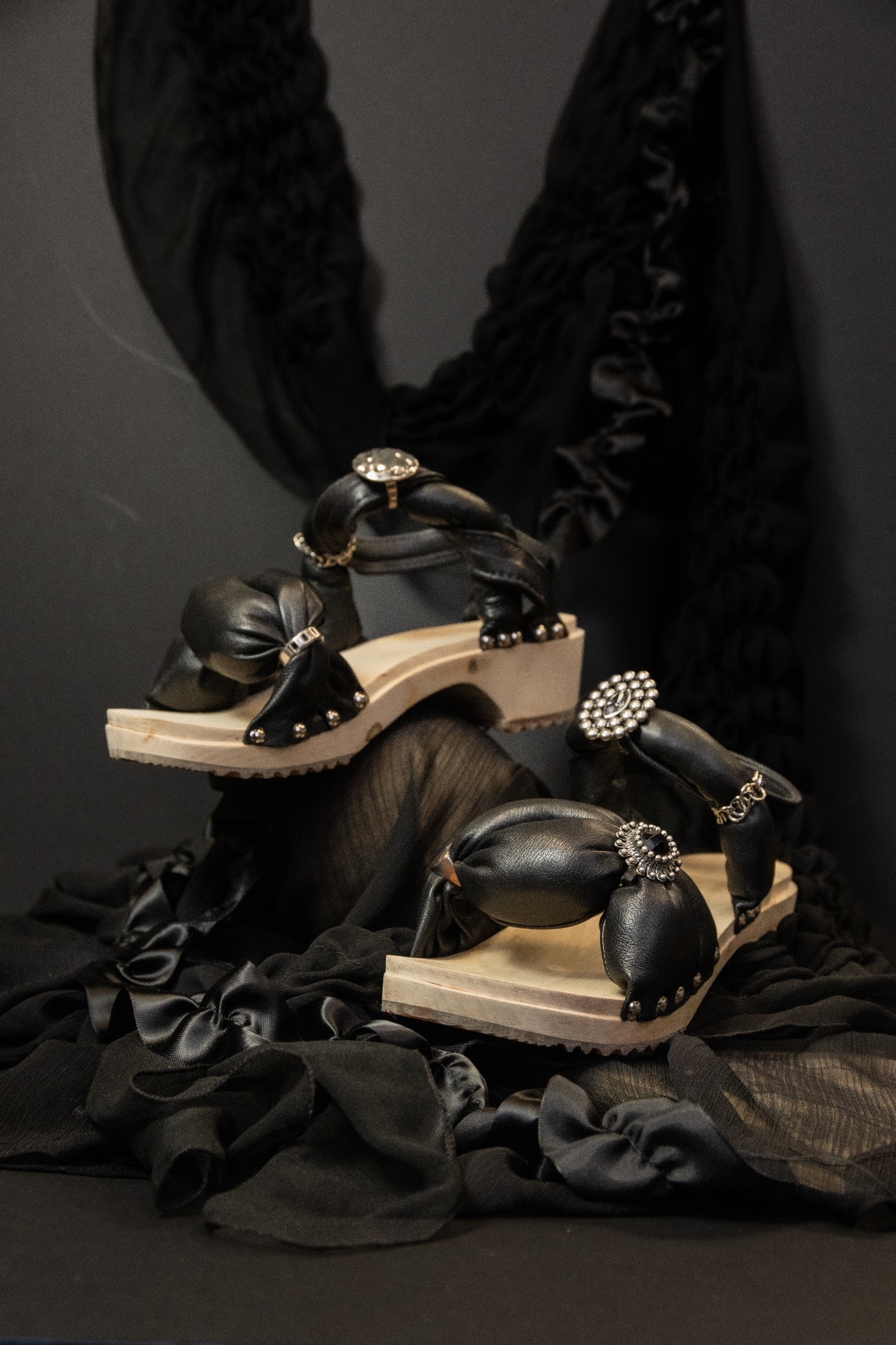 The design was inspired by fashion figure and designer Michele Lamy - material choice and colorway came from her personal aesthetic, the design and material manipulation was inspired by her way of mutating human body and figure by creating unnatural sculptural shapes. Material for the shoes was recycled from an old leather jacket, decorative jewellery was bought second hand, dead stock wooden soles were from the university.