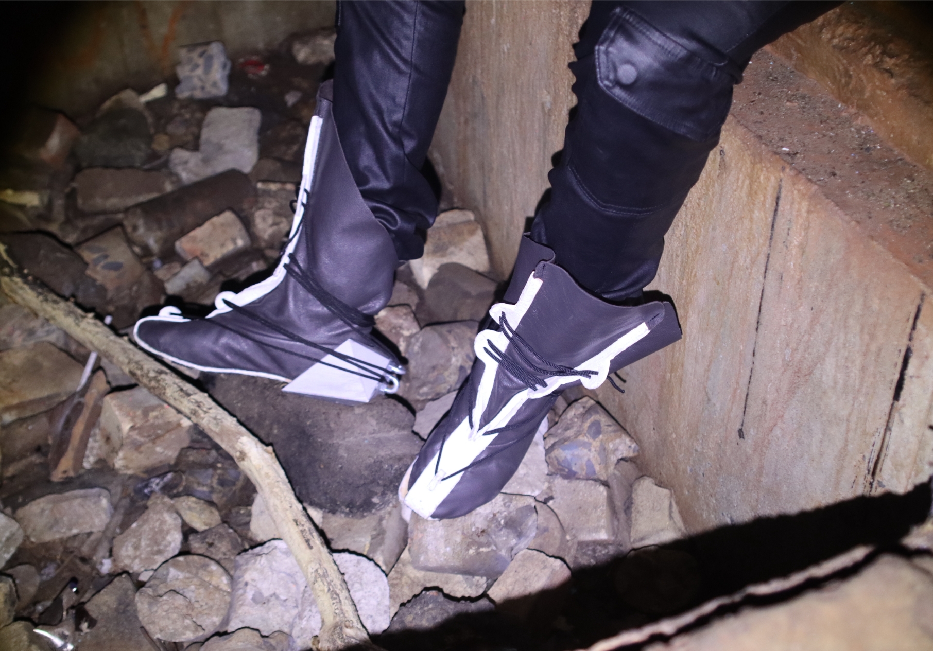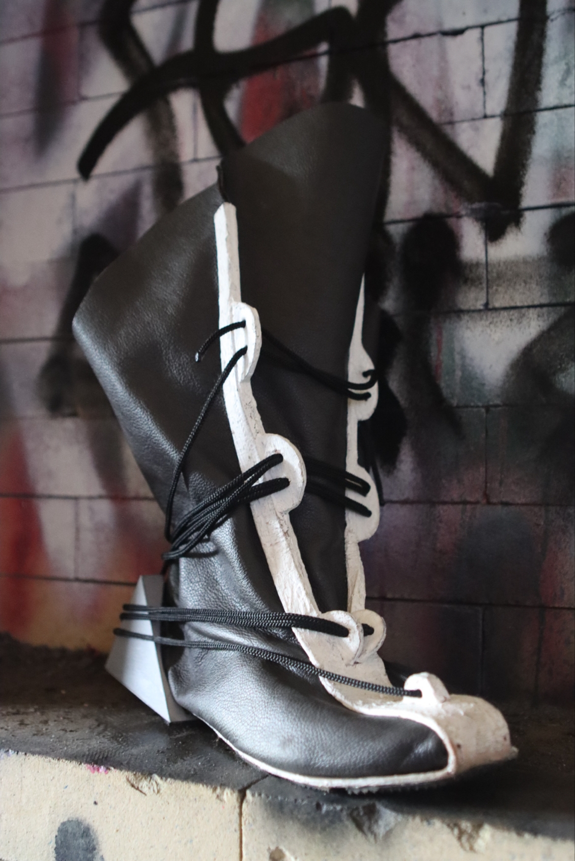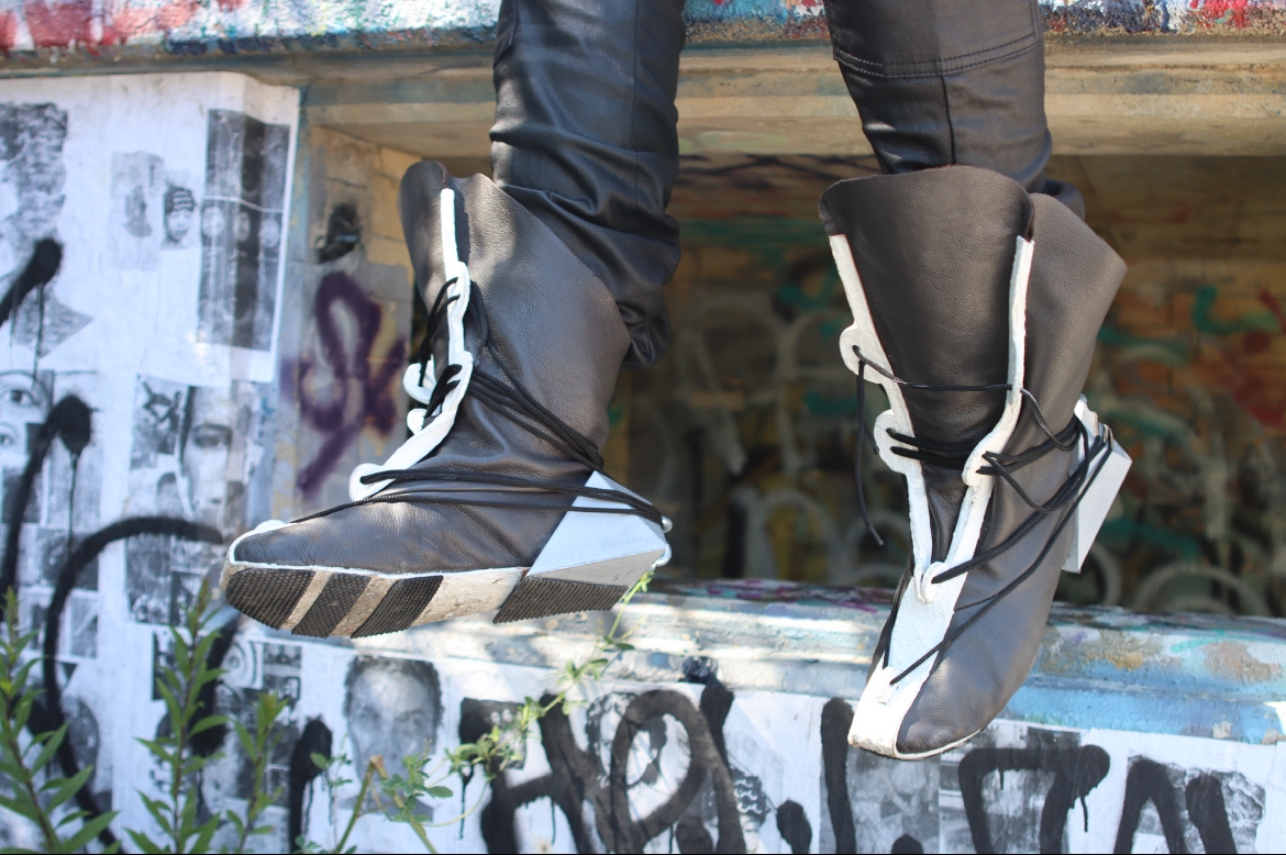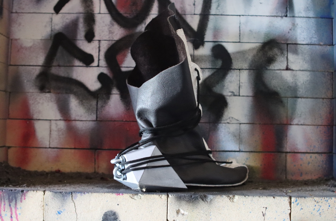 TestThis hightop sneaker based off classic form fitting boxing sneakers is a combination of brutalist design and athletic intensity. This shoe has a buffalo leather upper with an eye-stay/midsole combination that is made from 3 ounce veg tanned leather coated in a waterproof rubber sealant. The heel is a 3d printed PLA polygon ergonomic shape to match the standard walking patterns generally seen in humans. Strips of rubber soling protect the heel and midsole from extraneous wear and tear. The connected midsole and eye-stay provides a connection that will keep the shoe together for a lifetime.