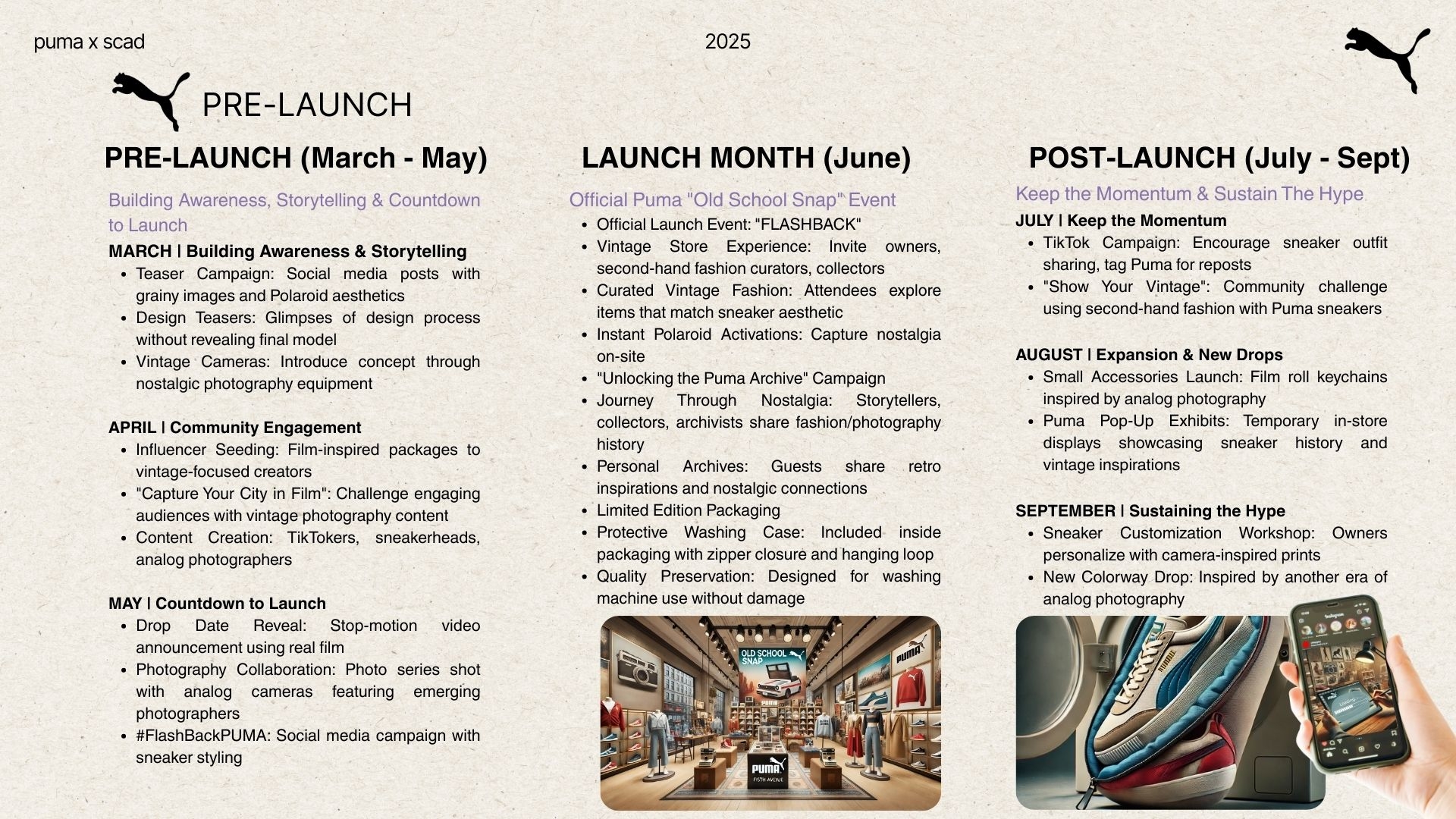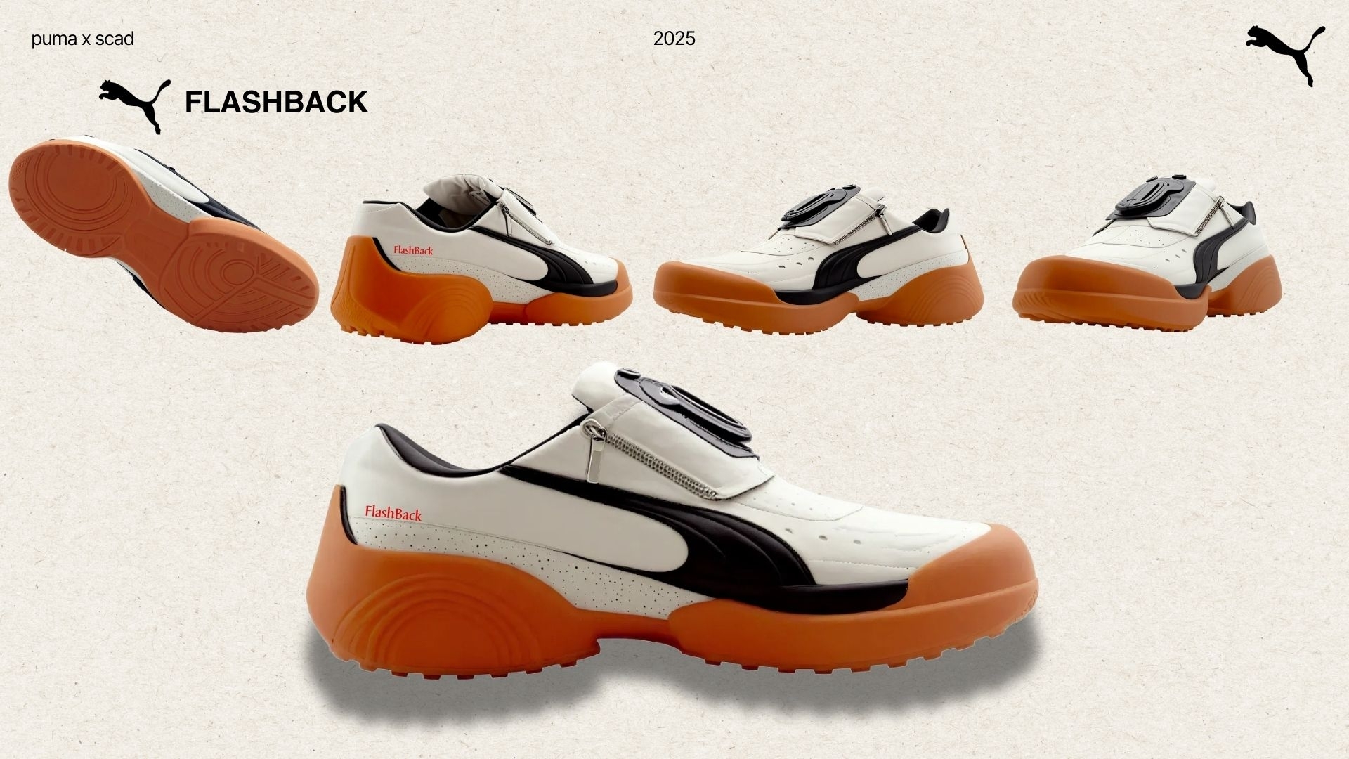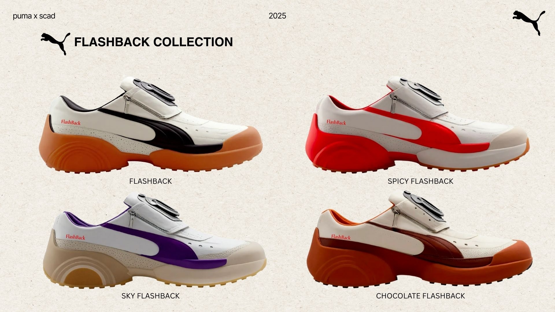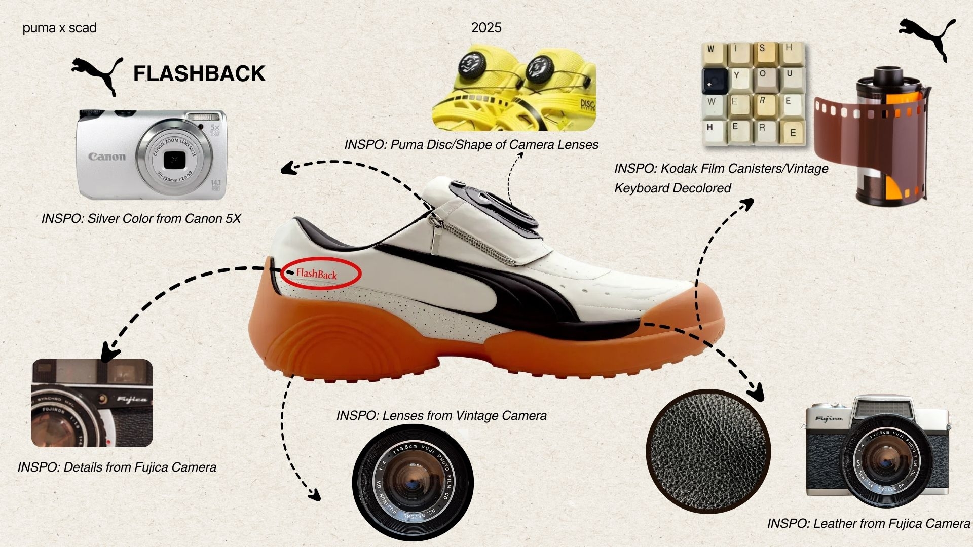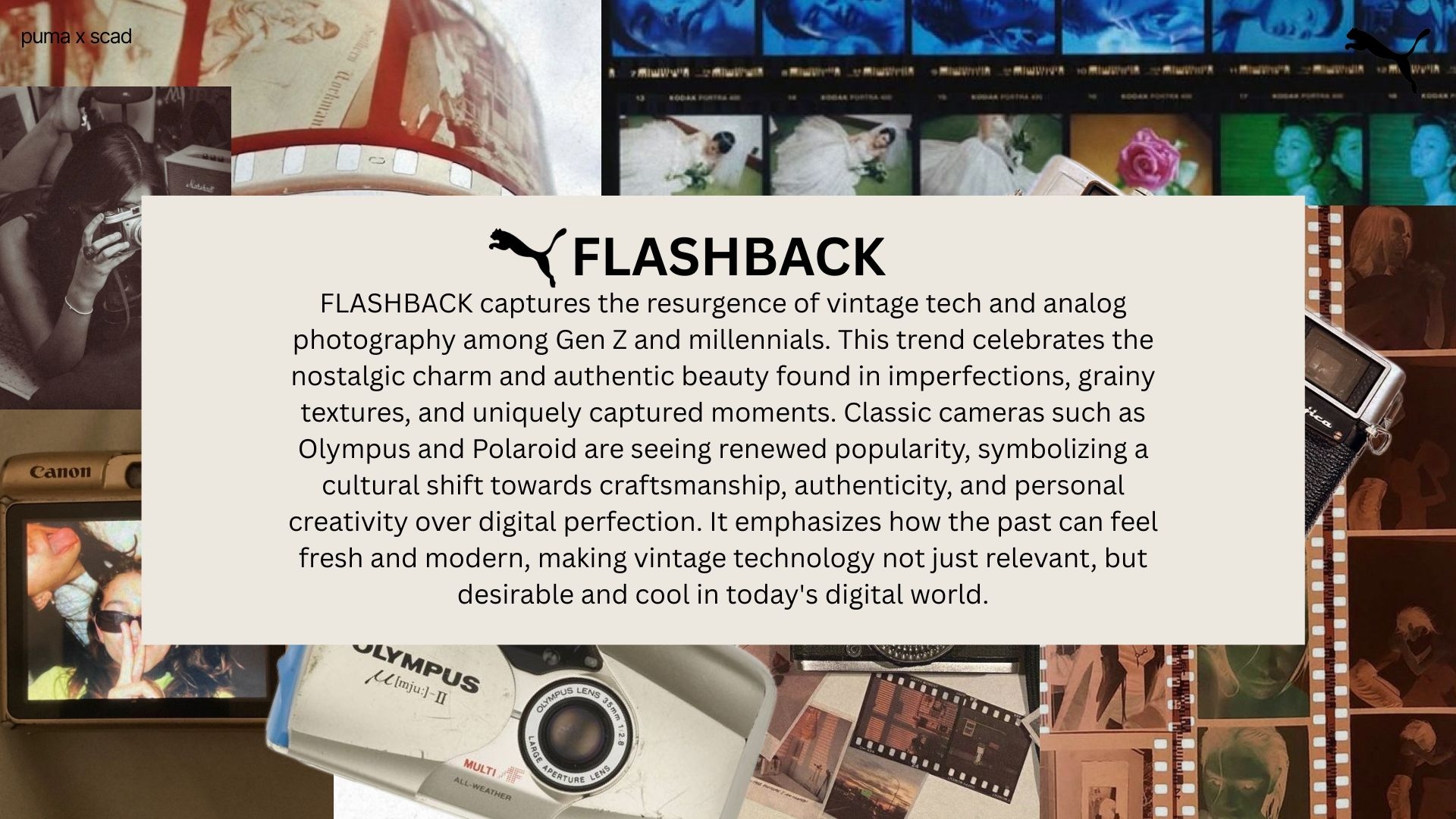 FLASHBACK is a sneaker concept, mentored by Puma's SportStyle team. The collection captures Gen Z and millennials' resurgence of vintage technology and analog photography—embracing nostalgic charm, imperfections, and authentic moments over digital perfection. As classic cameras like Olympus and Polaroid regain popularity, they symbolize a cultural shift toward craftsmanship and personal creativity. FLASHBACK translates this trend into footwear, proving how vintage technology can feel fresh, relevant, and desirable in today's digital world.