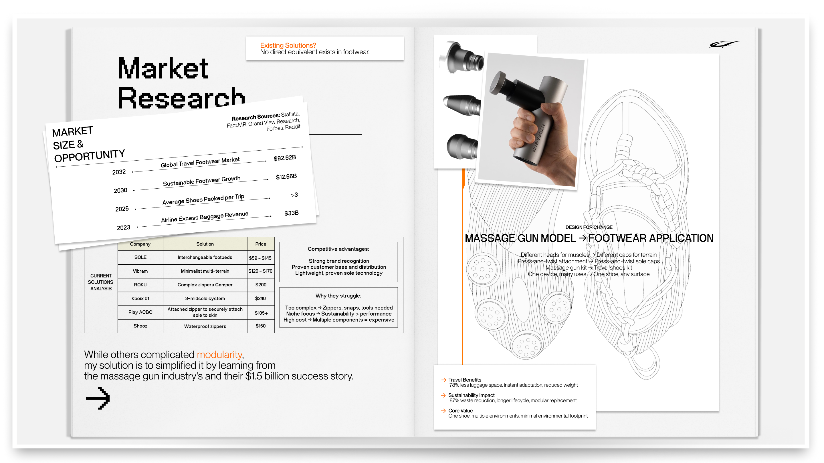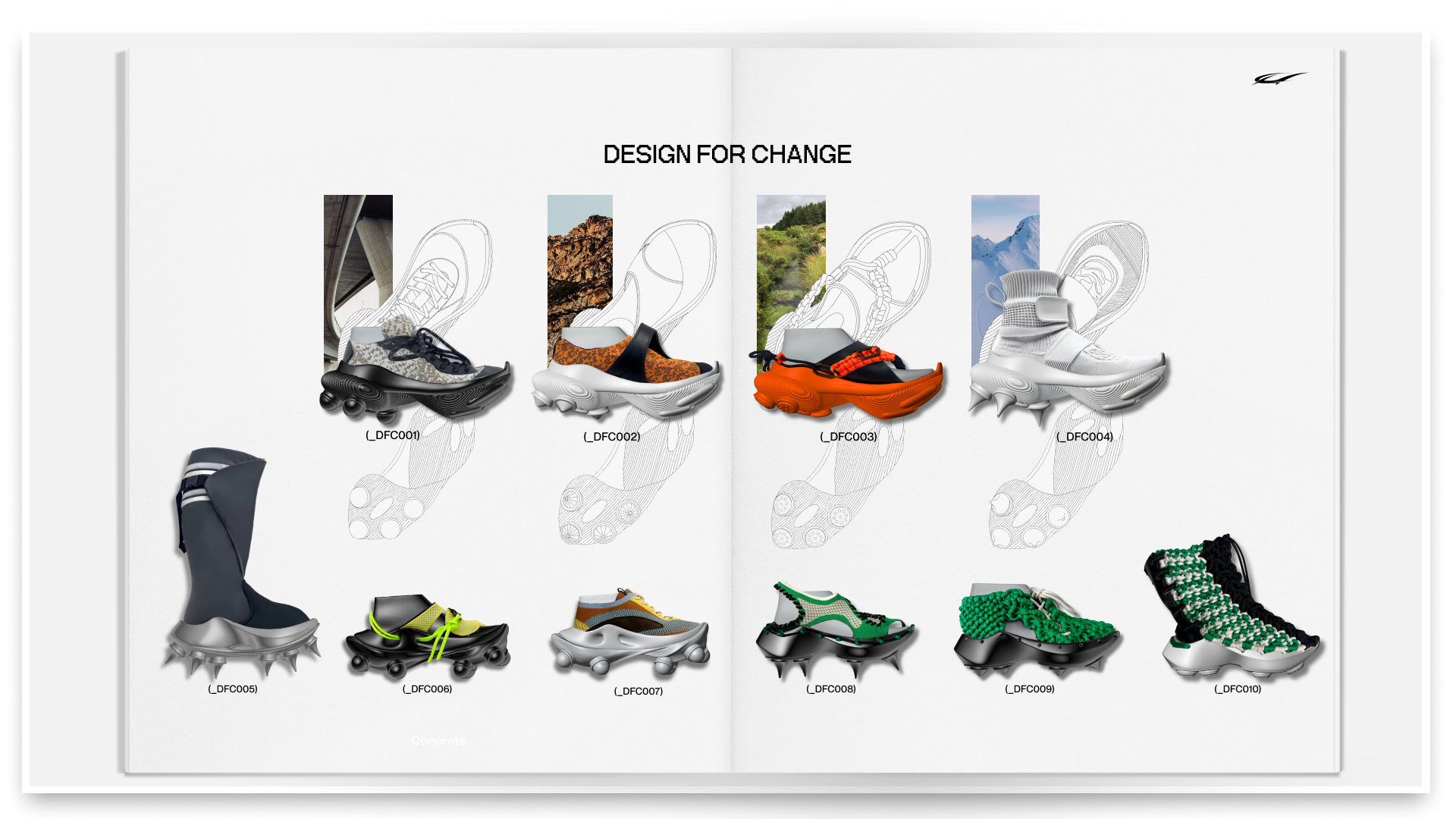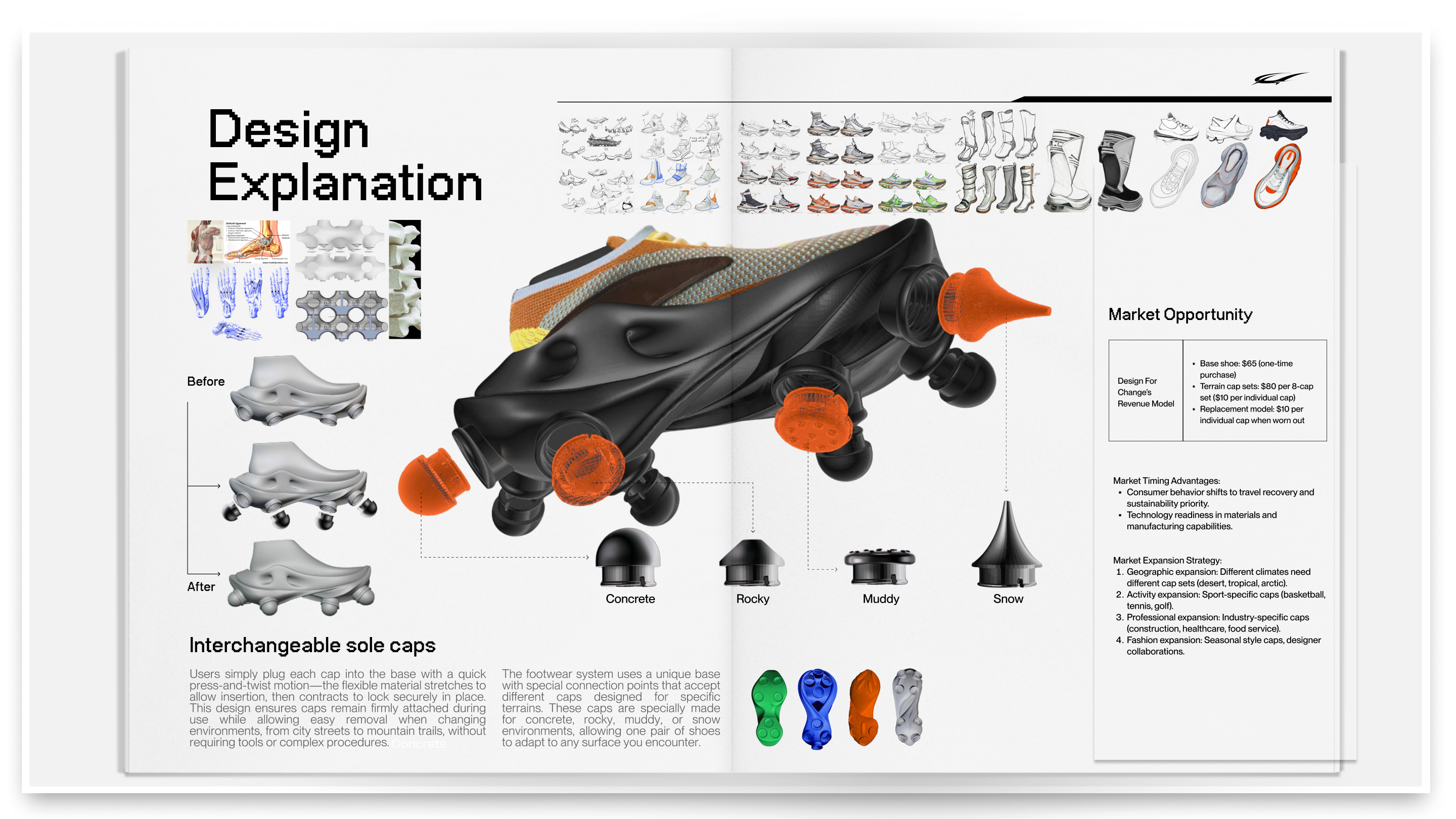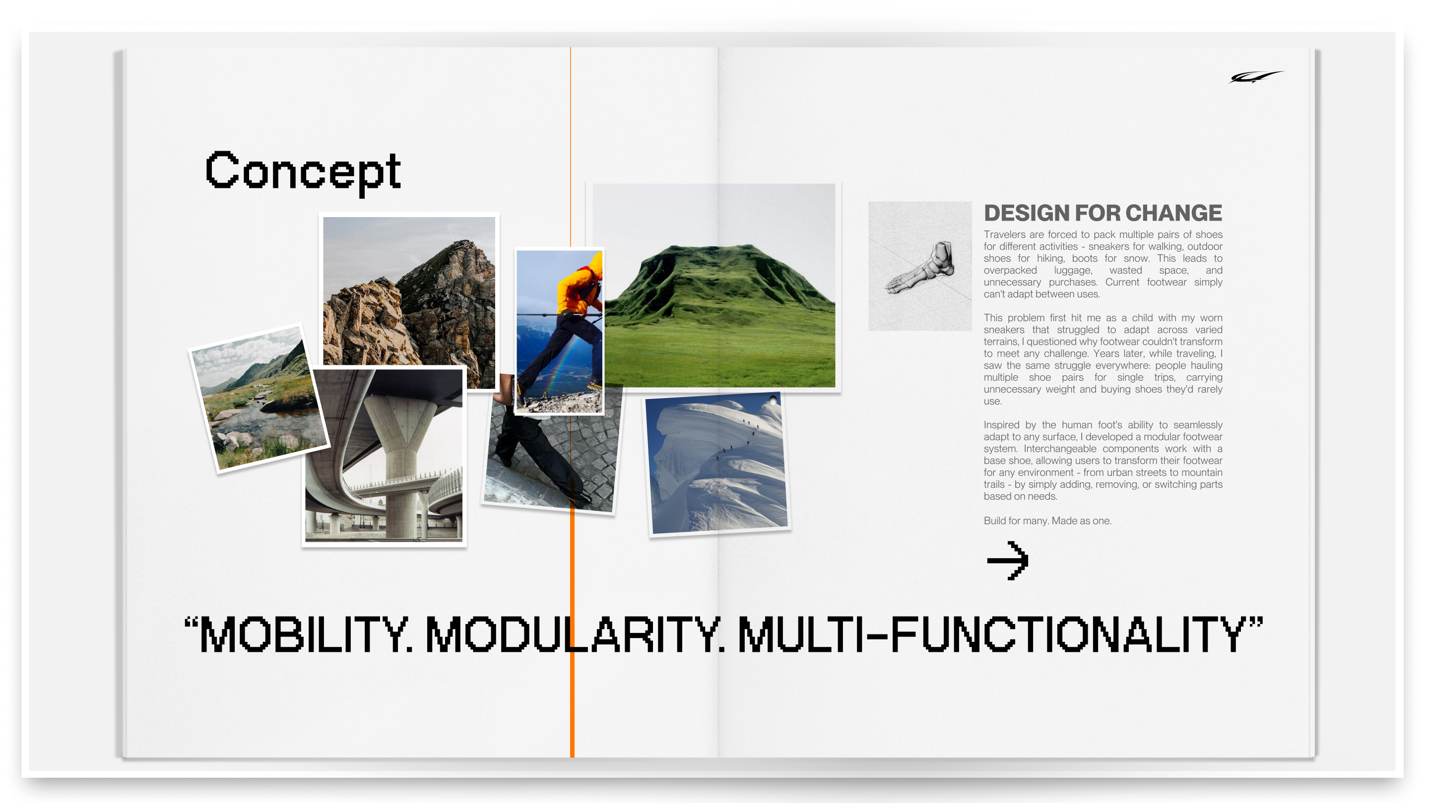 Design For Change explore modular footwear systems that adapt to diverse environments through interchangeable components, transforming a single pair of shoes into a versatile solution for any challenge - just like how our feet naturally adapt to different terrains.
