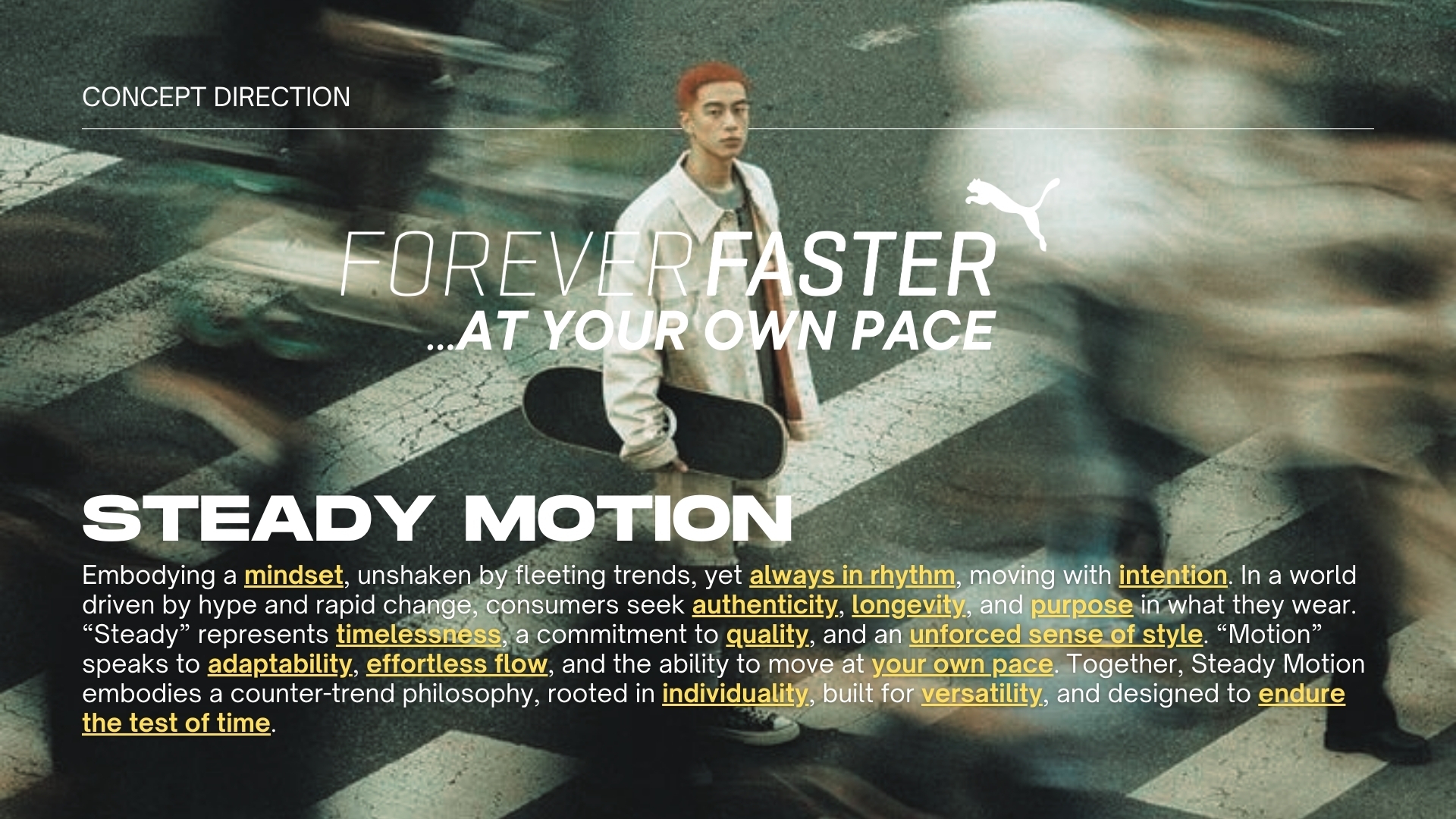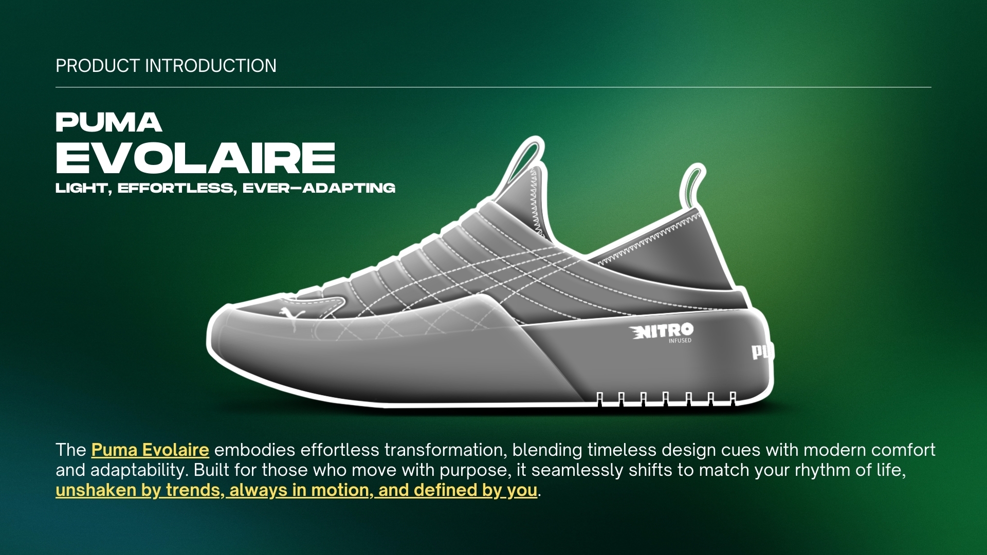 Created in collaboration with the Puma Sportstyle Team, the Evolaire is a multi-functional slip-on sneaker that embodies the concept of "Steady Motion: Forever Faster…At Your Own Pace." Its collapsible tongue and heel enable 3 wear modes, shifting seamlessly between casual ease and secure lockdown. Informed by real insights from real people, Evolaire blends Puma heritage cues with modern comfort, empowering wearers to move at their own pace. Unshaken by trends, always in motion, and defined by the individual, it delivers effortless versatility for every moment.